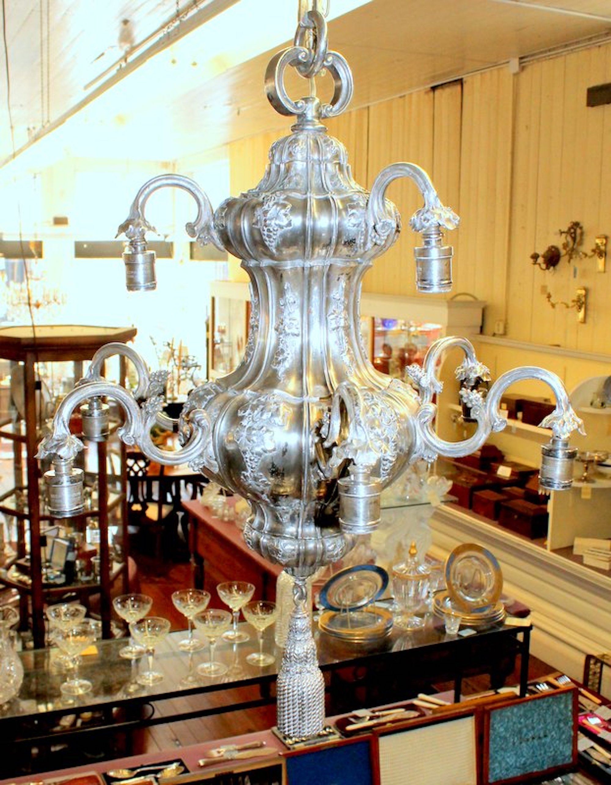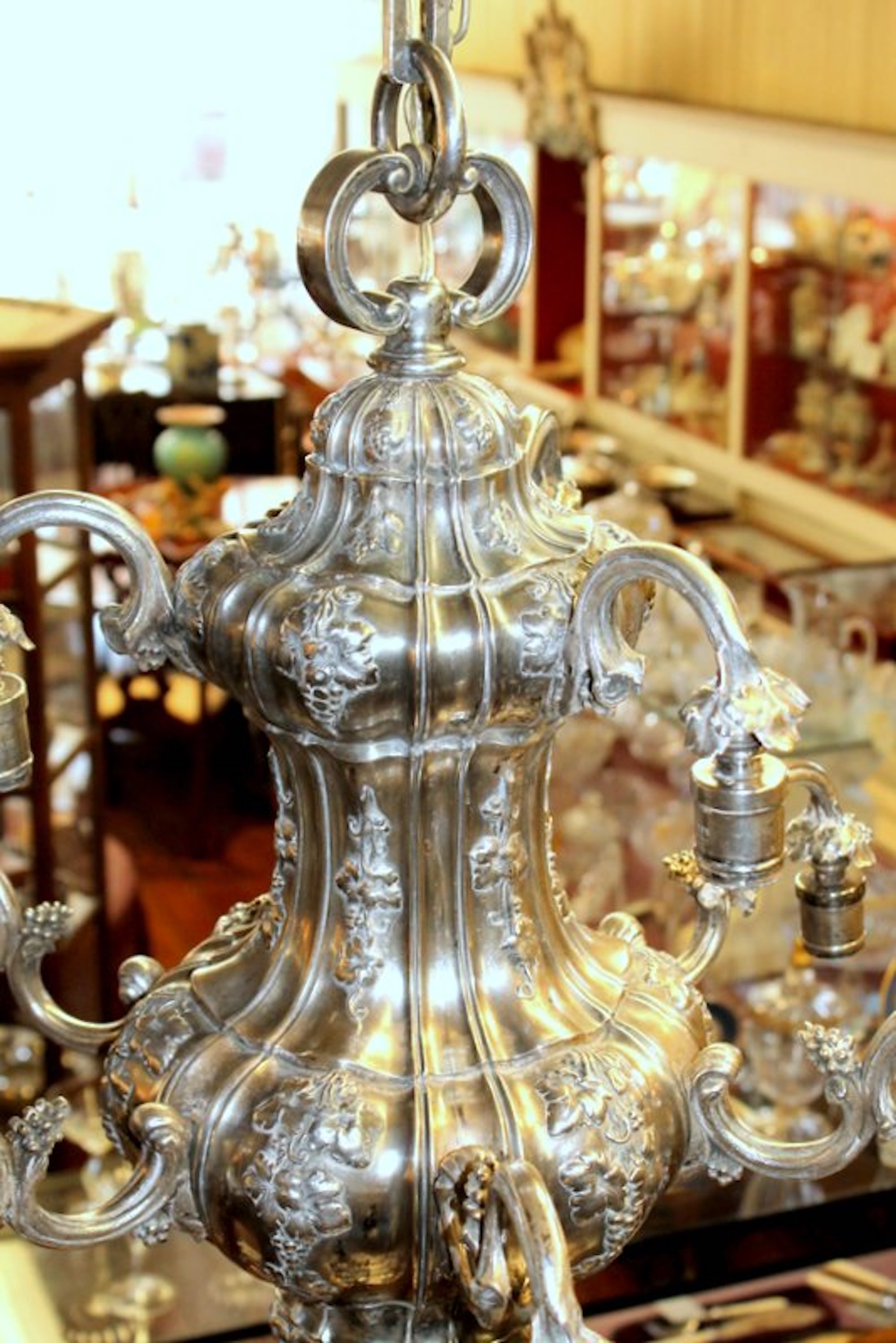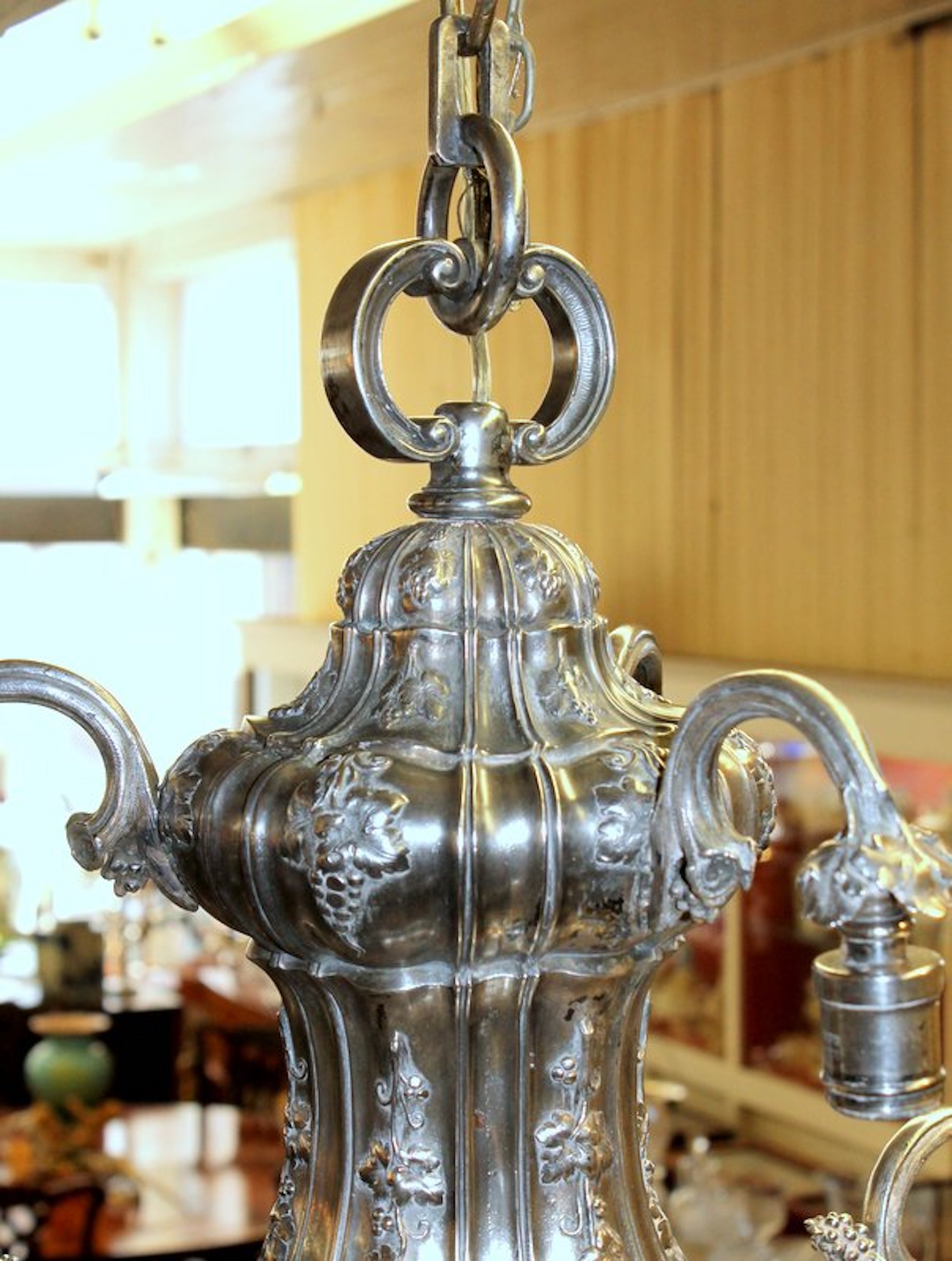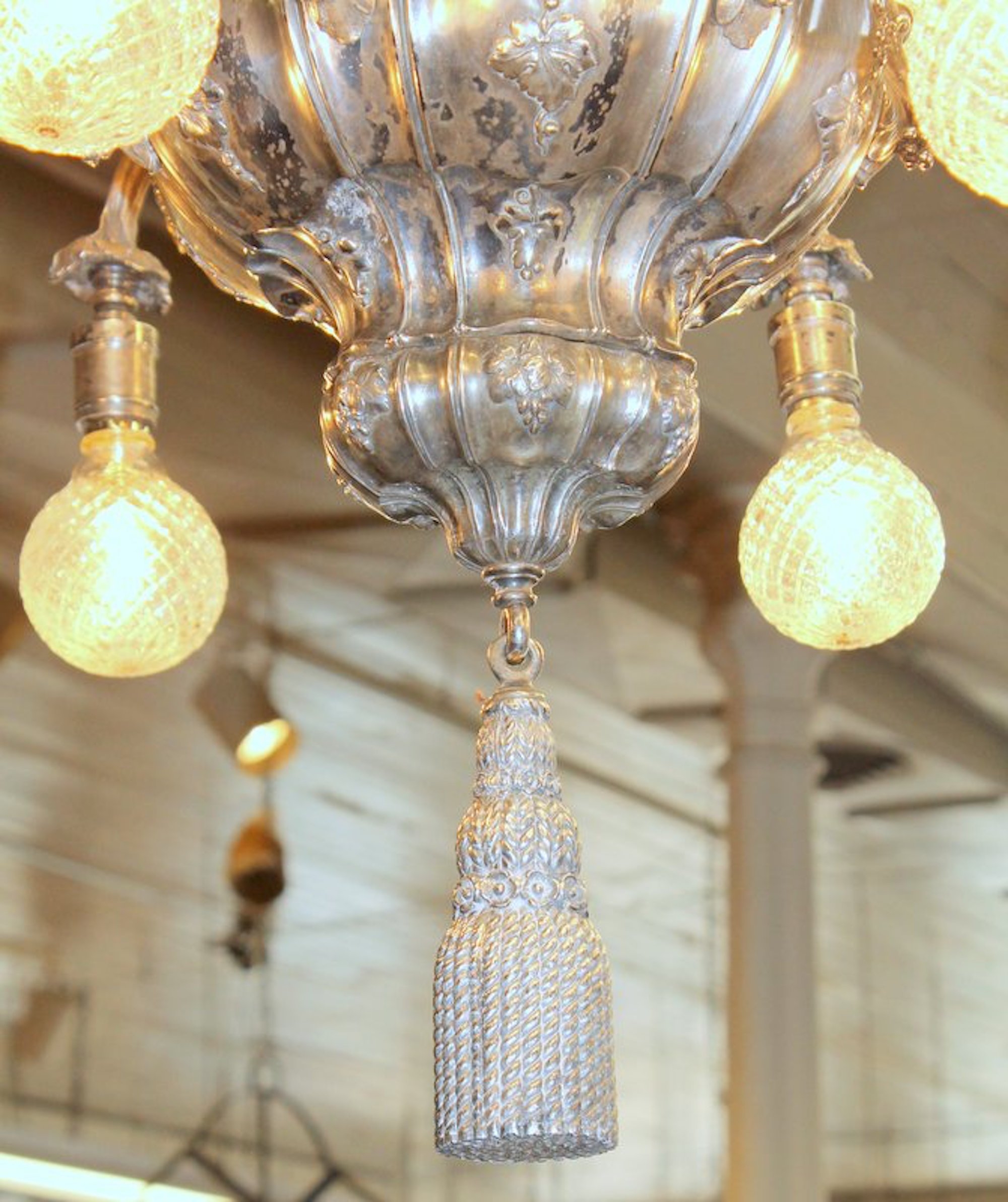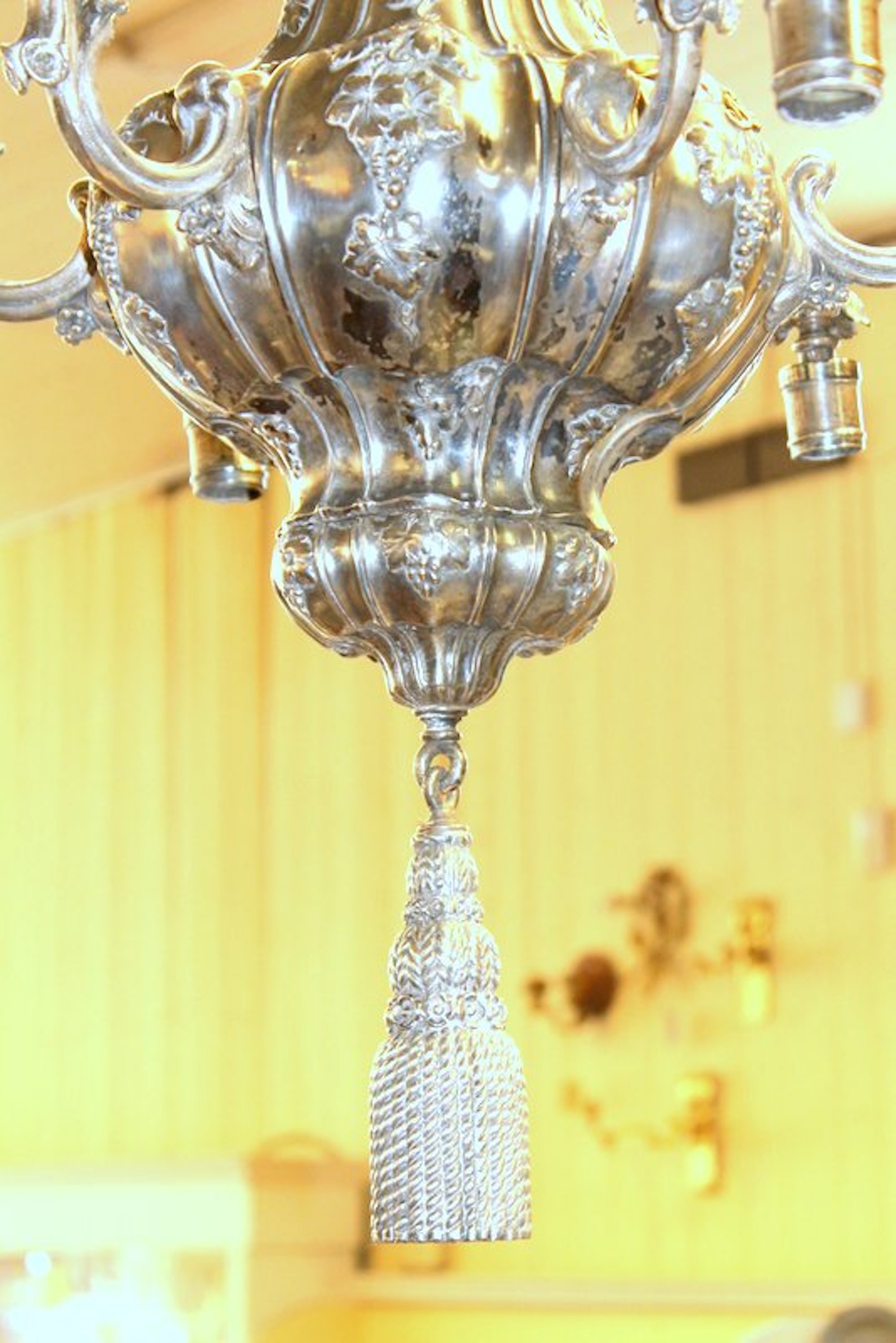 Very Fine and Rare E.F. Caldwell Antique American Silver-plate Bronze Nine Light, Two-Tier Pear Shape, Grape Motif Chandelier with Original Canopy and Chain