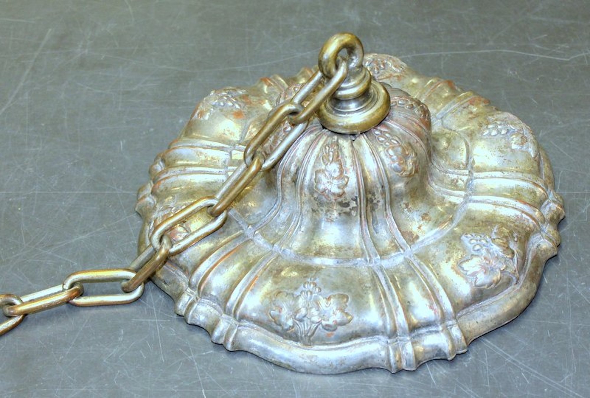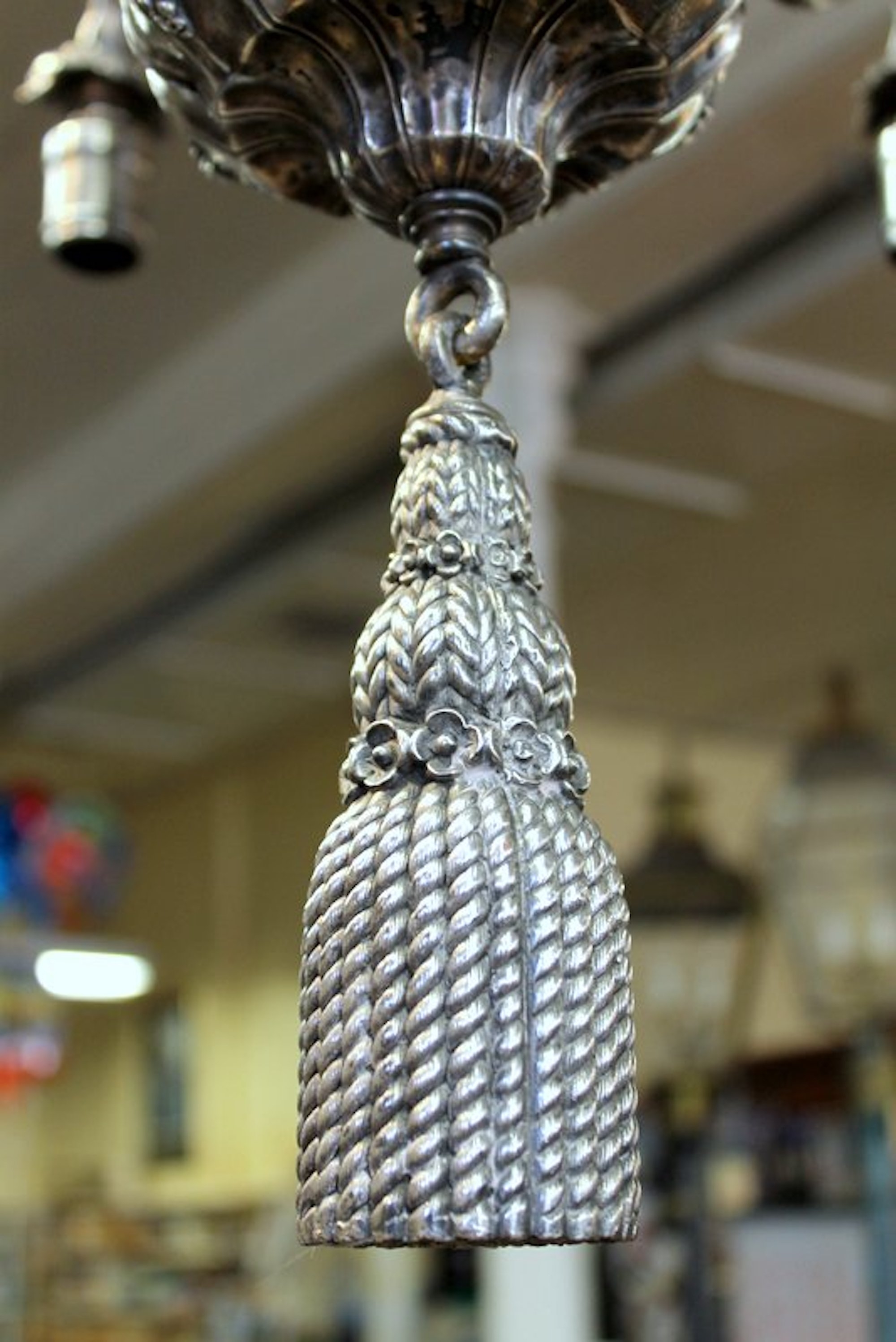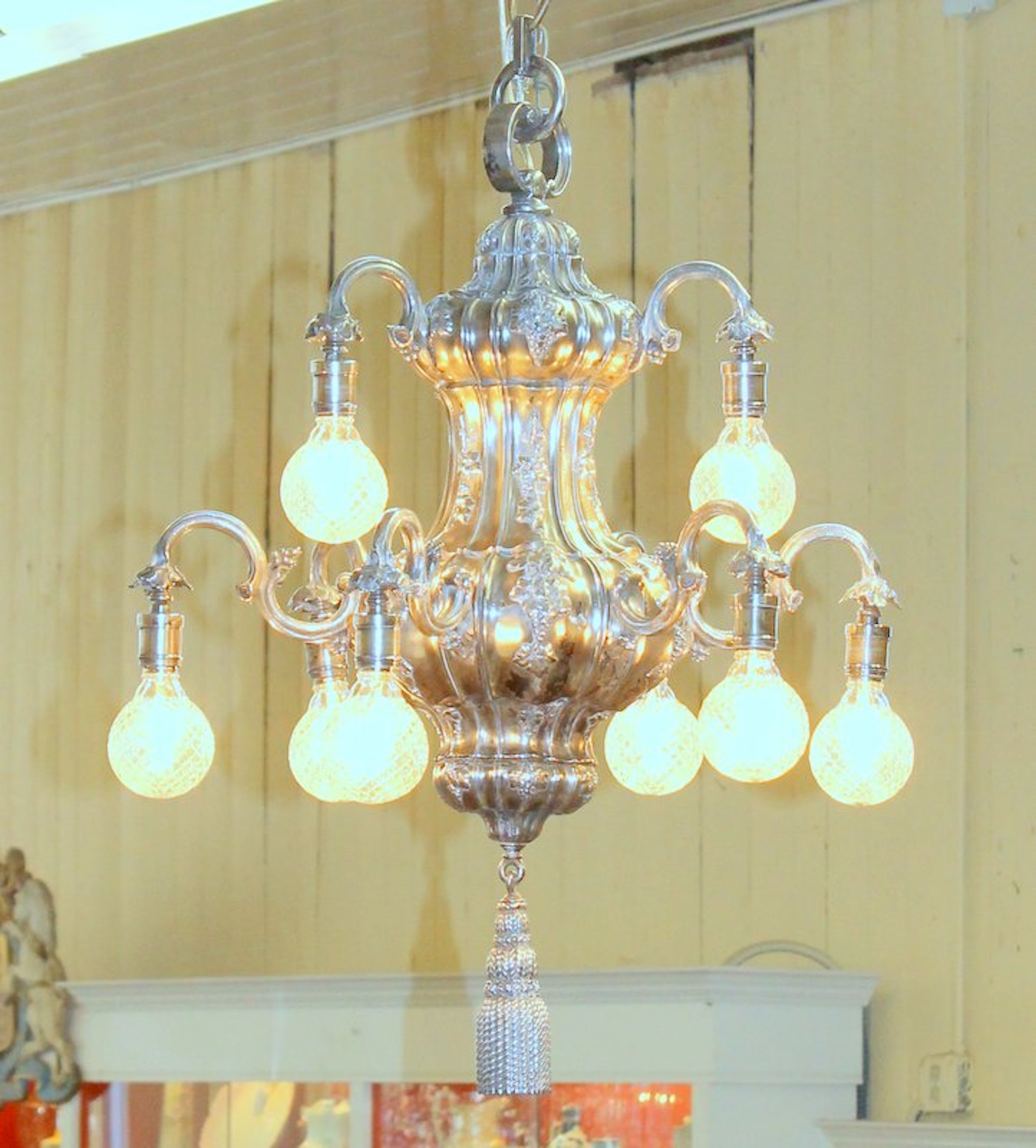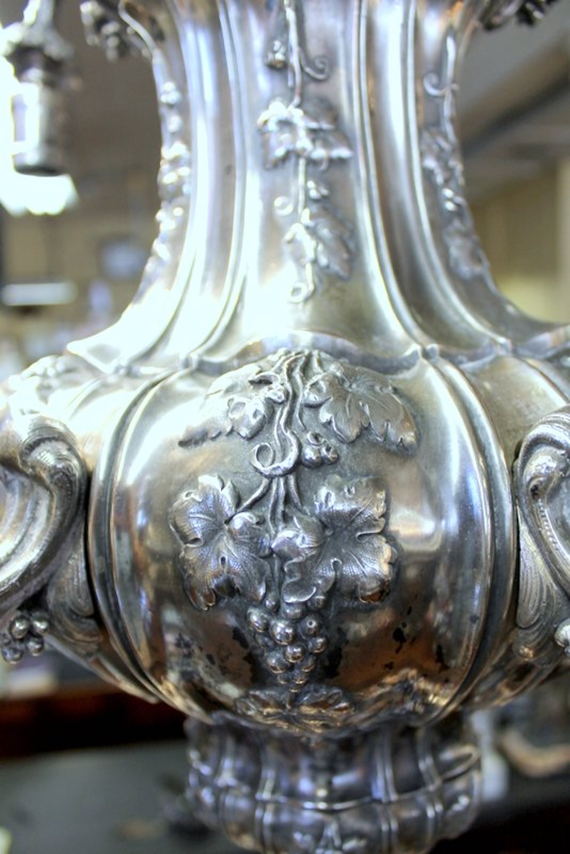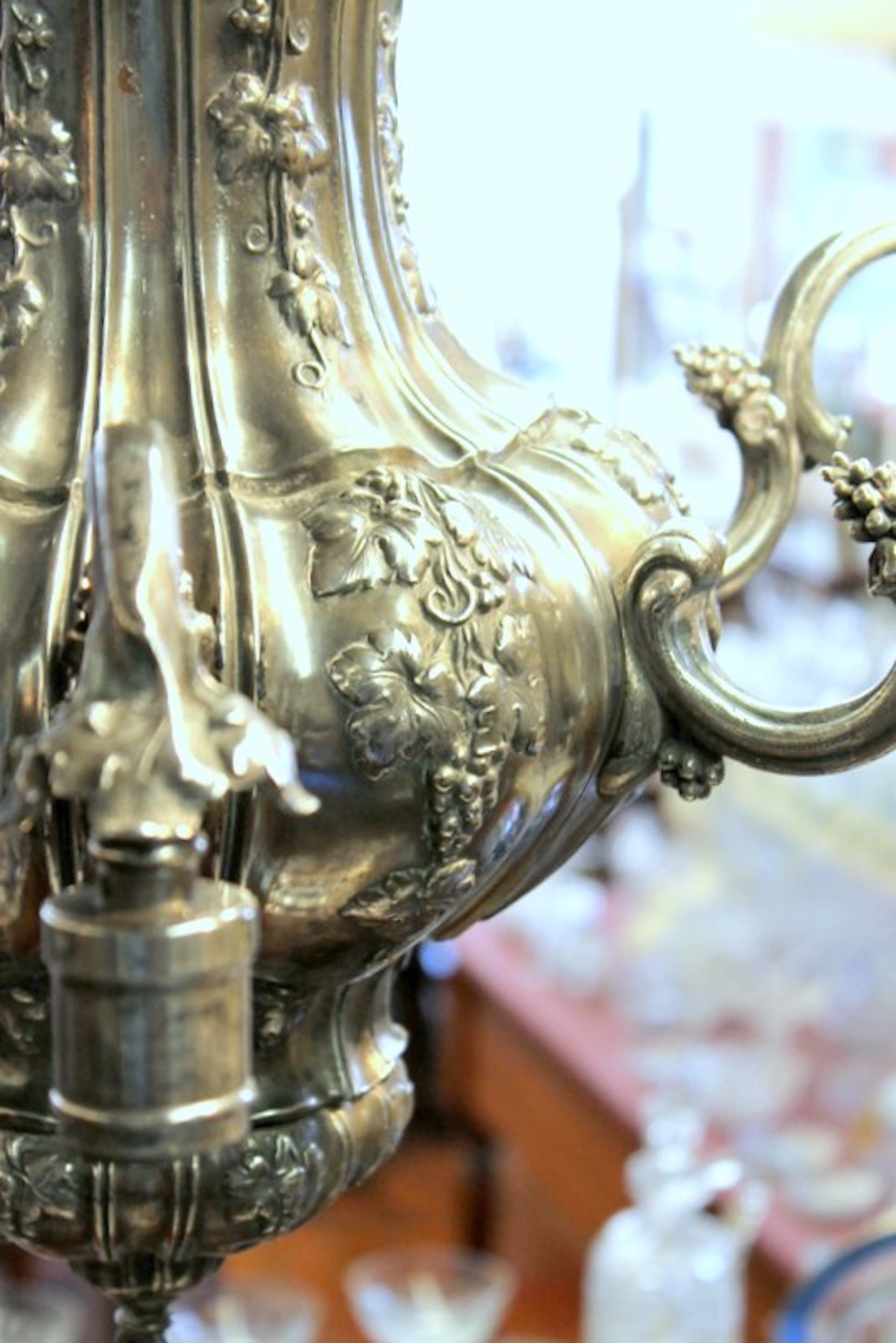 Very Fine and Rare E.F. Caldwell Antique American Silver-plate Bronze Nine Light, Two-Tier Pear Shape, Grape Motif Chandelier with Original Canopy and Chain