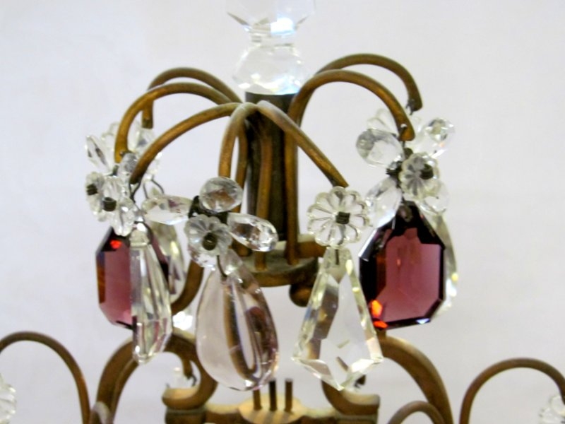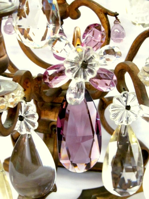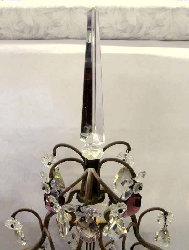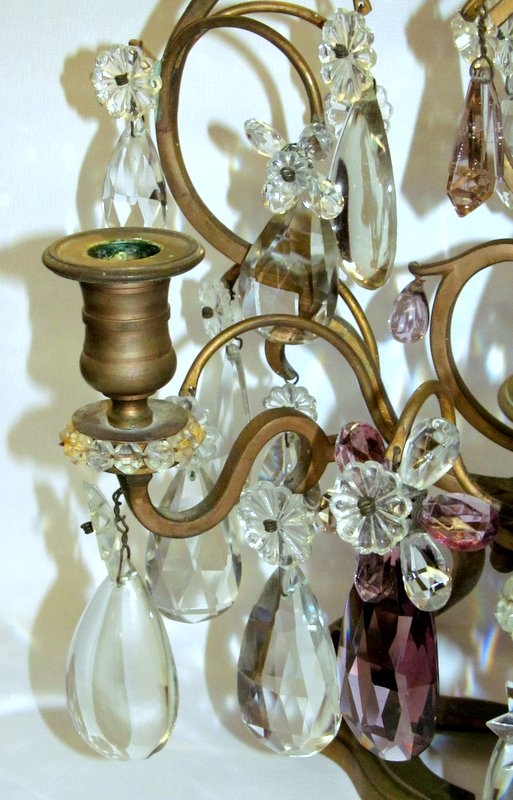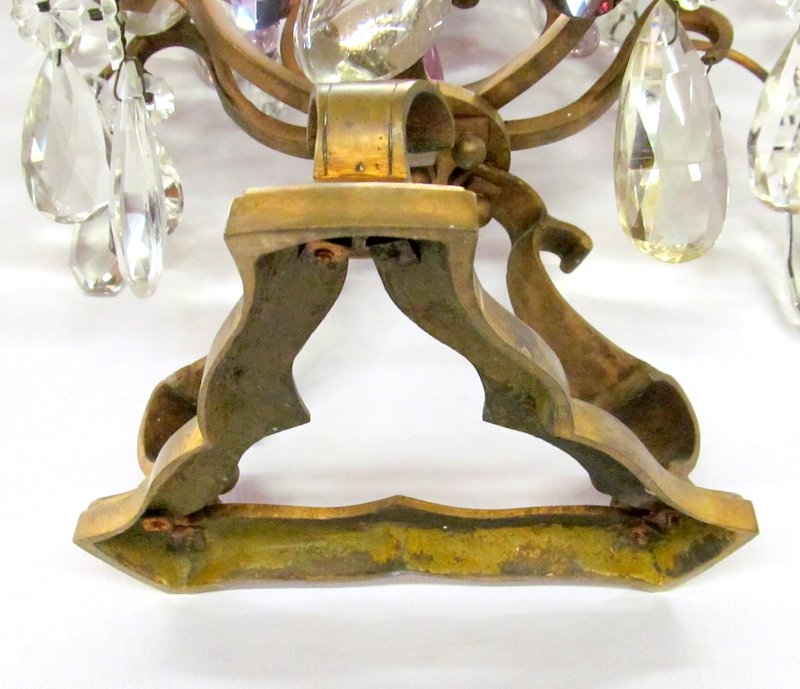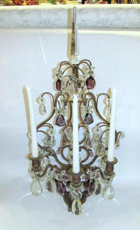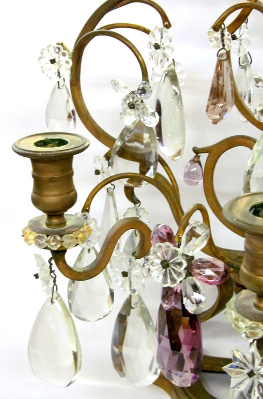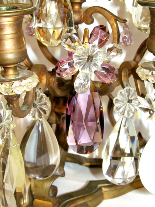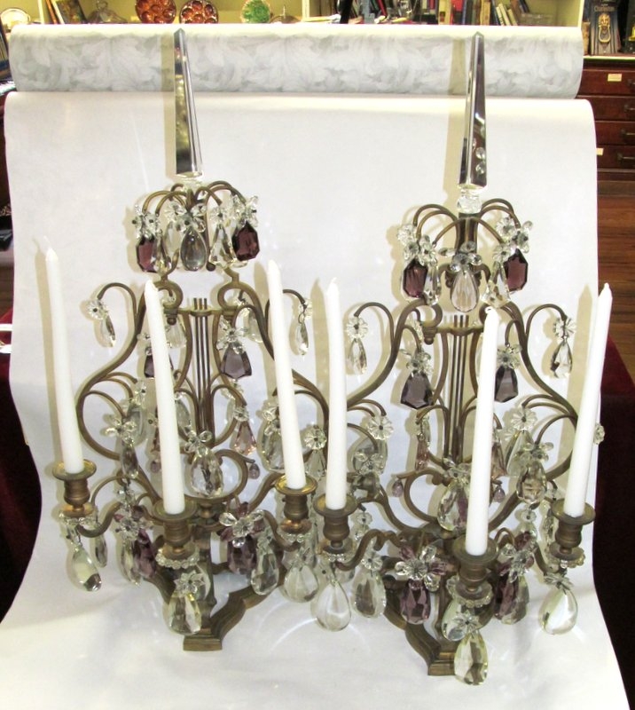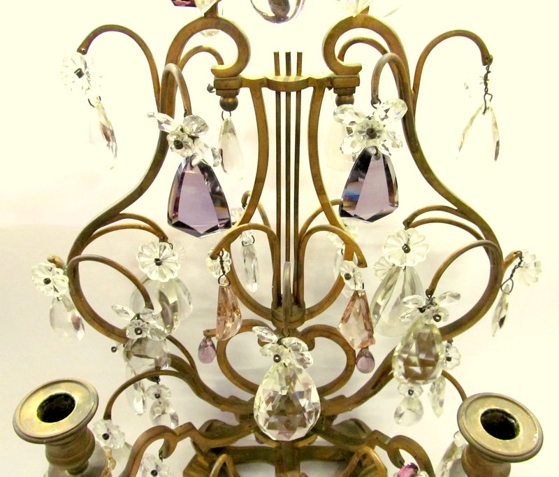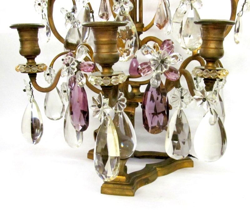 Pair of Fabulous Quality Antique French Ormolu (gilt brass) and cut crystal 3-light candelabra with clear and amethyst prisma