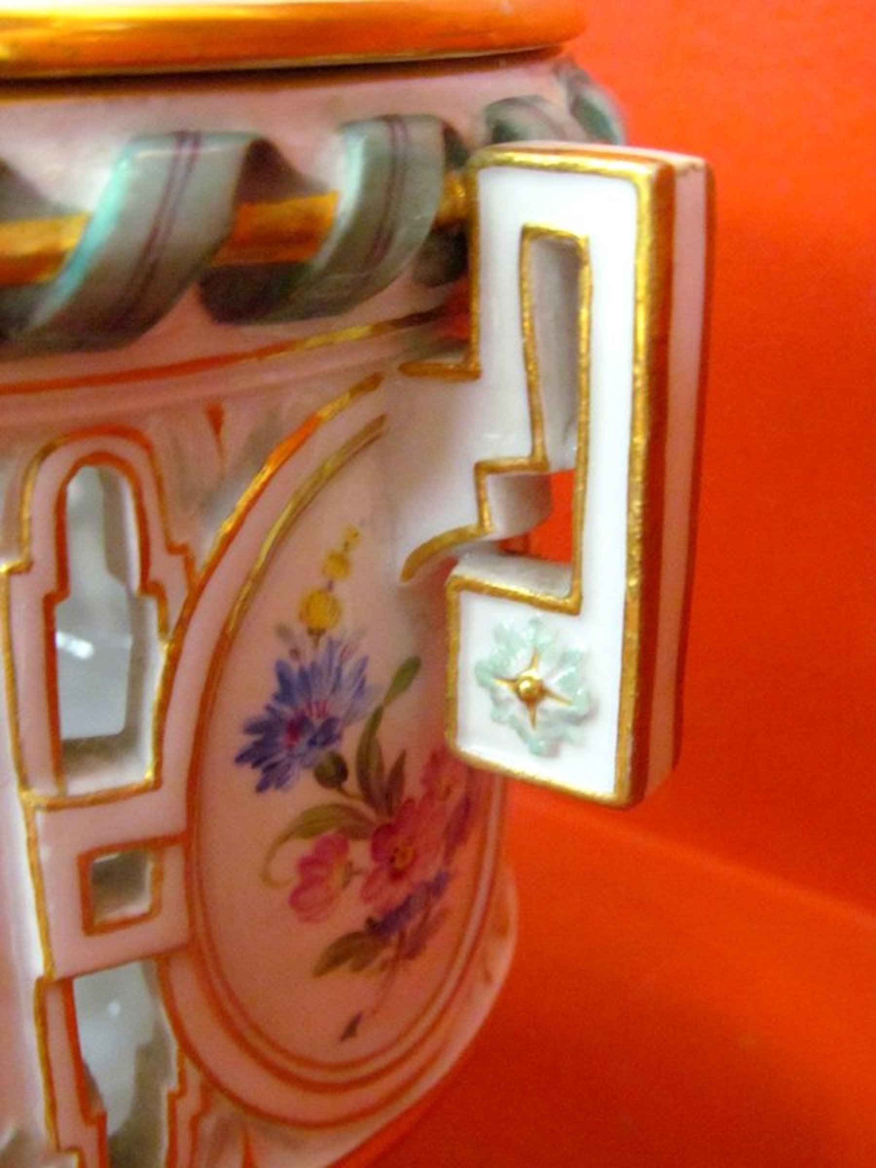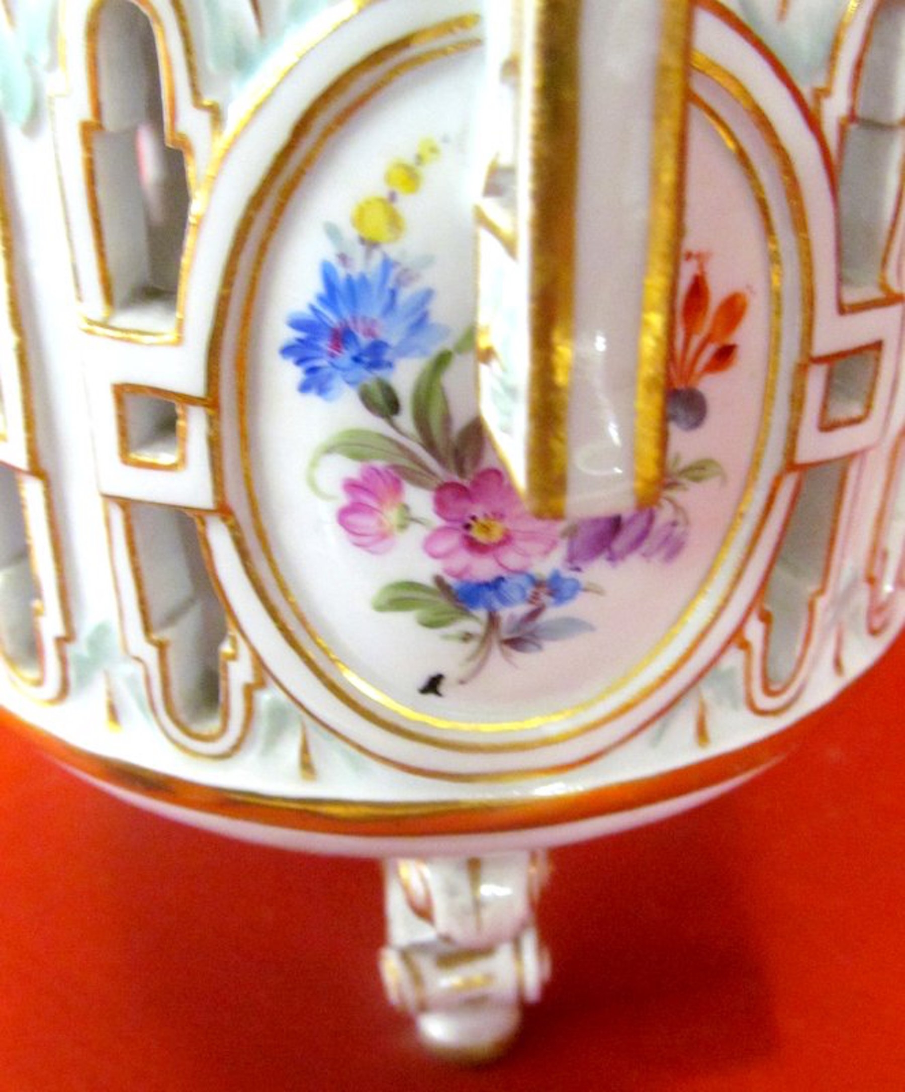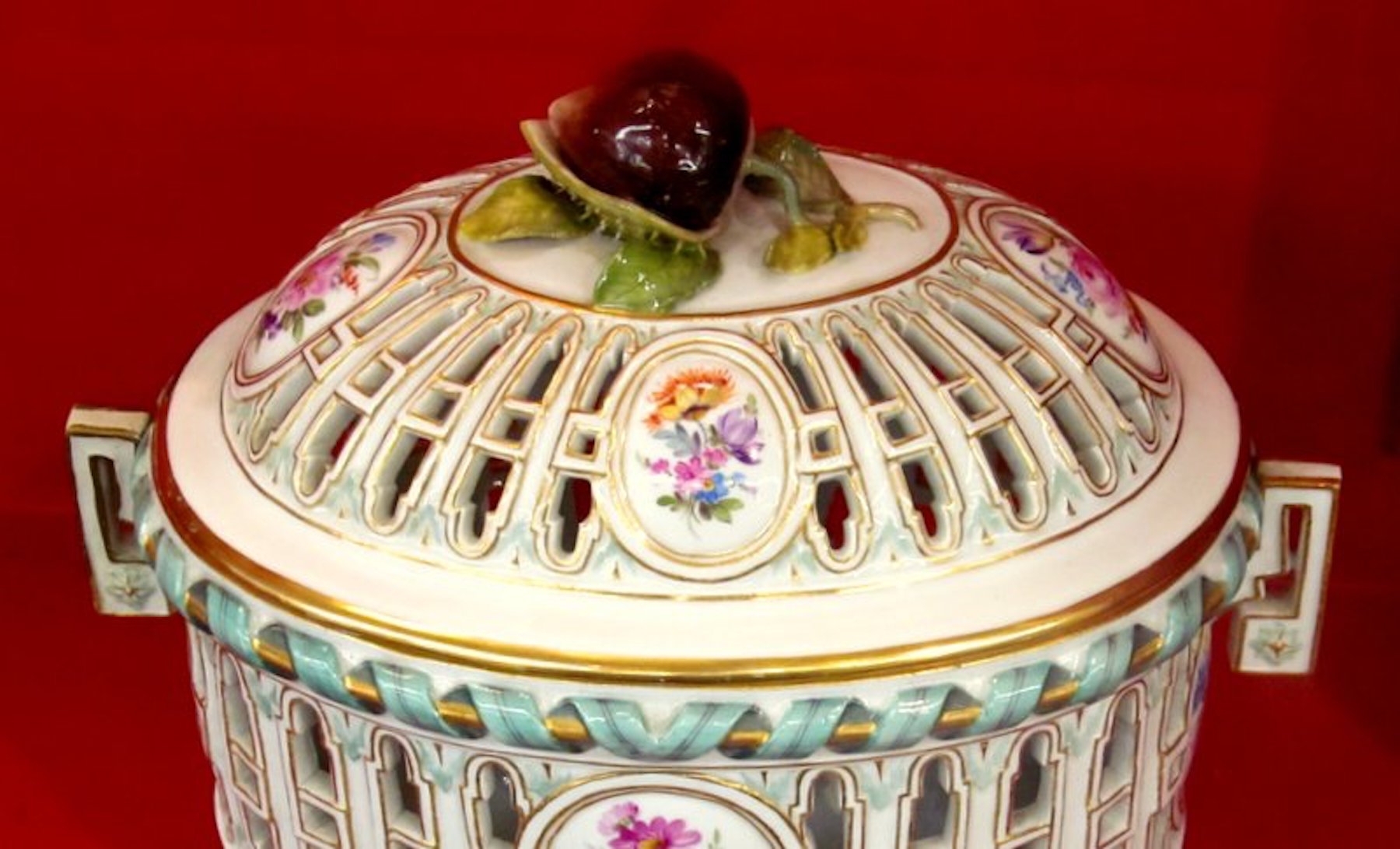 Please note the exquisite hand painted details throughout, including the reticulated body and lid, the marvelous chestnut-shaped finial with its prickly exterior and the exquisitely painted floral sprays throughout.  There is evidence of an old professional restoration to one handle and to the edge of the lid and this “as found” condition is reflected in the price.