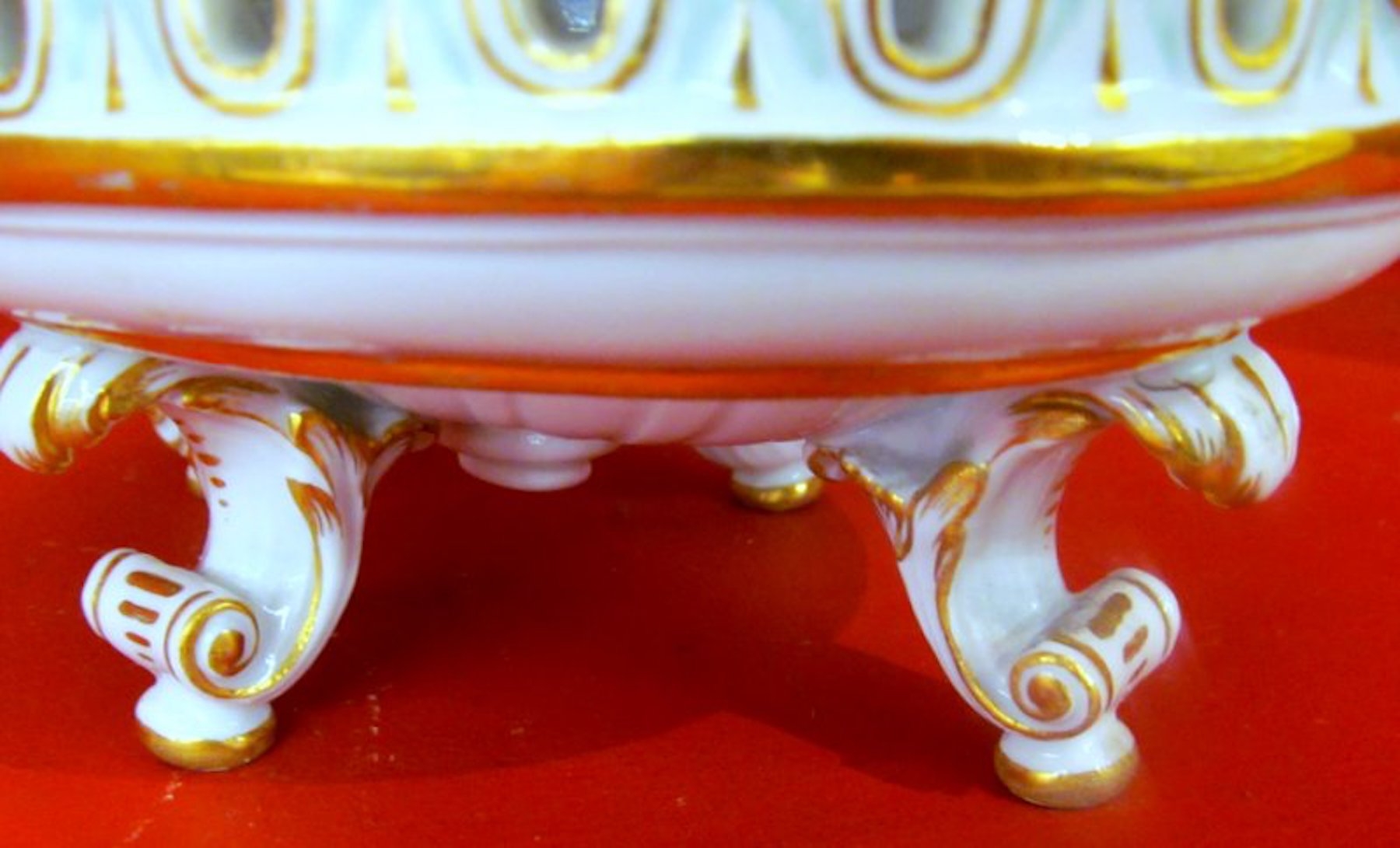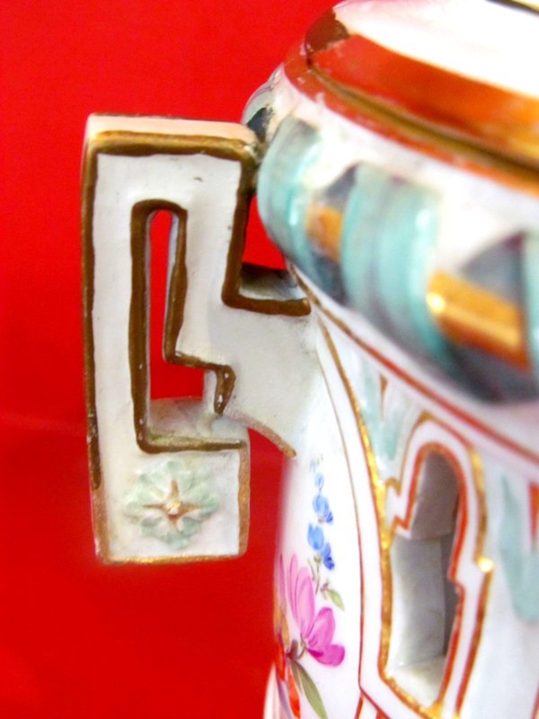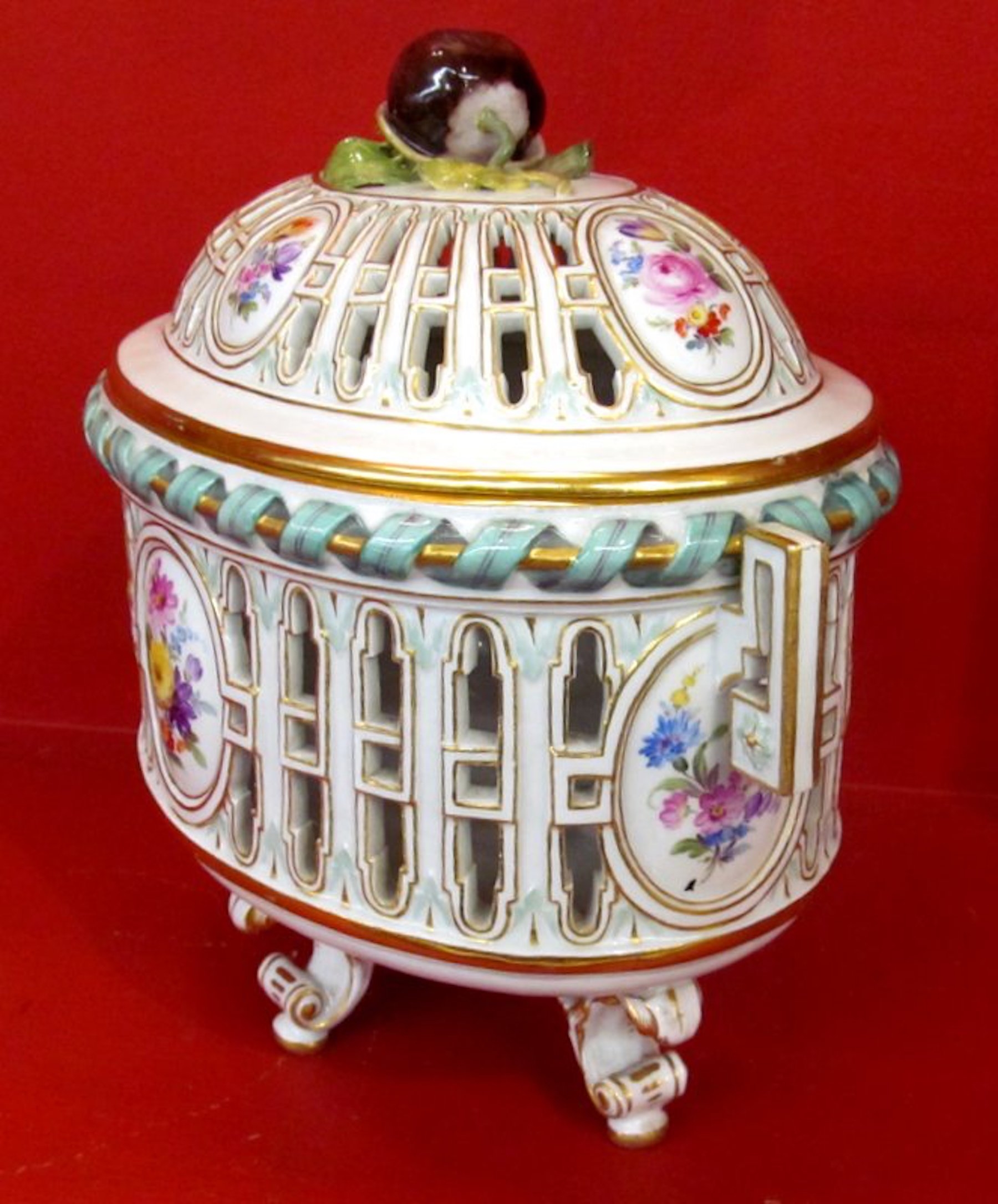 Please note the exquisite hand painted details throughout, including the reticulated body and lid, the marvelous chestnut-shaped finial with its prickly exterior and the exquisitely painted floral sprays throughout.  There is evidence of an old professional restoration to one handle and to the edge of the lid and this “as found” condition is reflected in the price.