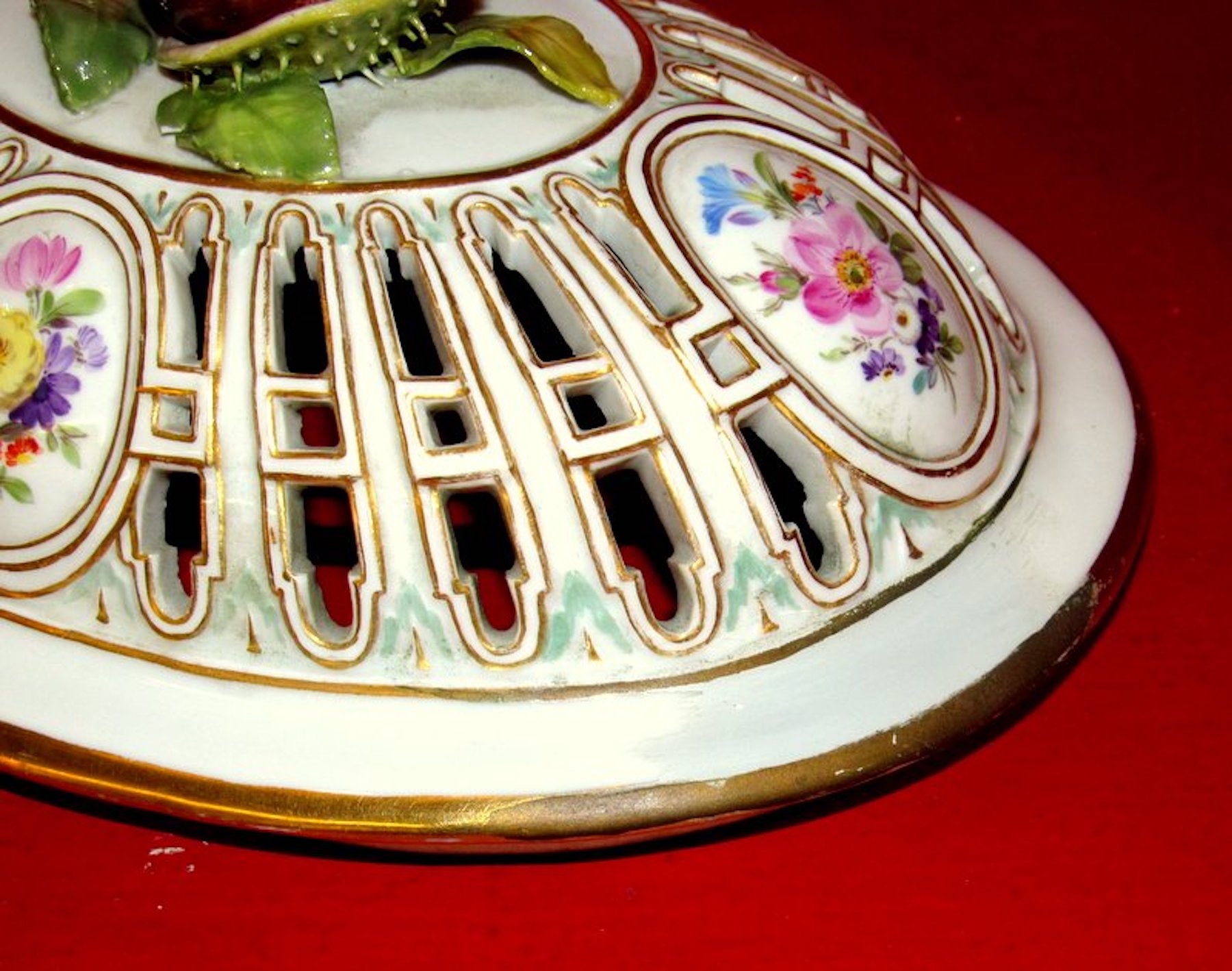 Exquisite Quality Rare and Important Antique Dresden/Meissen Hand Painted Porcelain Reticulated Body Chestnut Basket or Tureen with Superbly Formed Chestnut Shaped Finial