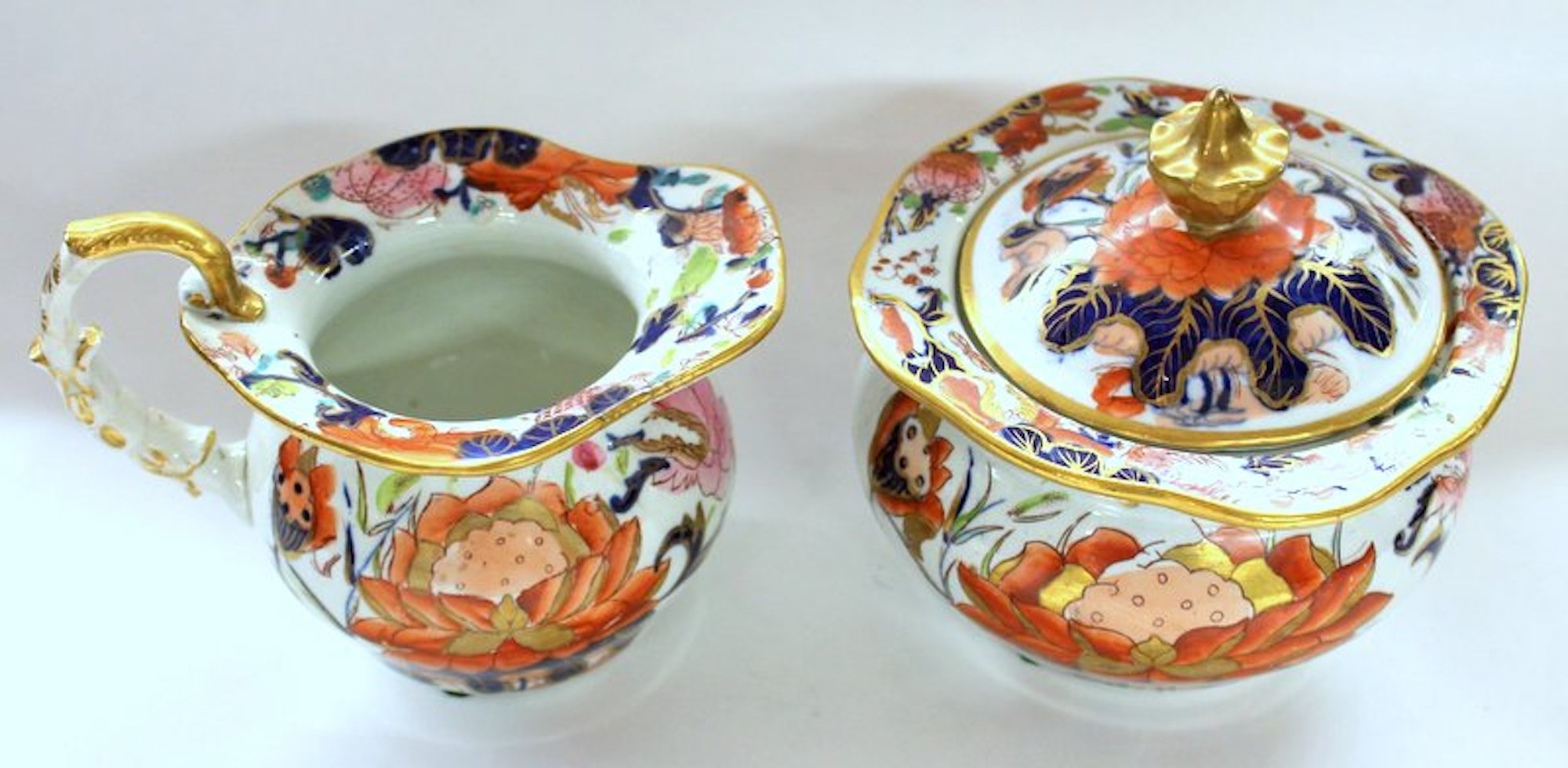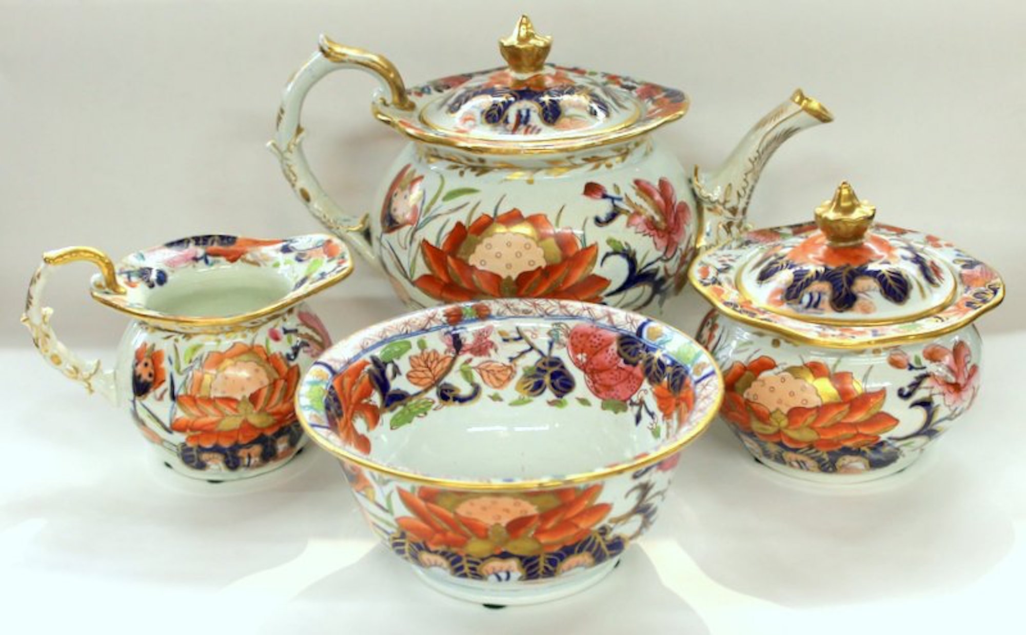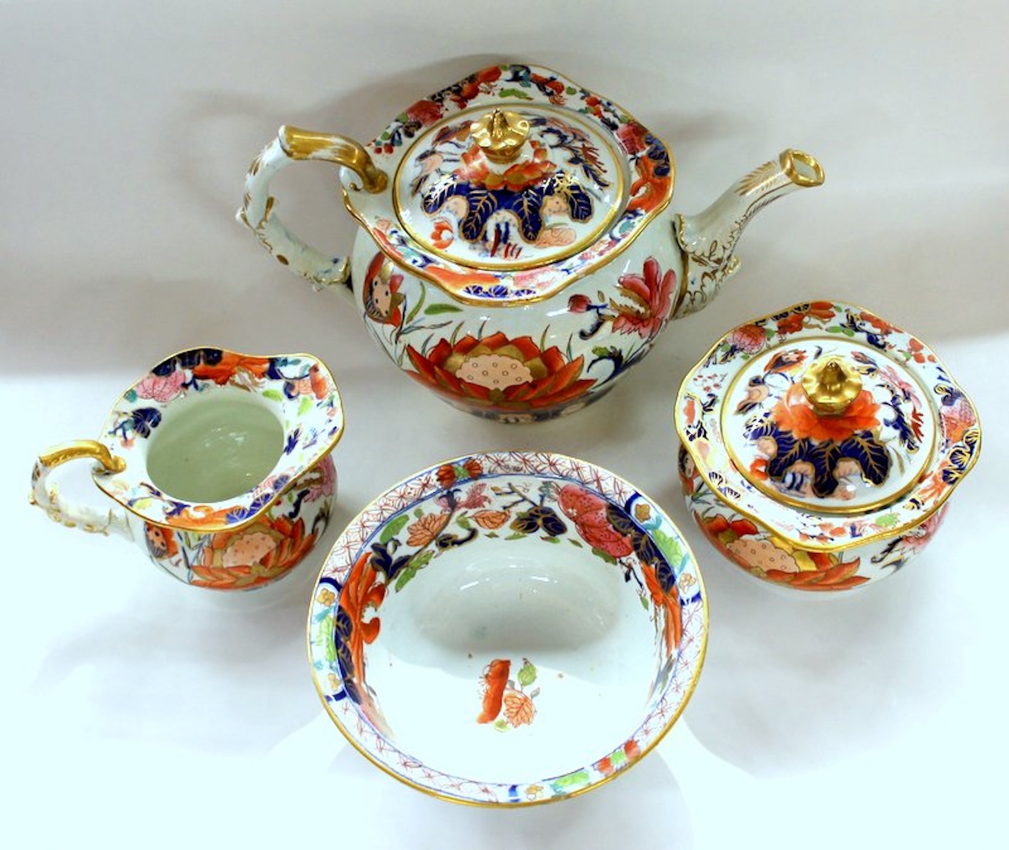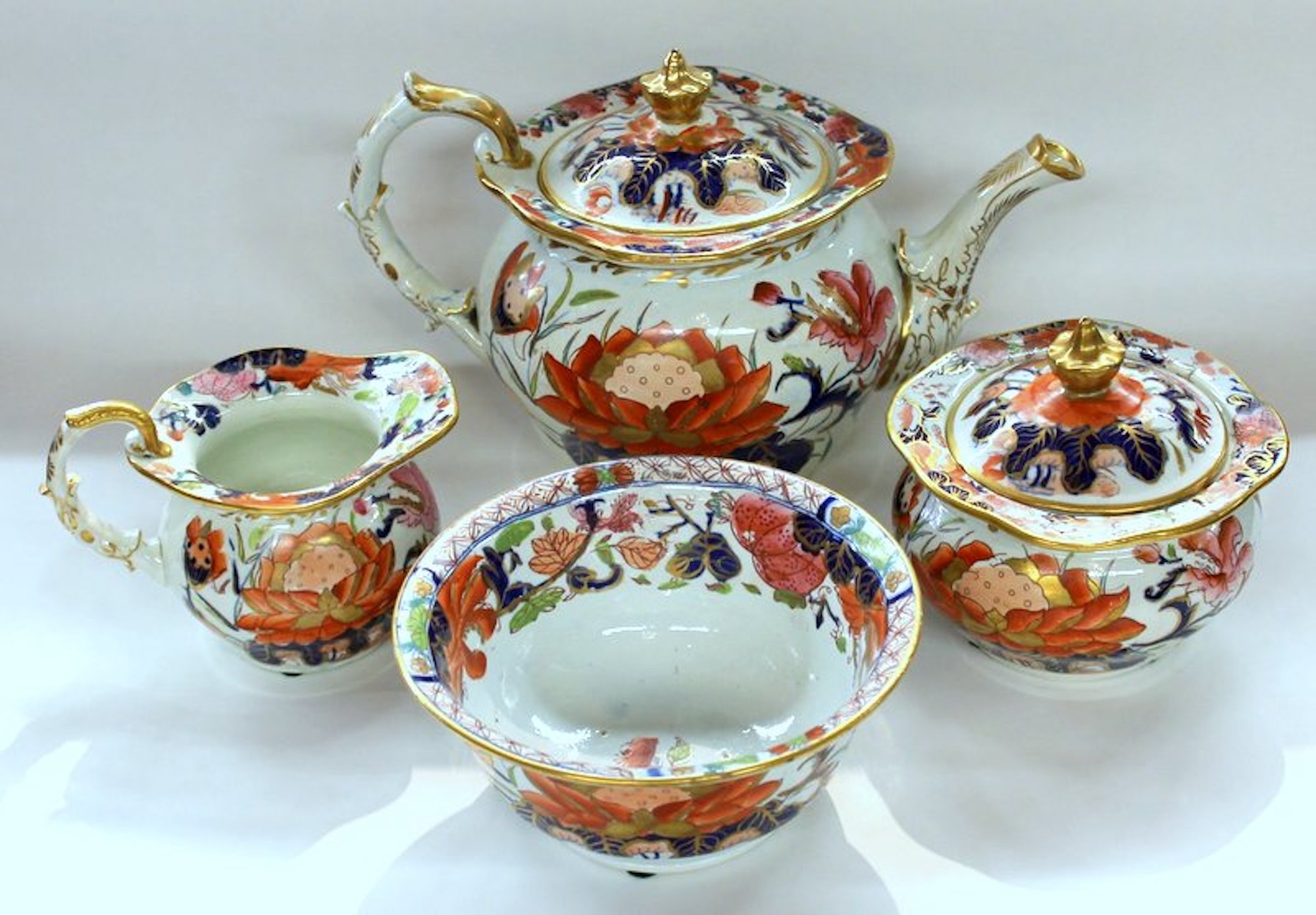 Rare and Important Antique English Mason’s Ironstone “Water Lily” Pattern Four Piece Tea Set including teapot, covered sugar, cream jug and waste bowl.