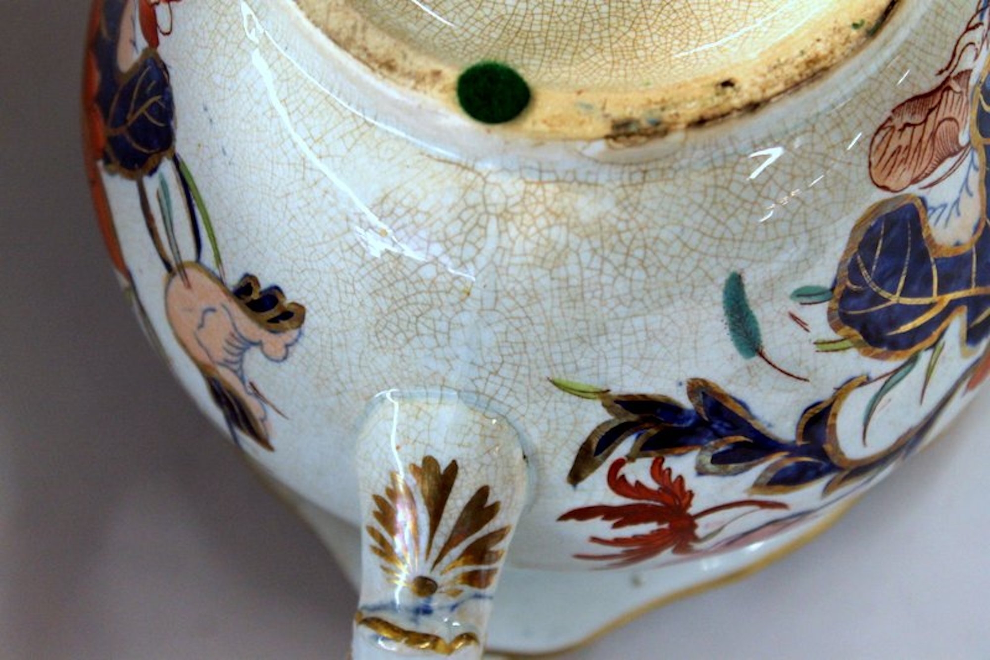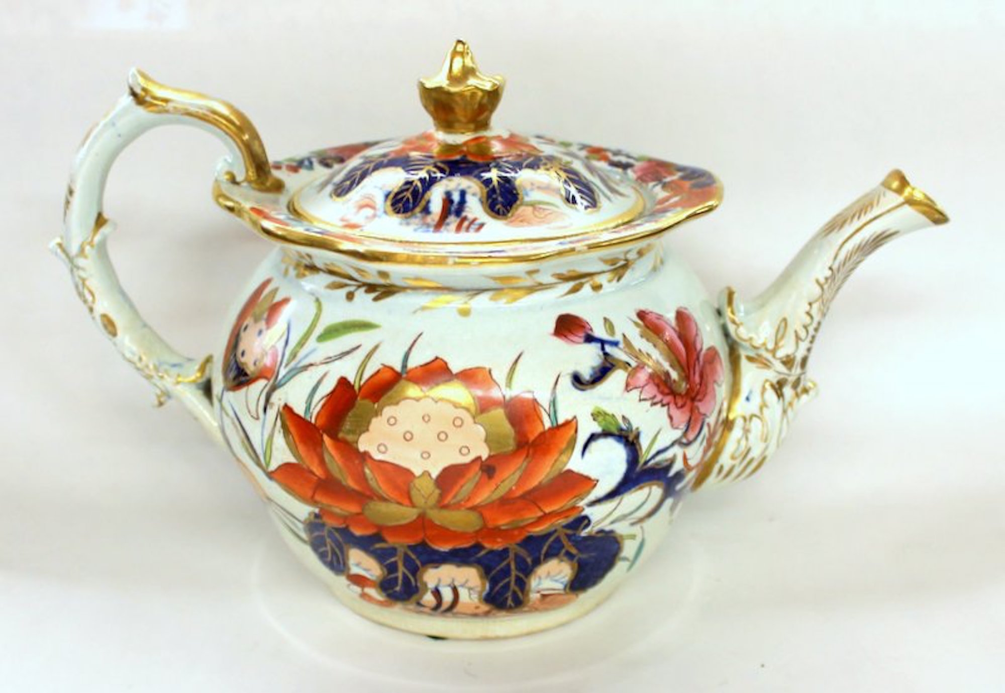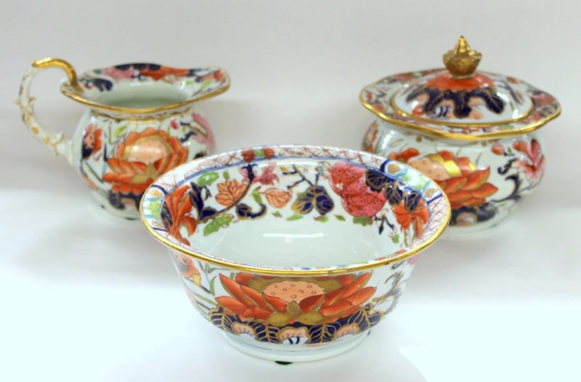 Rare and Important Antique English Mason’s Ironstone “Water Lily” Pattern Four Piece Tea Set including teapot, covered sugar, cream jug and waste bowl.