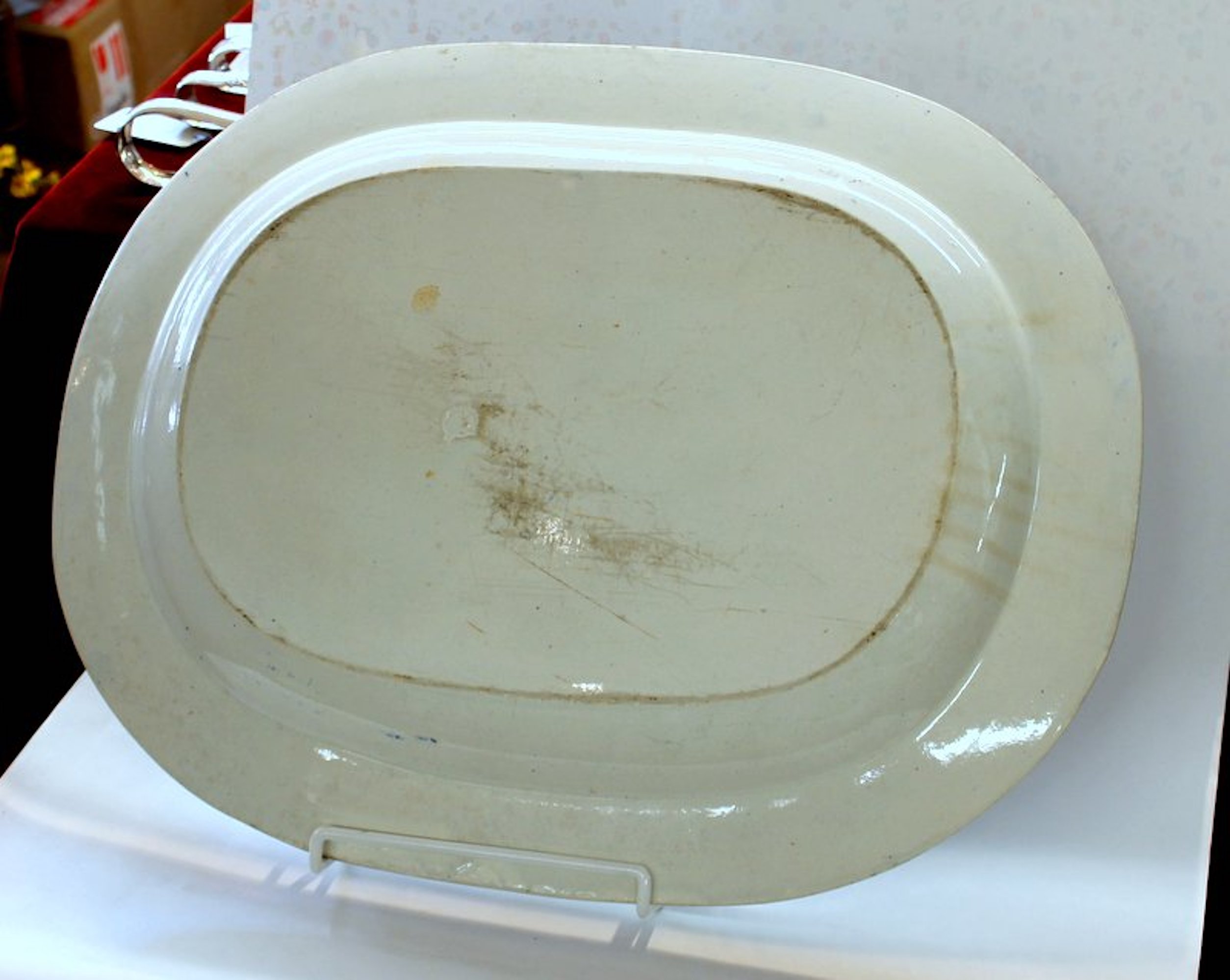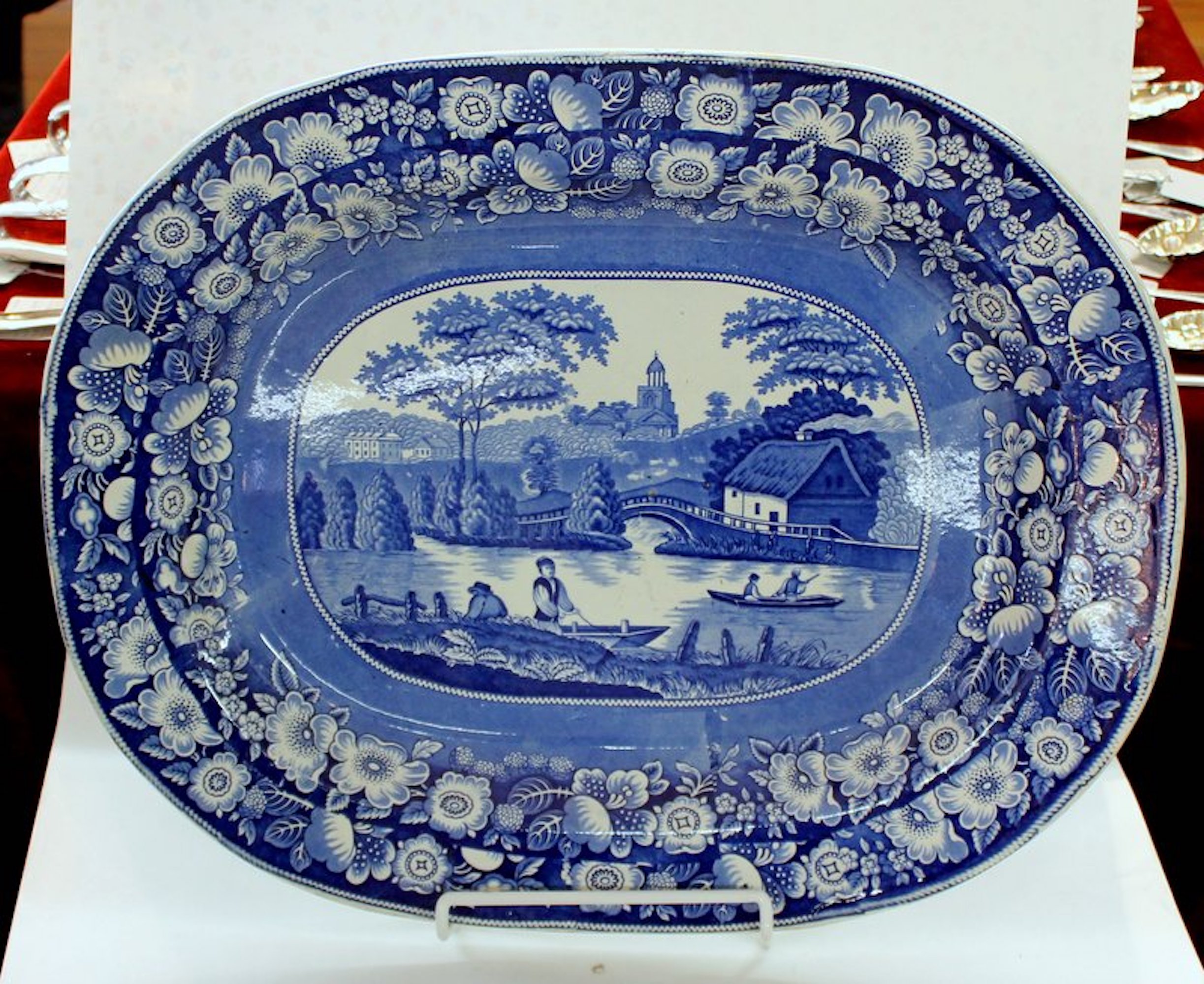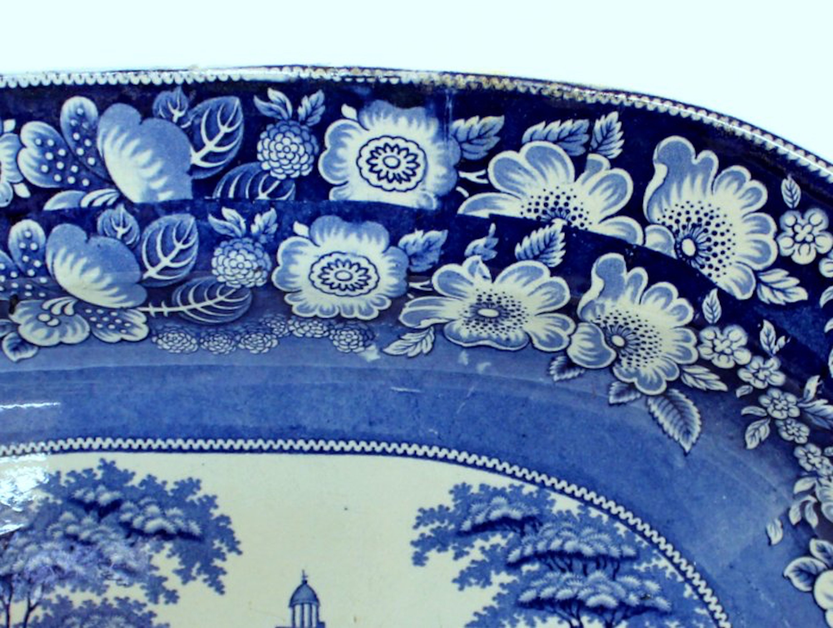 Extraordinarily fine and impressively Large Antique English Blue & White Scenic Transferware Ironstone Platter with unidentifiable “period” impressed makers mark (after exhaustive research in Godden’s and Miller’s books on transferware and ironstone/earthenware). This pattern is illustrated in Miller’s Encyclopedia of British Transfer-Printed Pottery Patterns, pg. 57 and is known as “Nuneham House – Oxforshire” and part of the “Rose Border Series”.