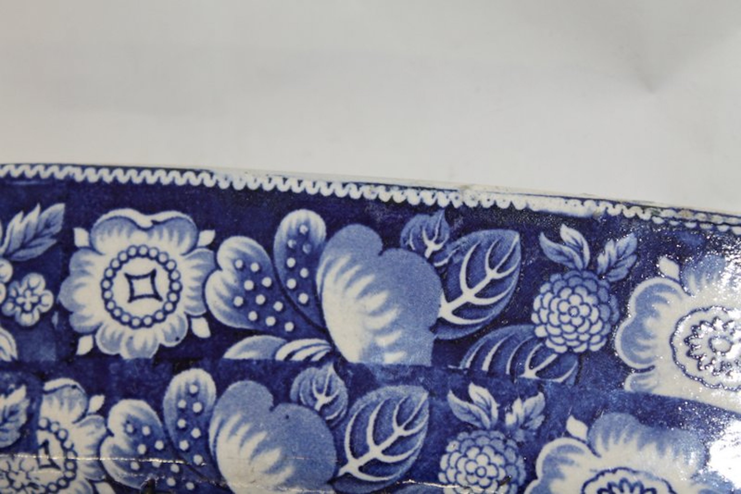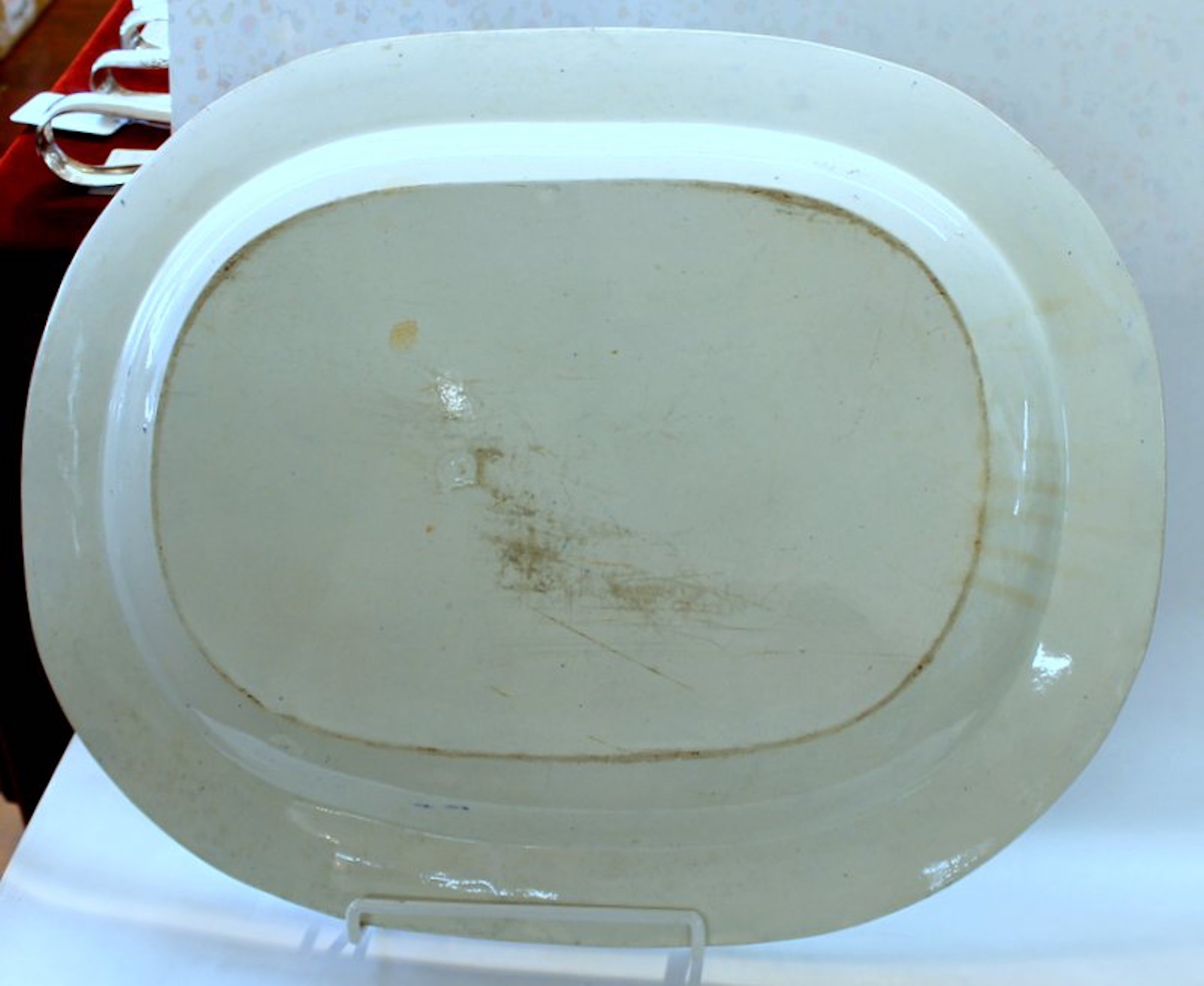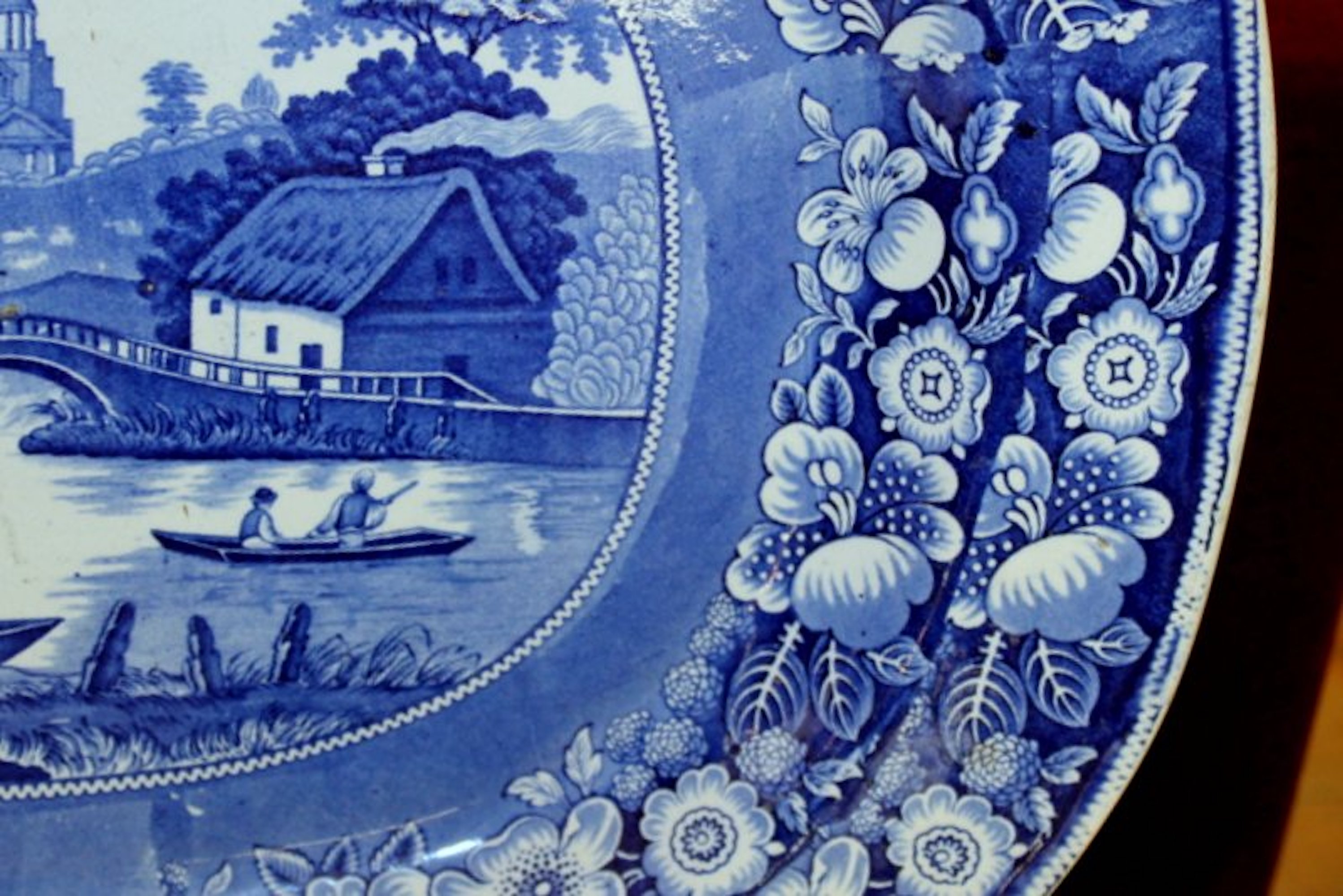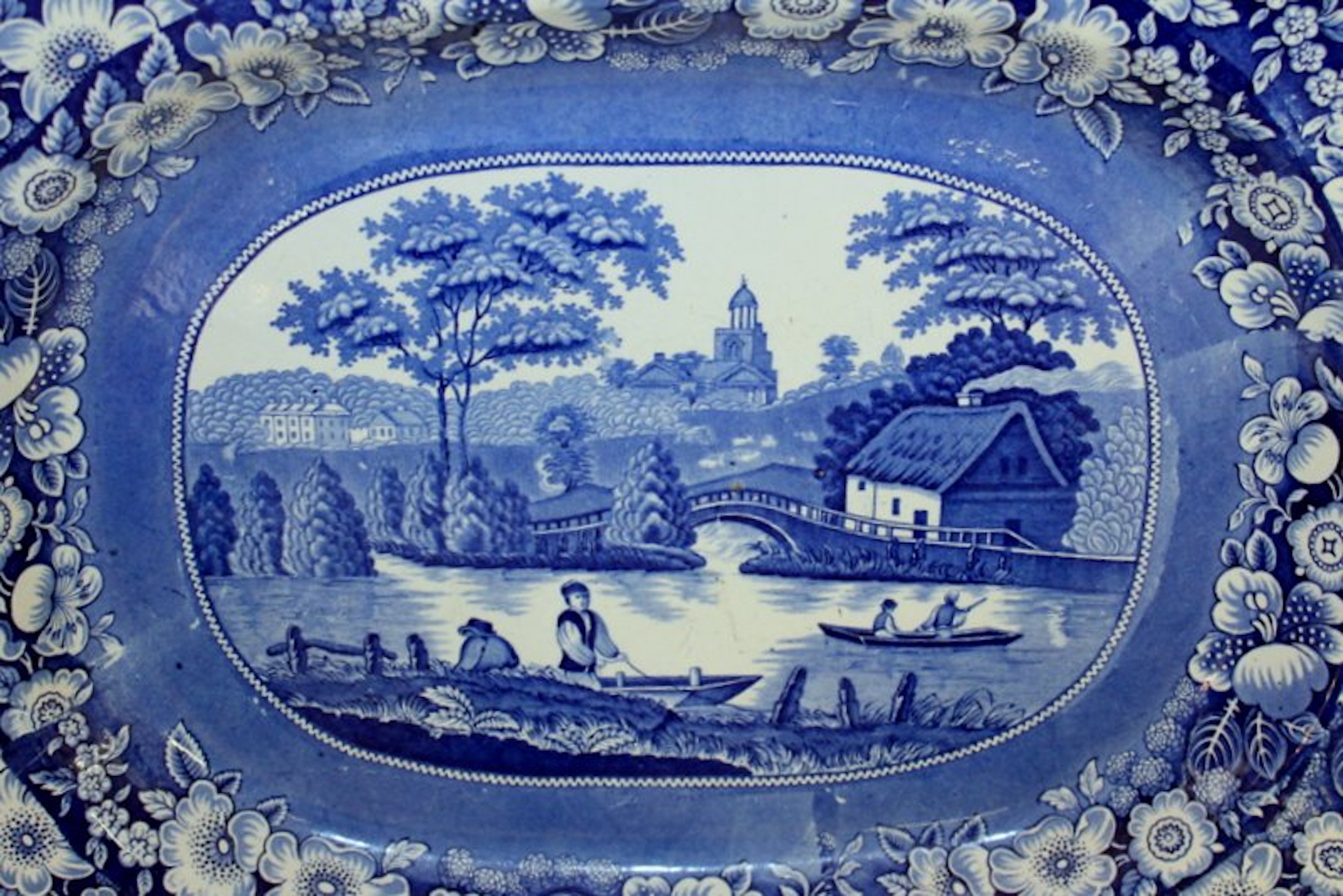 Extraordinarily fine and impressively Large Antique English Blue & White Scenic Transferware Ironstone Platter with unidentifiable “period” impressed makers mark (after exhaustive research in Godden’s and Miller’s books on transferware and ironstone/earthenware). This pattern is illustrated in Miller’s Encyclopedia of British Transfer-Printed Pottery Patterns, pg. 57 and is known as “Nuneham House – Oxforshire” and part of the “Rose Border Series”.