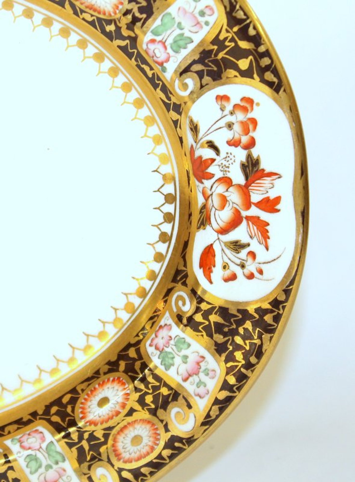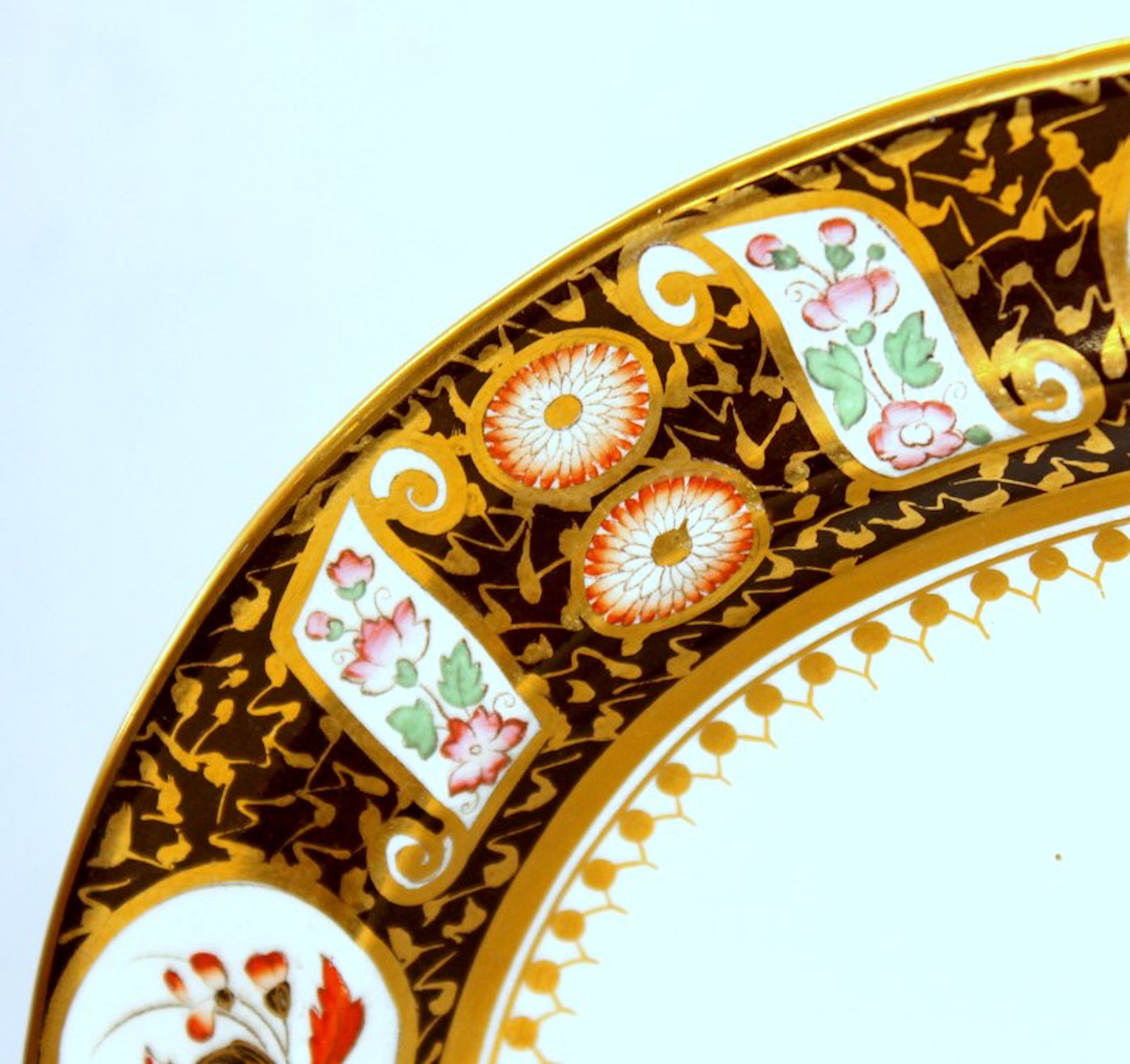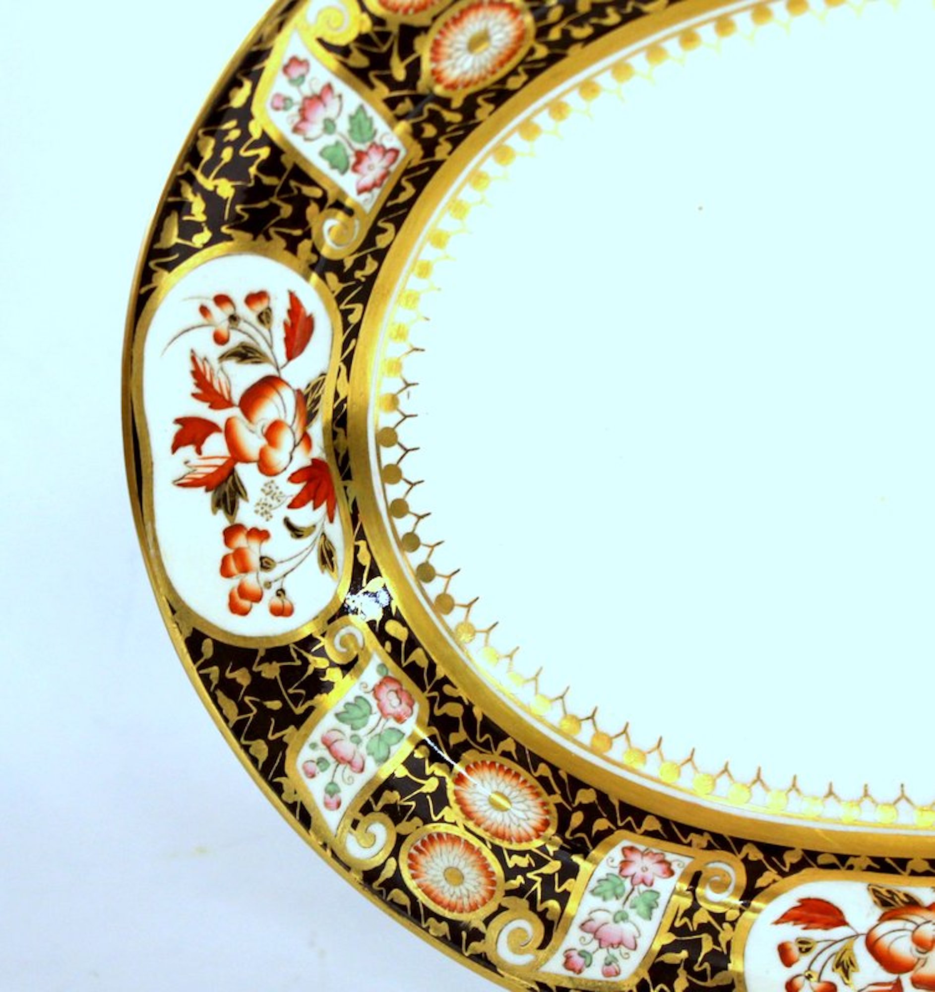 Richly gilded throughout with vibrant colors in a “Black Imari” decor. Small rear top edge “rubs” are likely from a platter hanger and are not considered damaged.