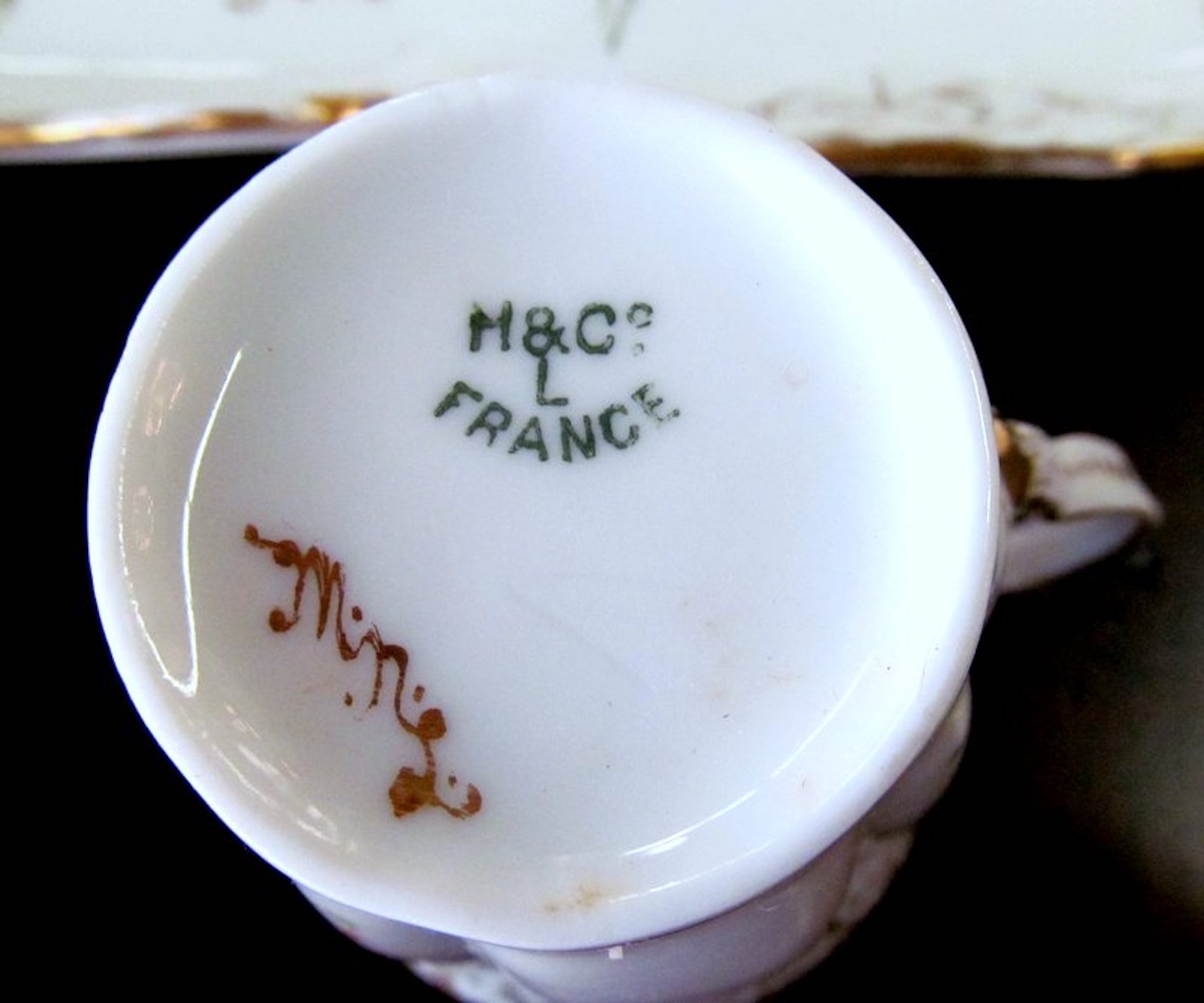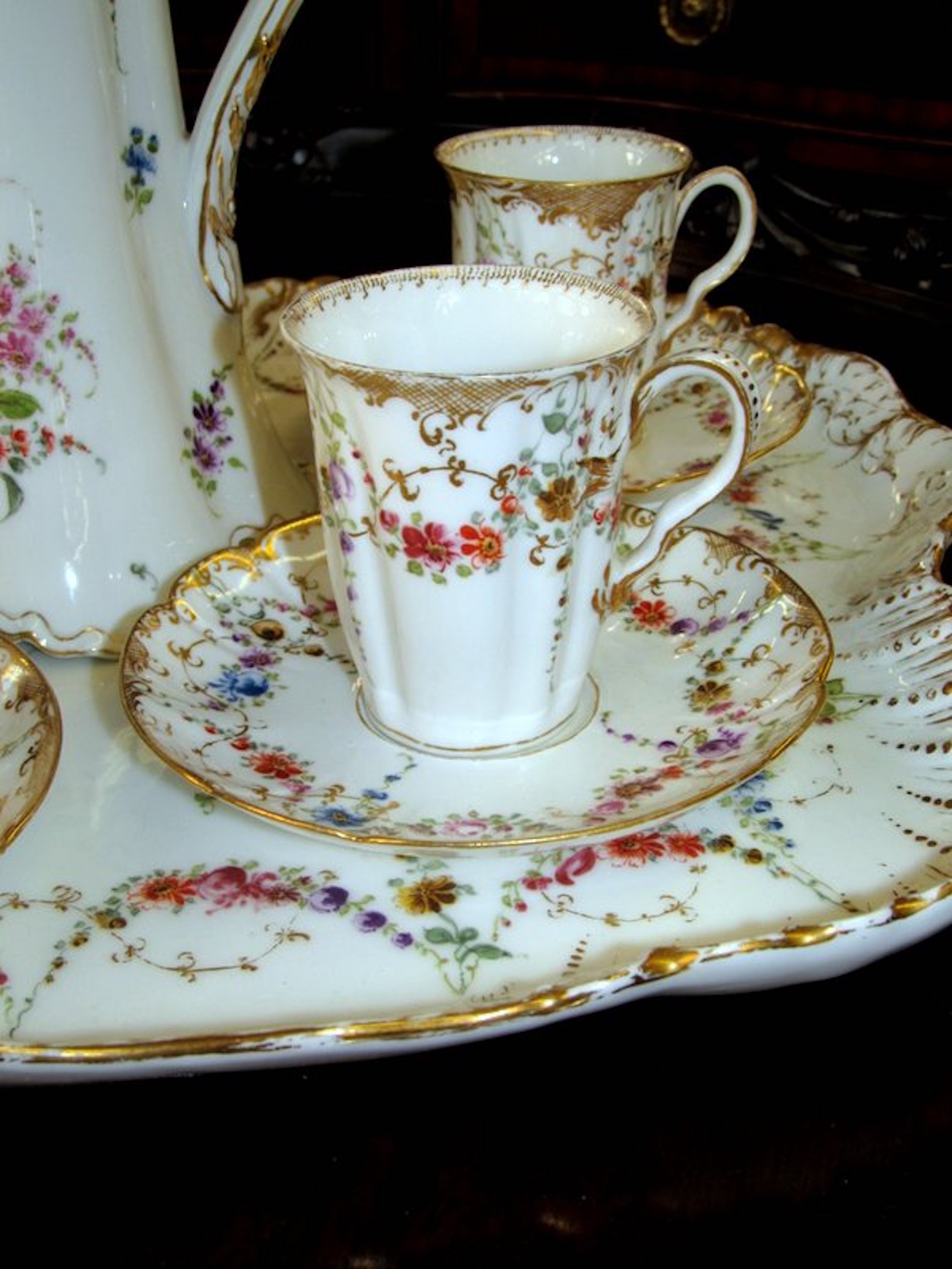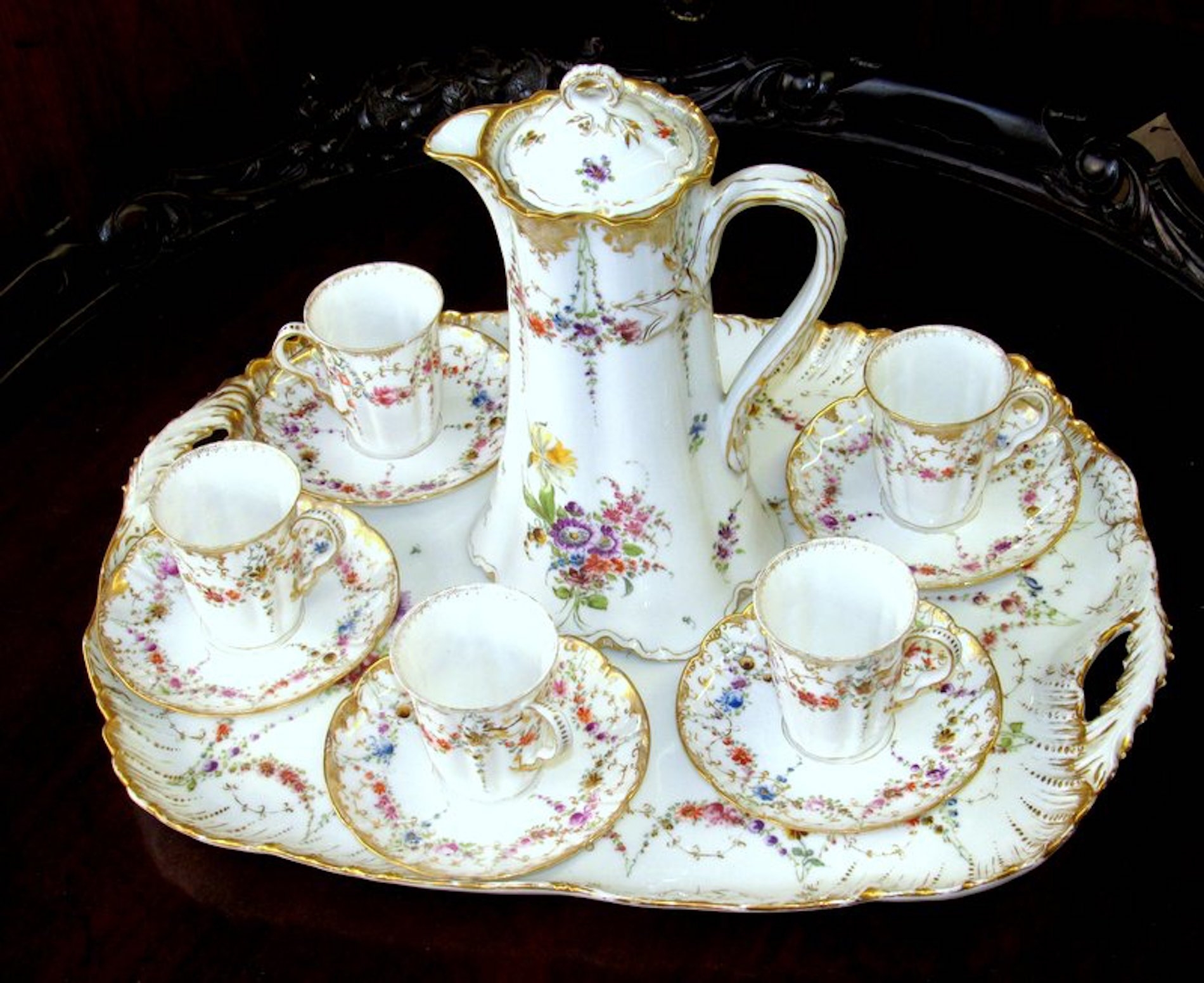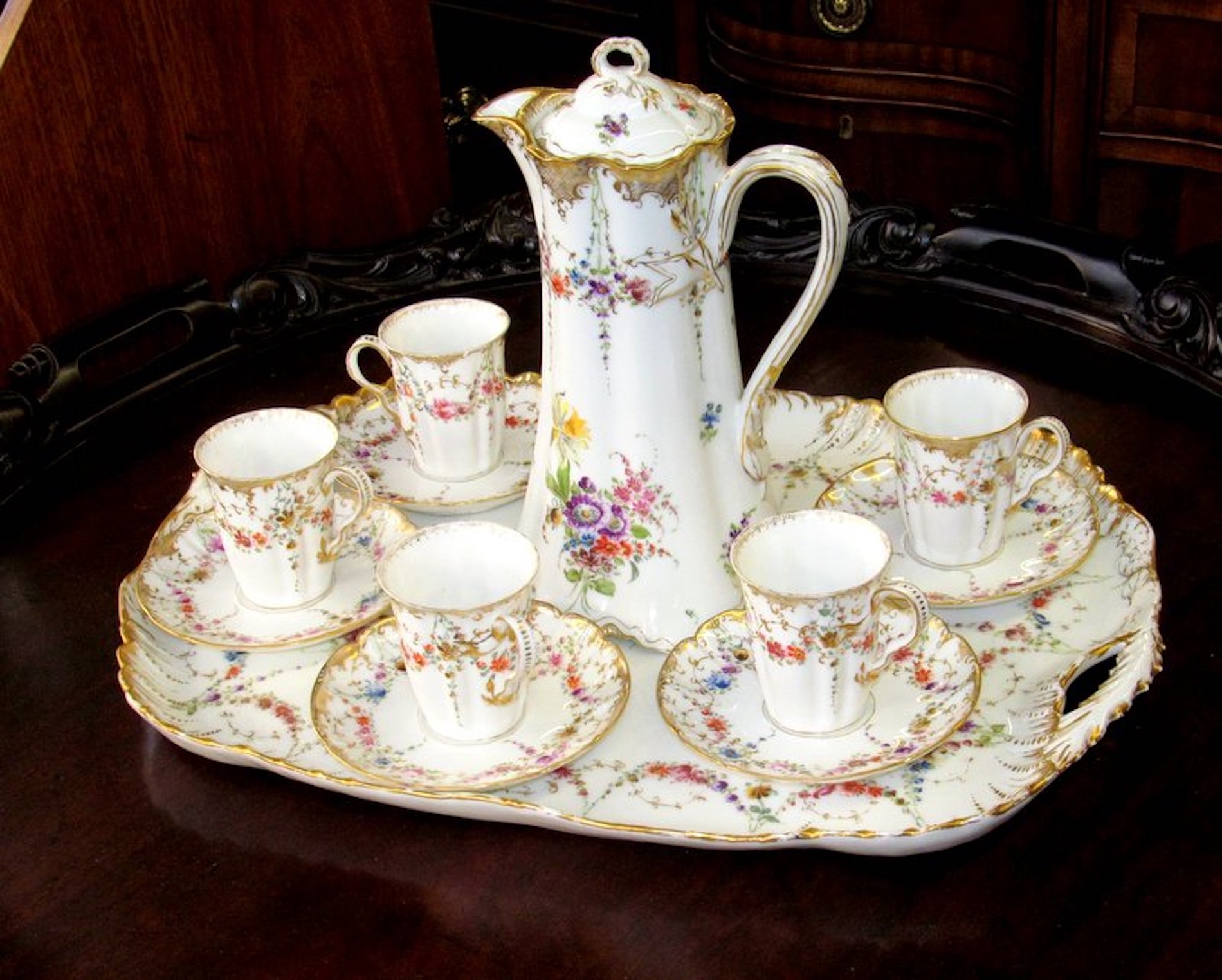 Fabulous Quality Antique French Haviland Limoges Hand Painted Porcelain Chocolate Set with rare cabaret tray, chocolate pot and 5 cups and saucers