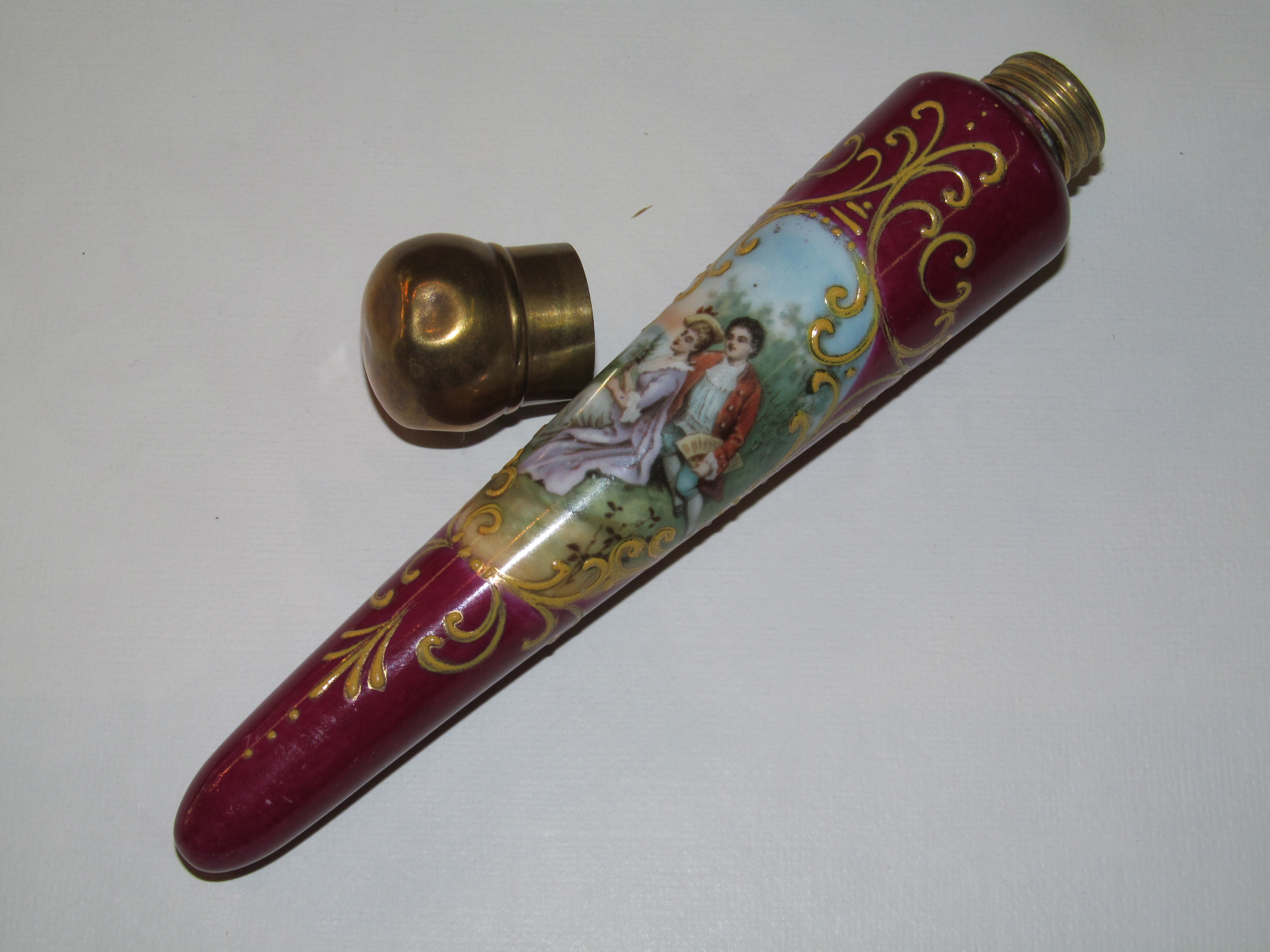 Exceptional Antique continental porcelain hand painted and gilt tapored scent bottle.