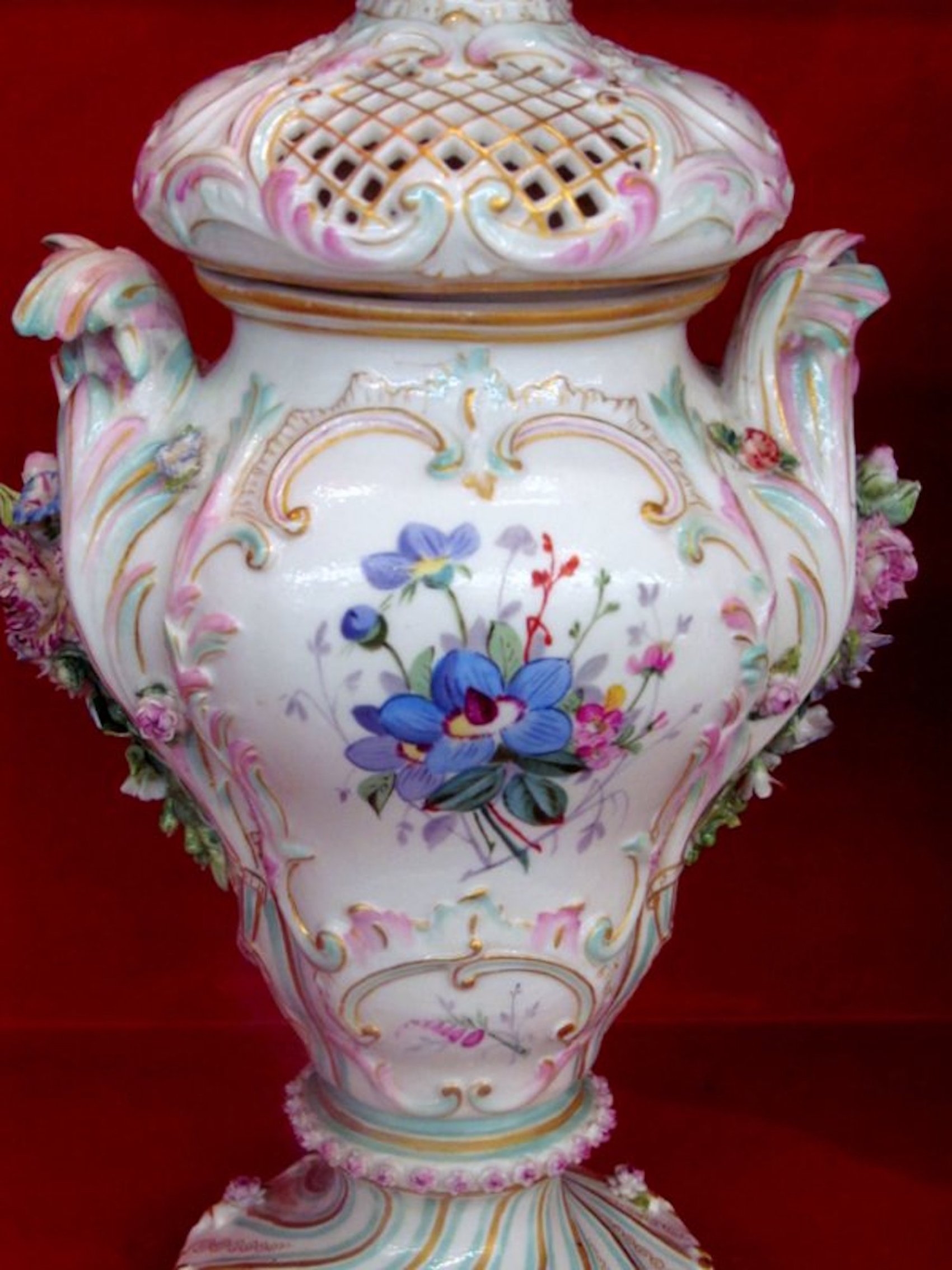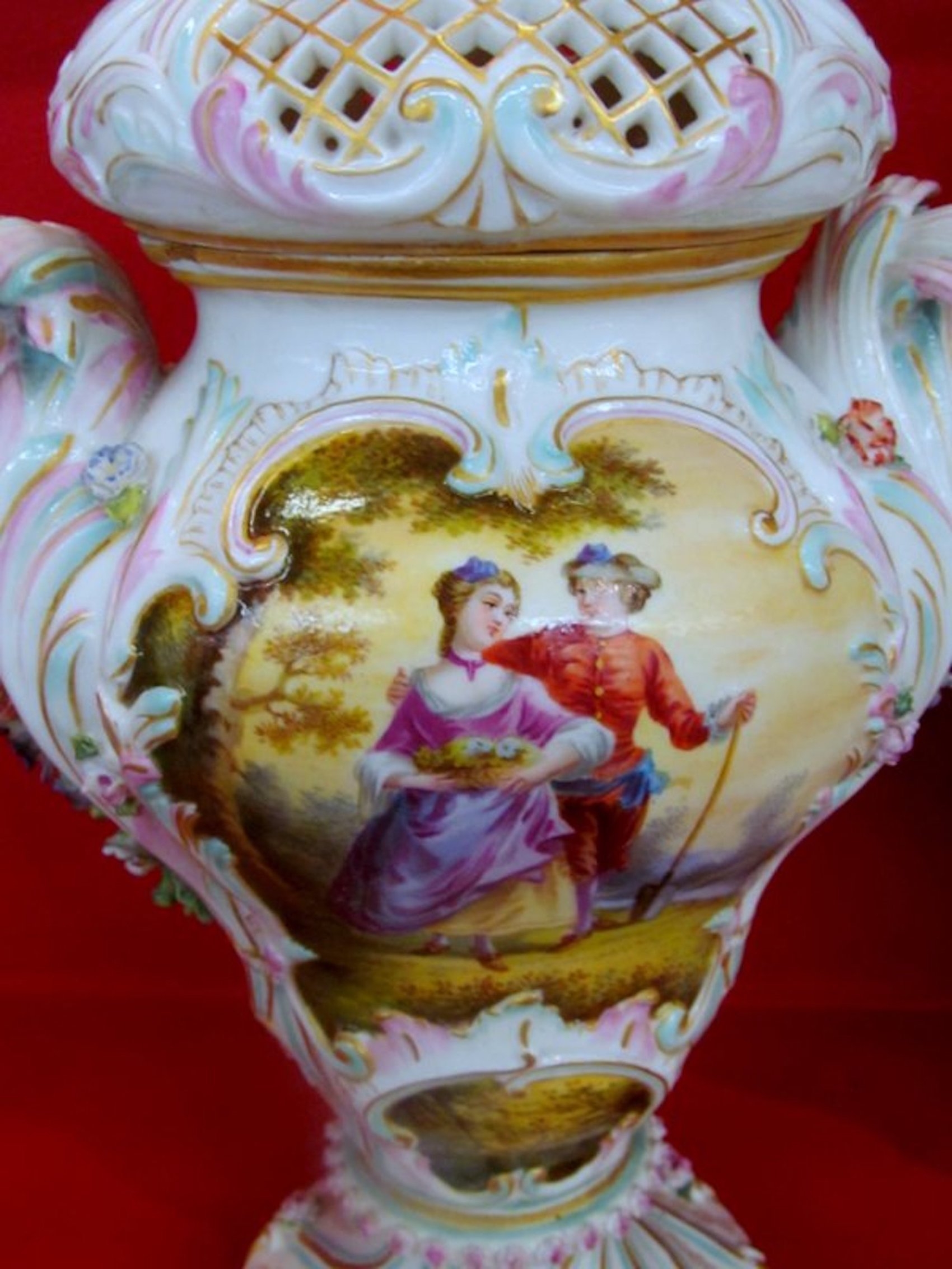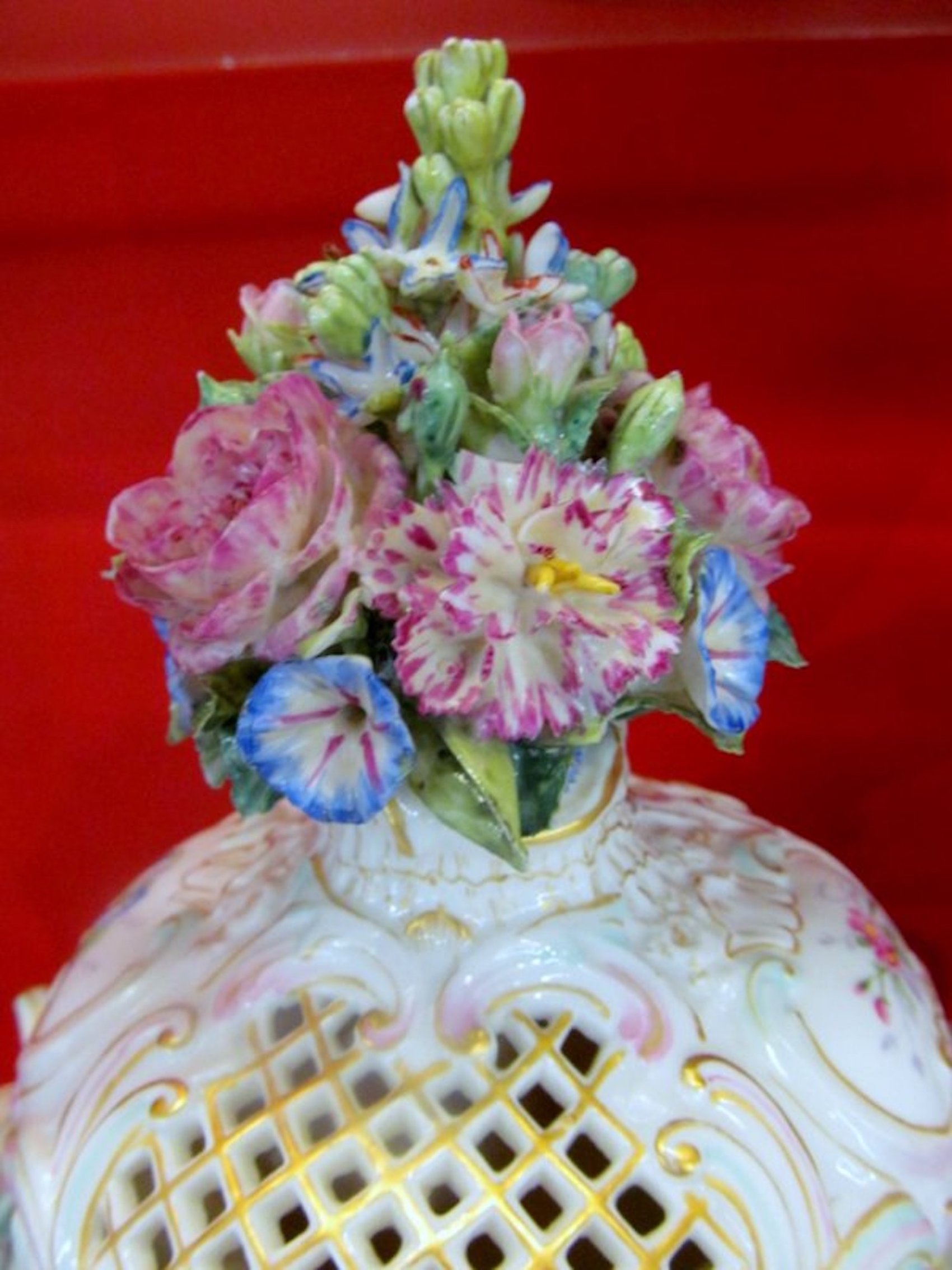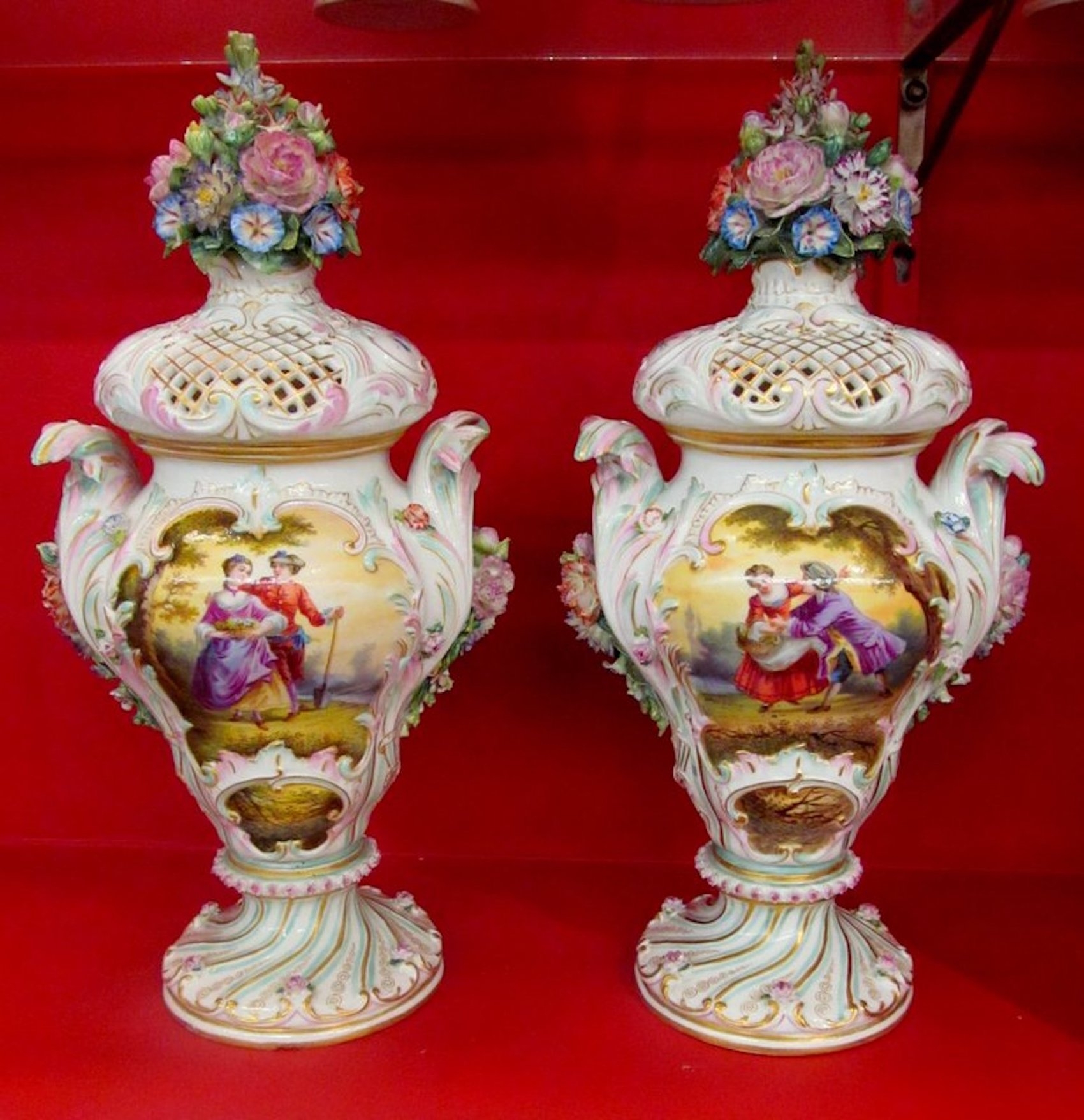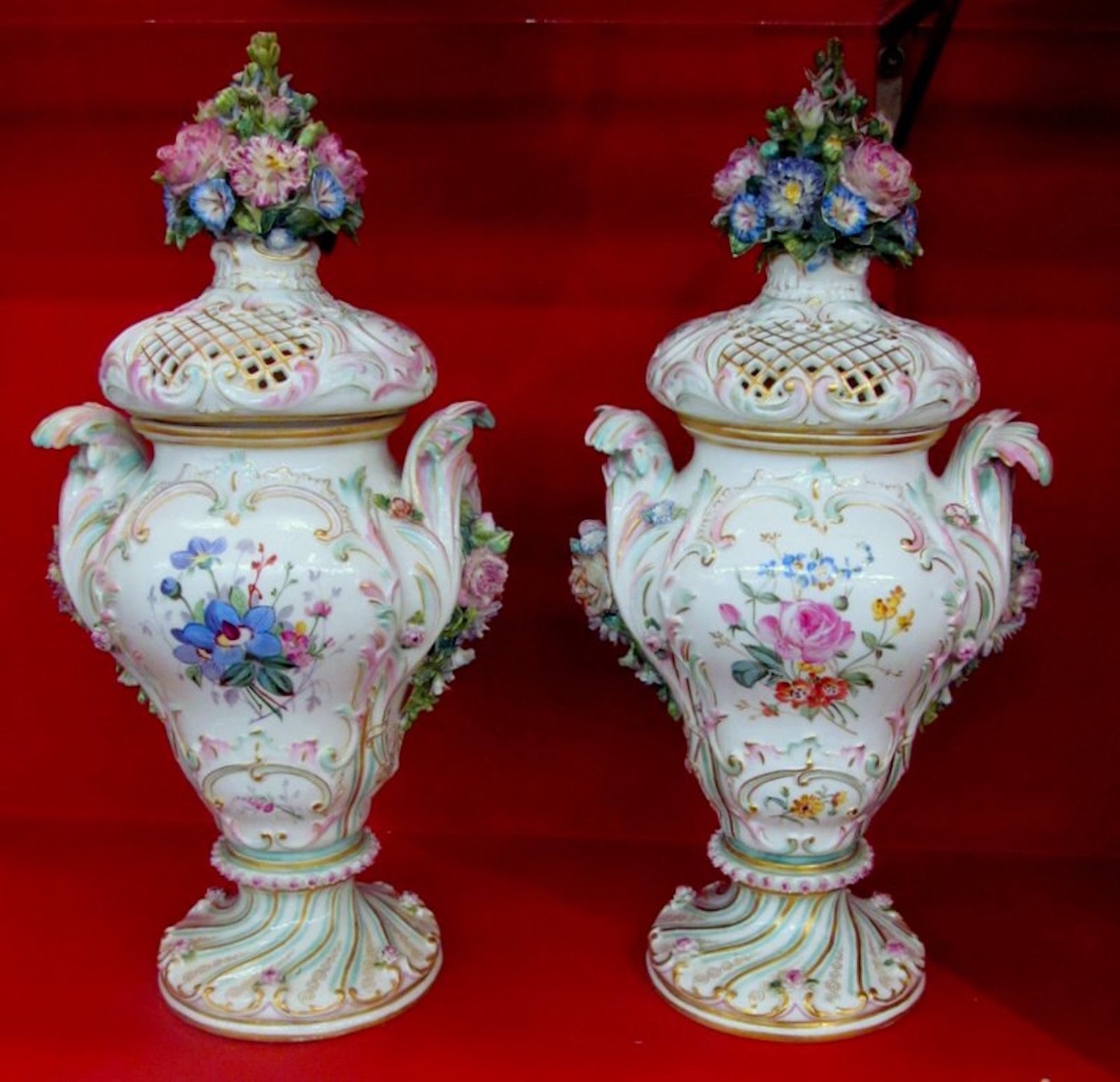 PAIR of Exceptional Quality Rare and Important Antique Meissen Hand Painted Porcelain Potpourri Urns/ Vases with Pierced Bocage Lids