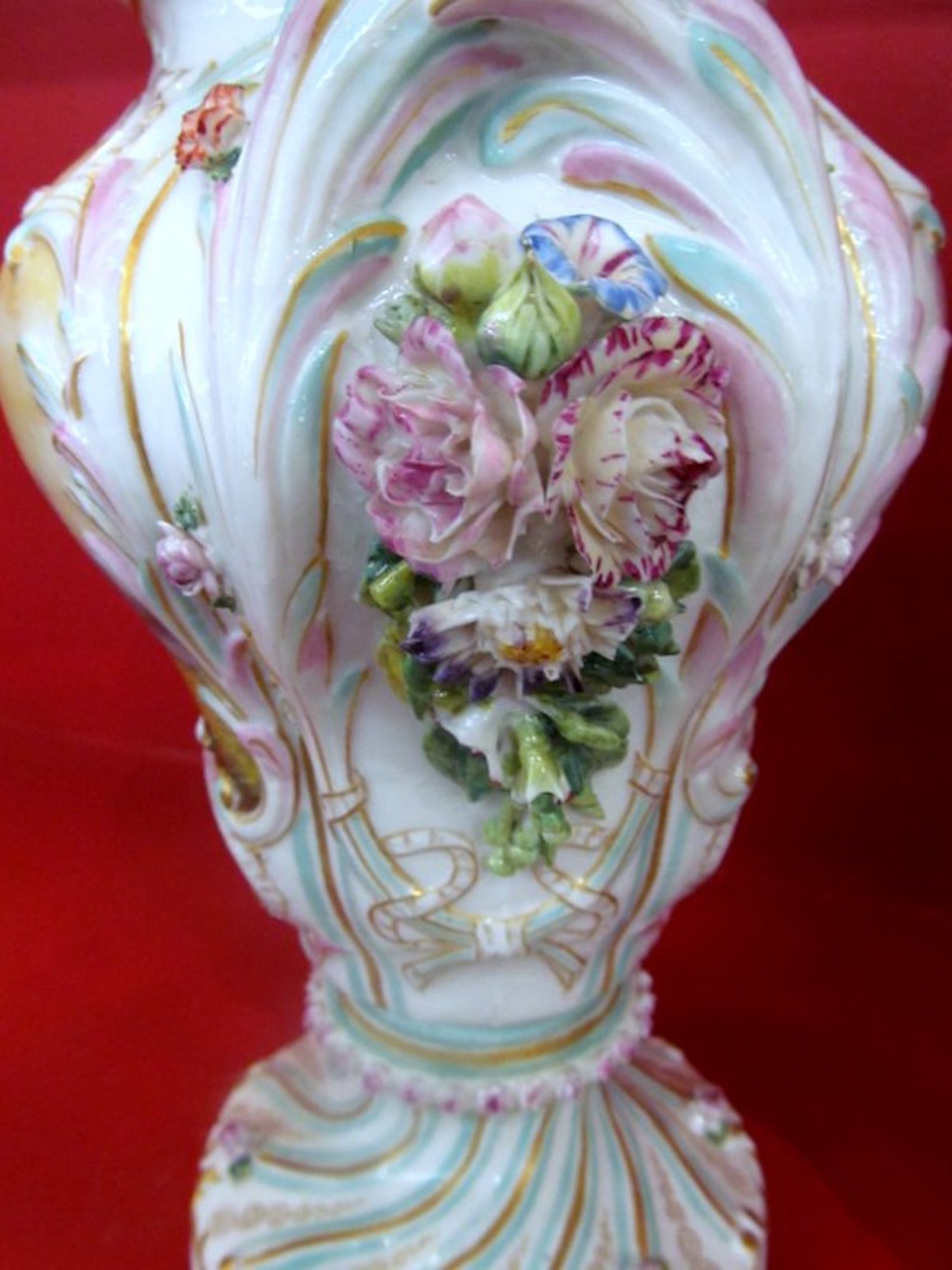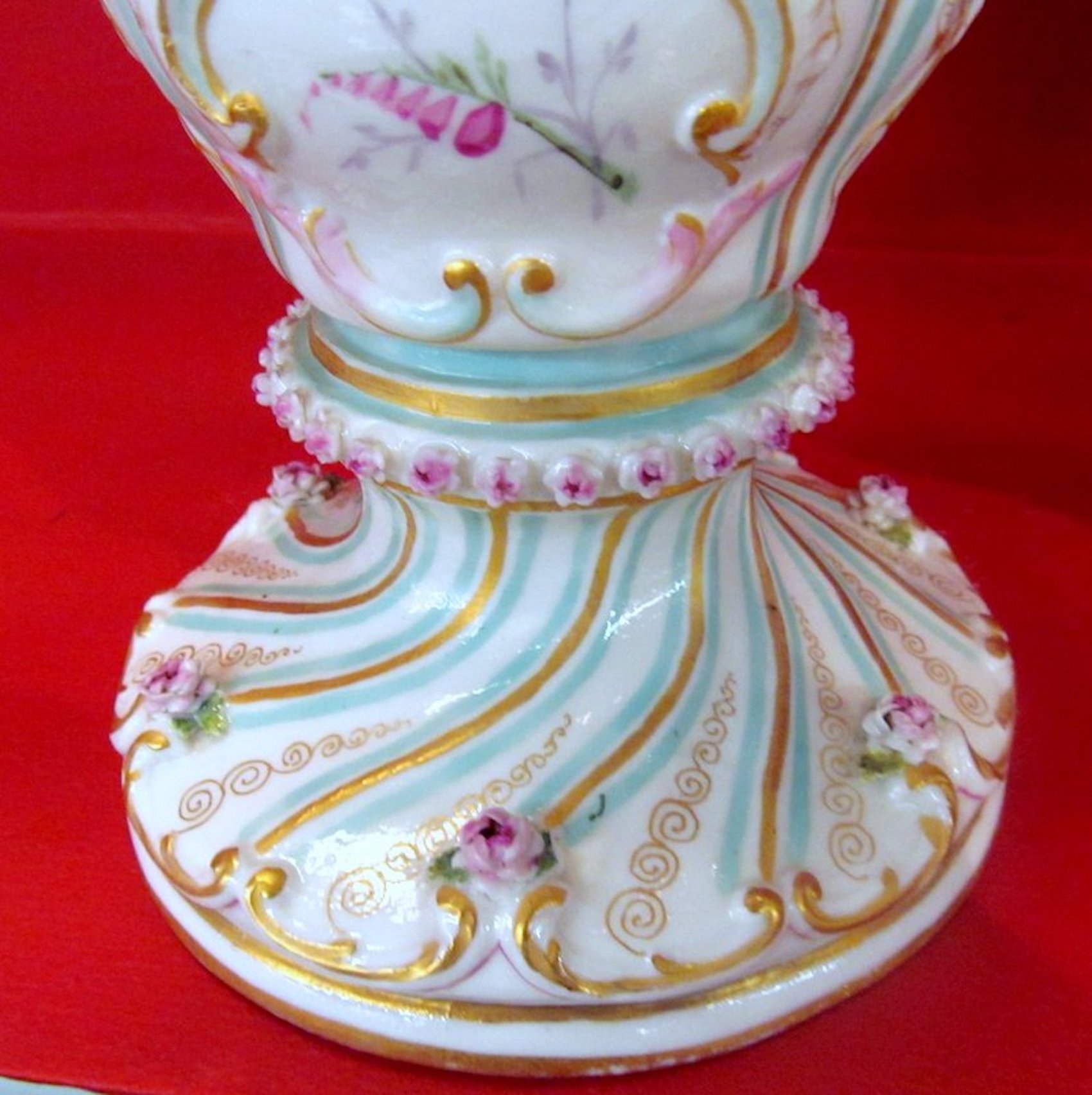 Please note exquisite double-sided urns with “Watteau-esque”pastoral scene on one side and floral bouquet on other side.