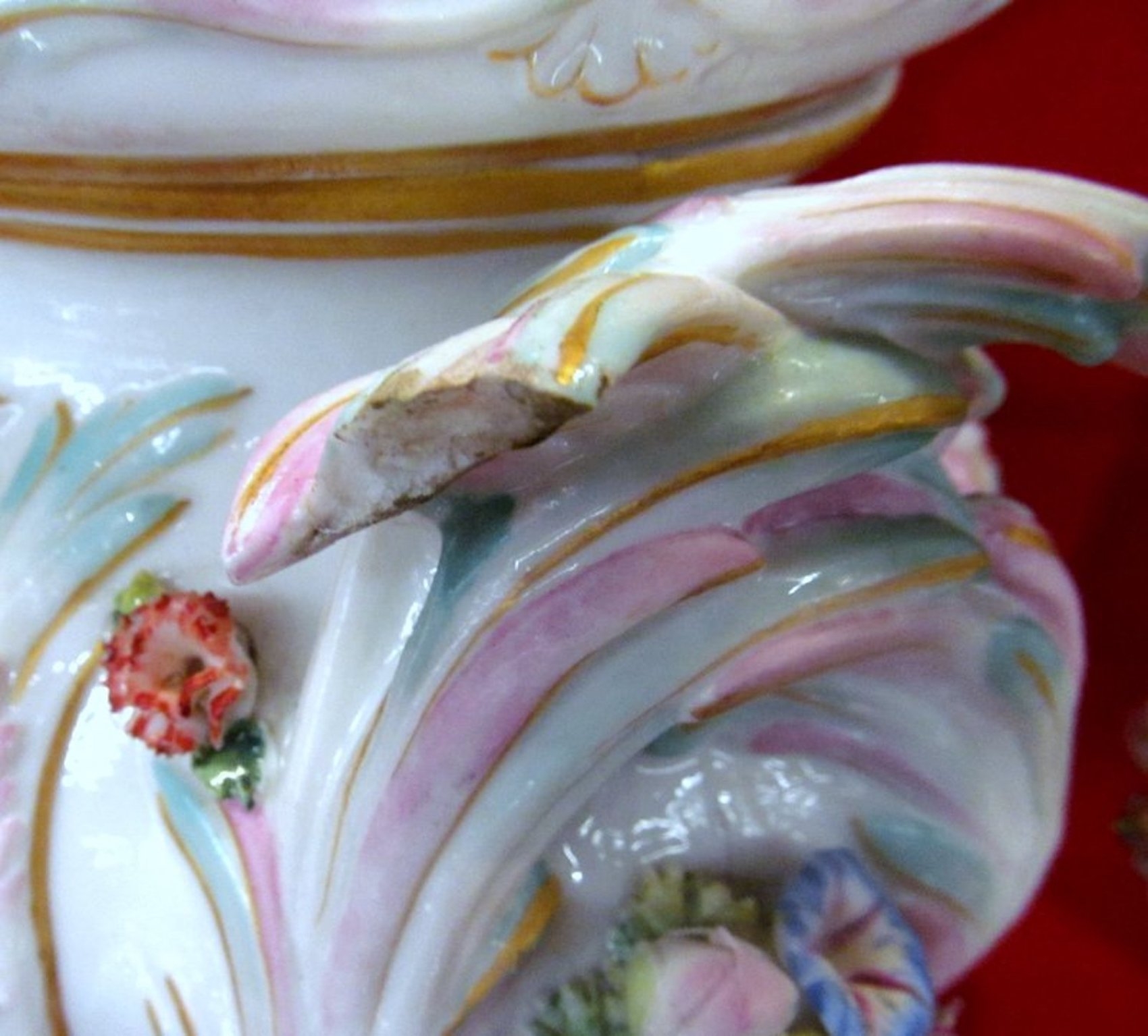 Note the exceptional “bocage” work on the floral clusters atop each lid. The painted pastoral landscapes on the obverse and the floral bouqets in verso are exquisitely hand painted as are all of the decorations.