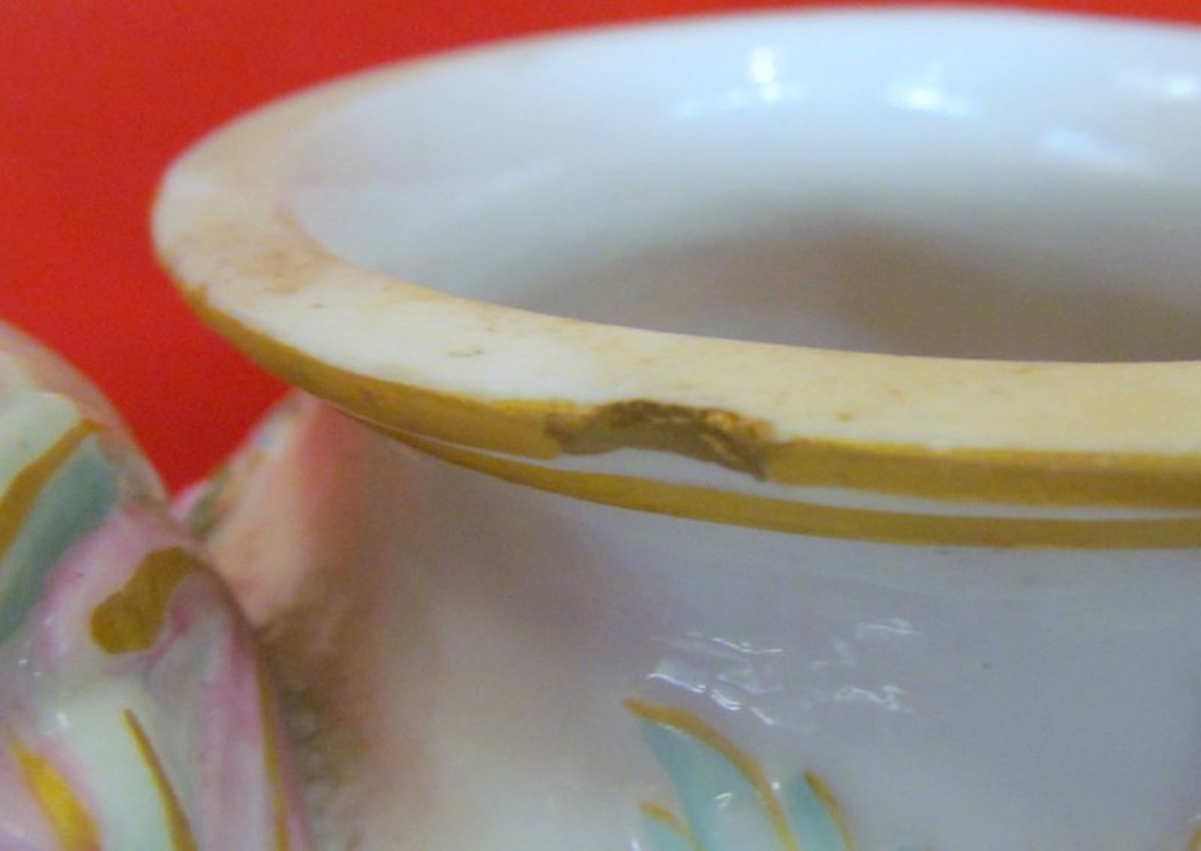 The damage shown to one handle on one urn and the chip to the lip have been seriously taken into consideration and is reflective in the price.