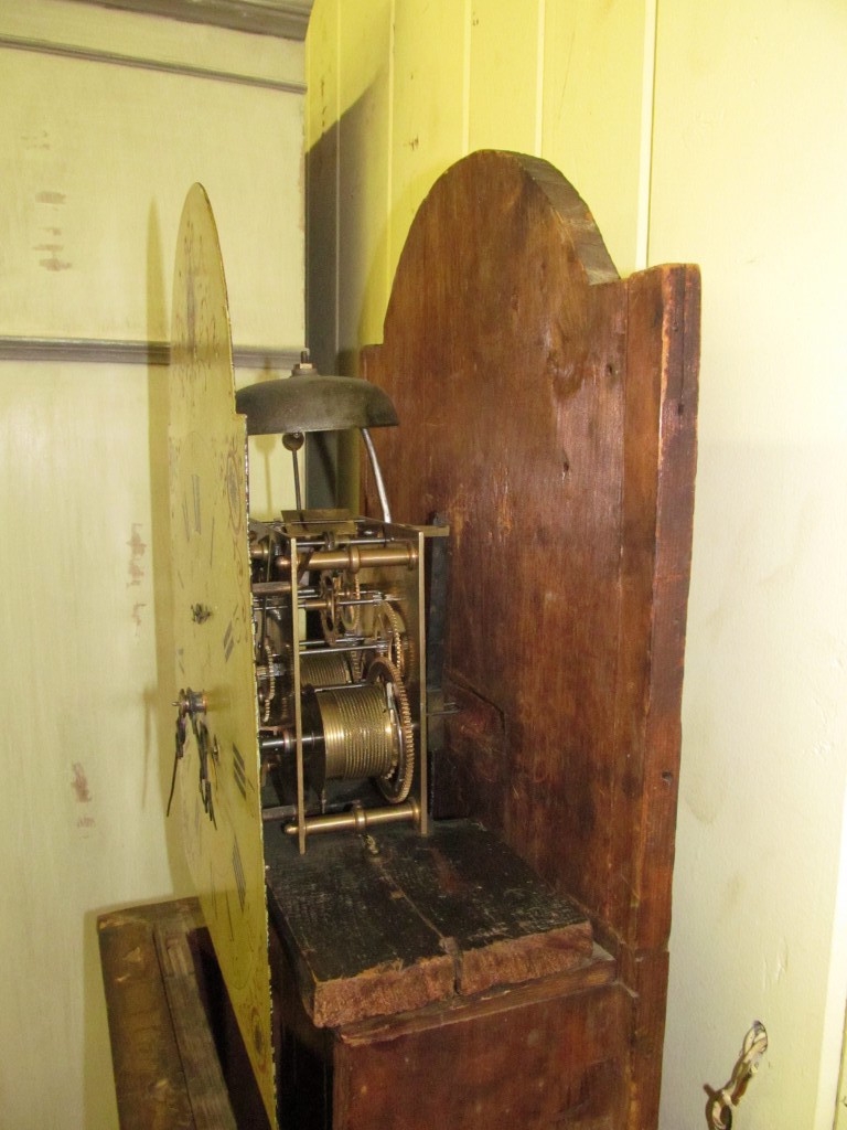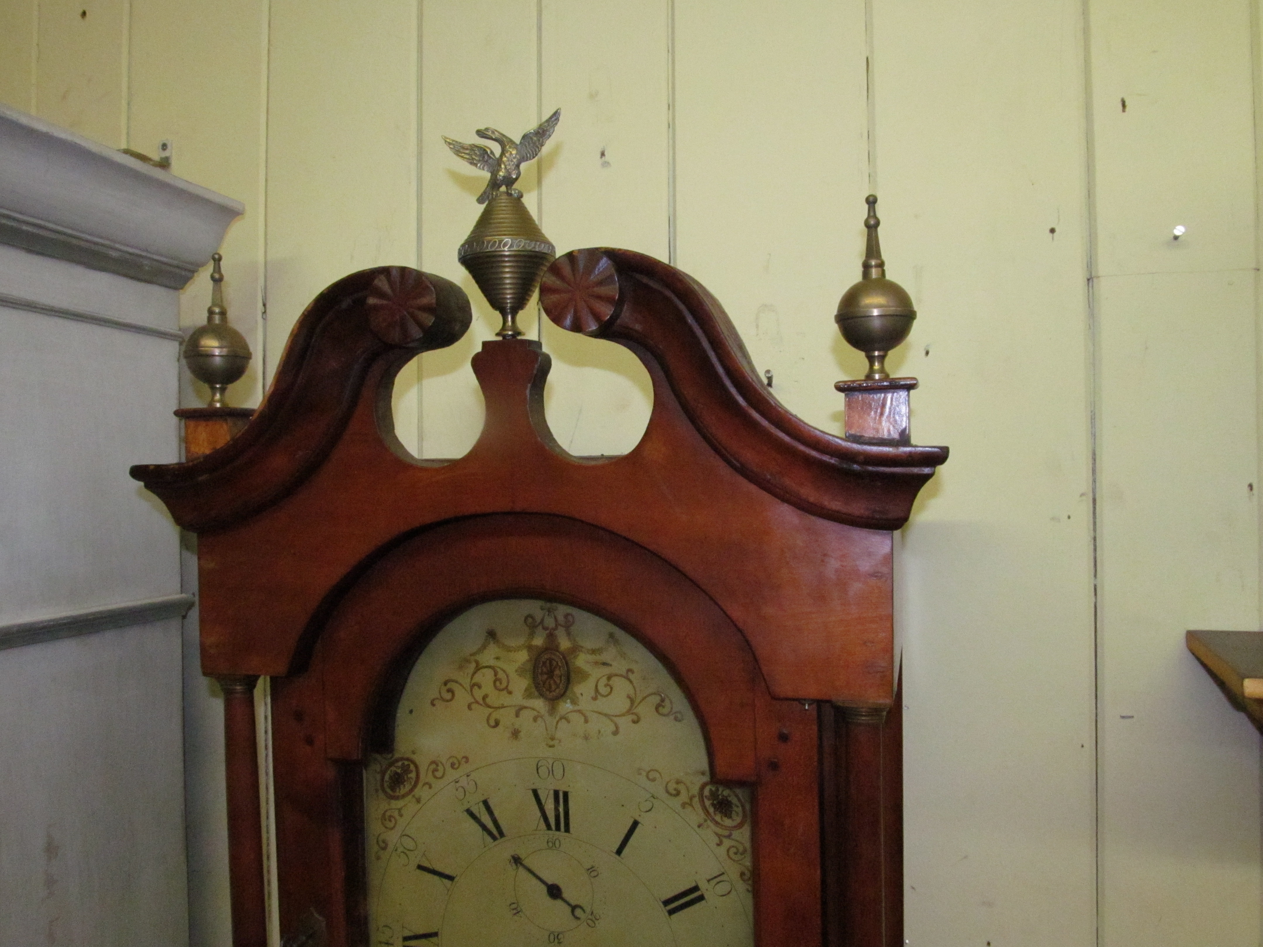 Note: Lovely fan motif paterae on swan-neck pediment. This clock is unsigned but attributed to Timothy Chandler (Concord, NH)