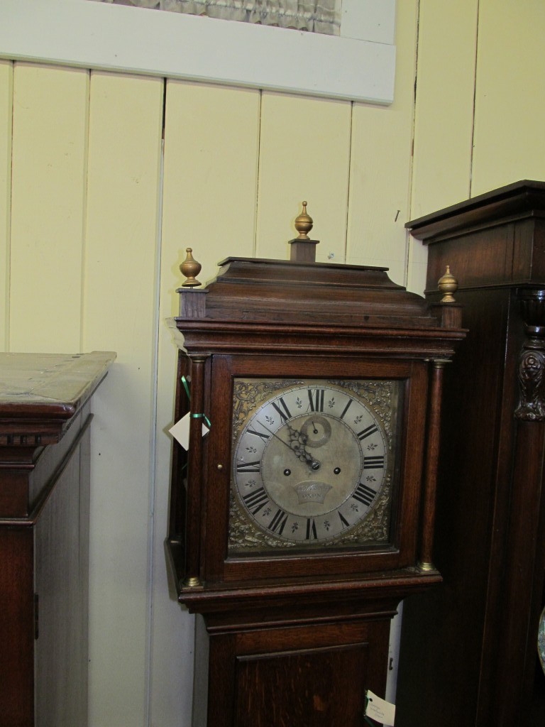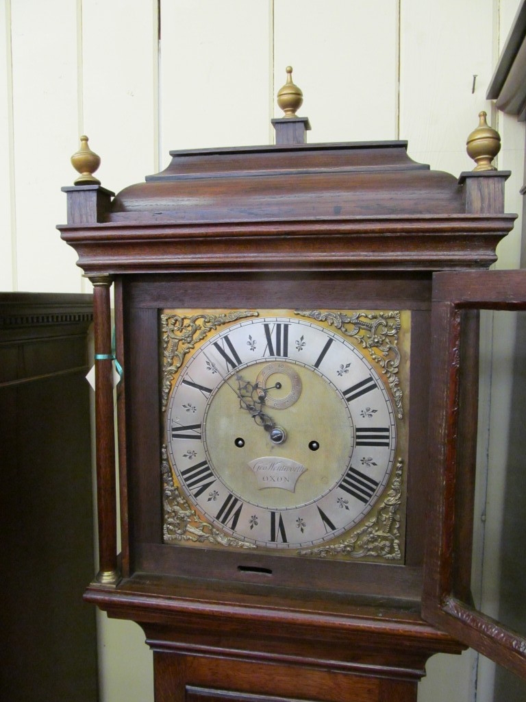 Fabulous Quality Antique English Geo. III Inlaid Oak Brass and Silver Dial, 8-Day, Hour Strike Longcare Clock