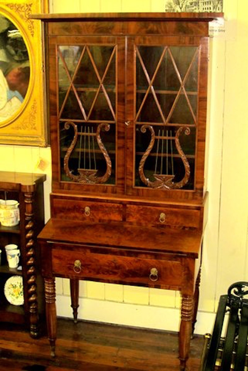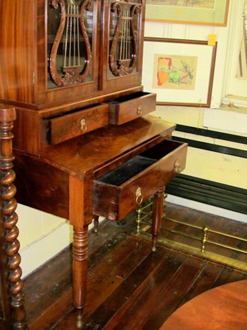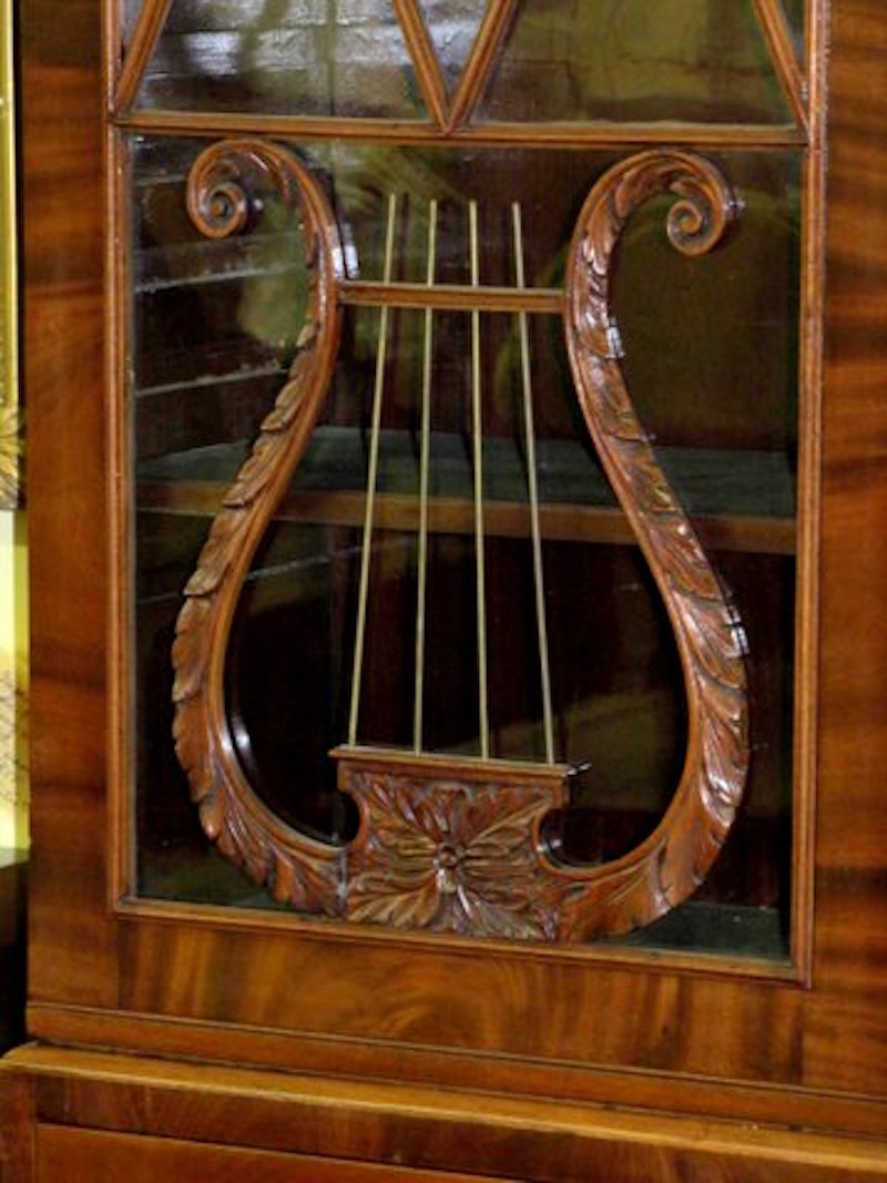 Rare and Important Antique American Figured Mahogany “Duncan Phyfe Style” Fold-door Secretary Bookcase with gorgeous Lyre-shaped glazed doors