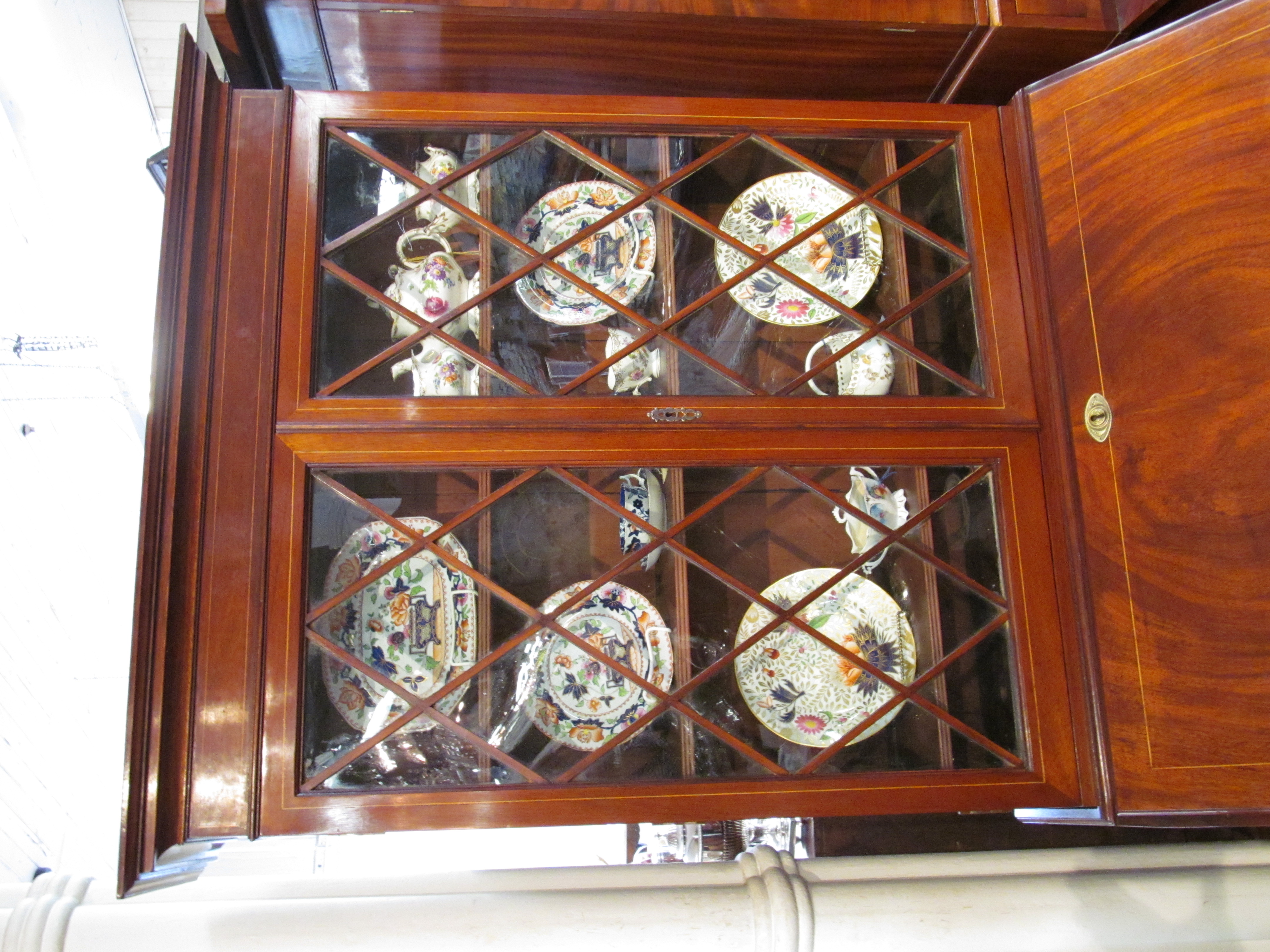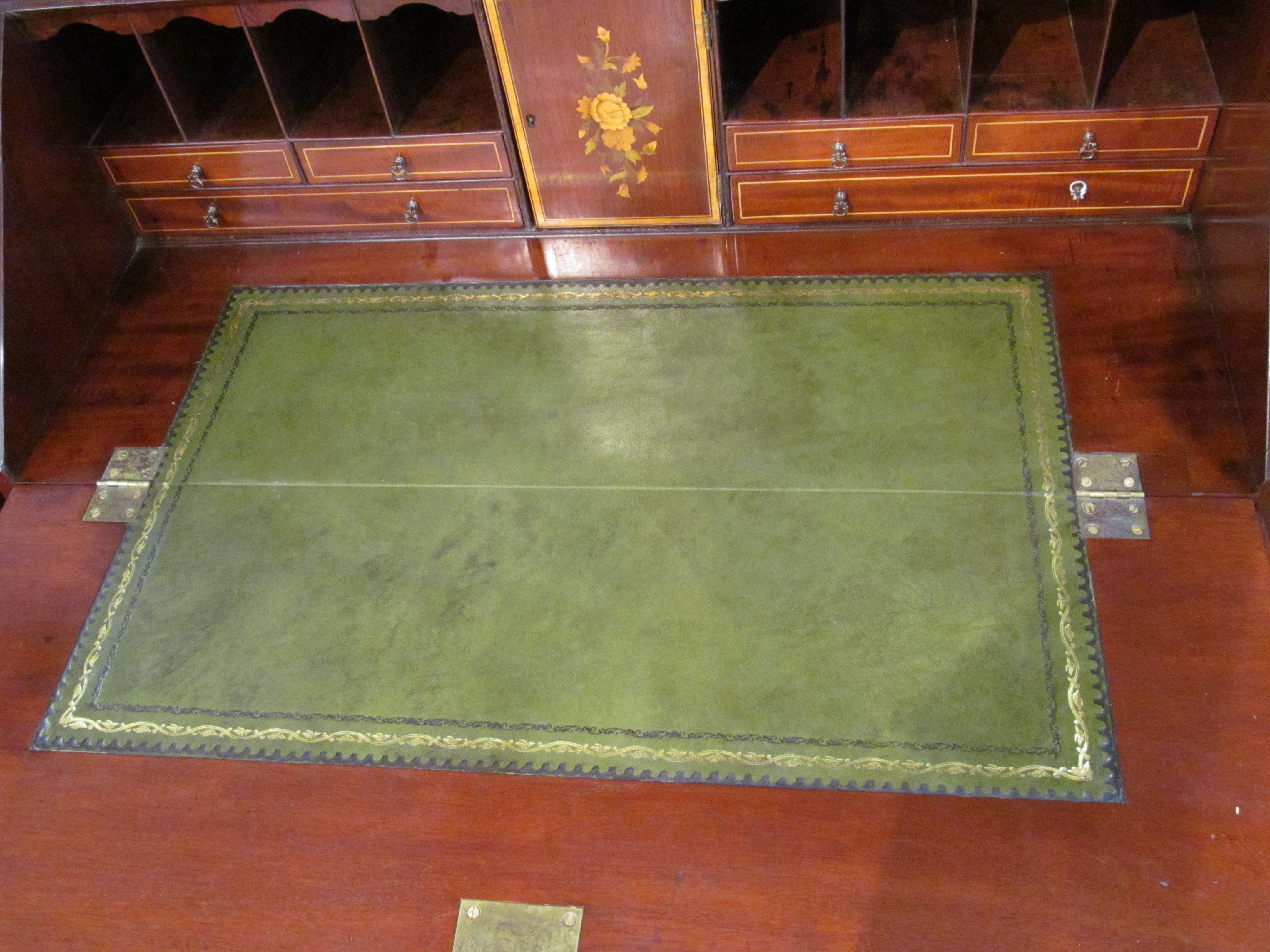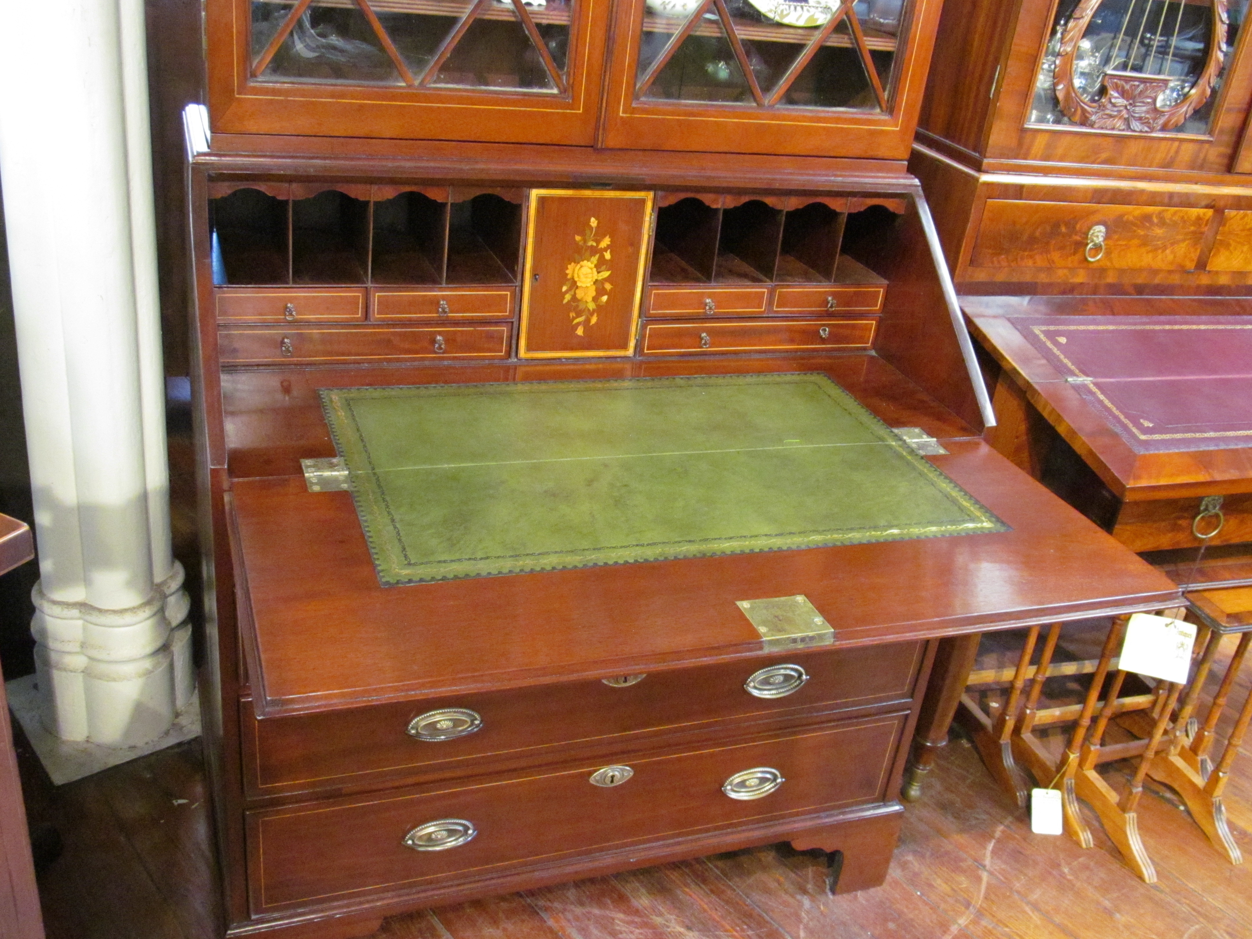 Wonderful “x” cross barring. Please note lovely marquetry inlaid prospect cupboard door and leather writing surface.