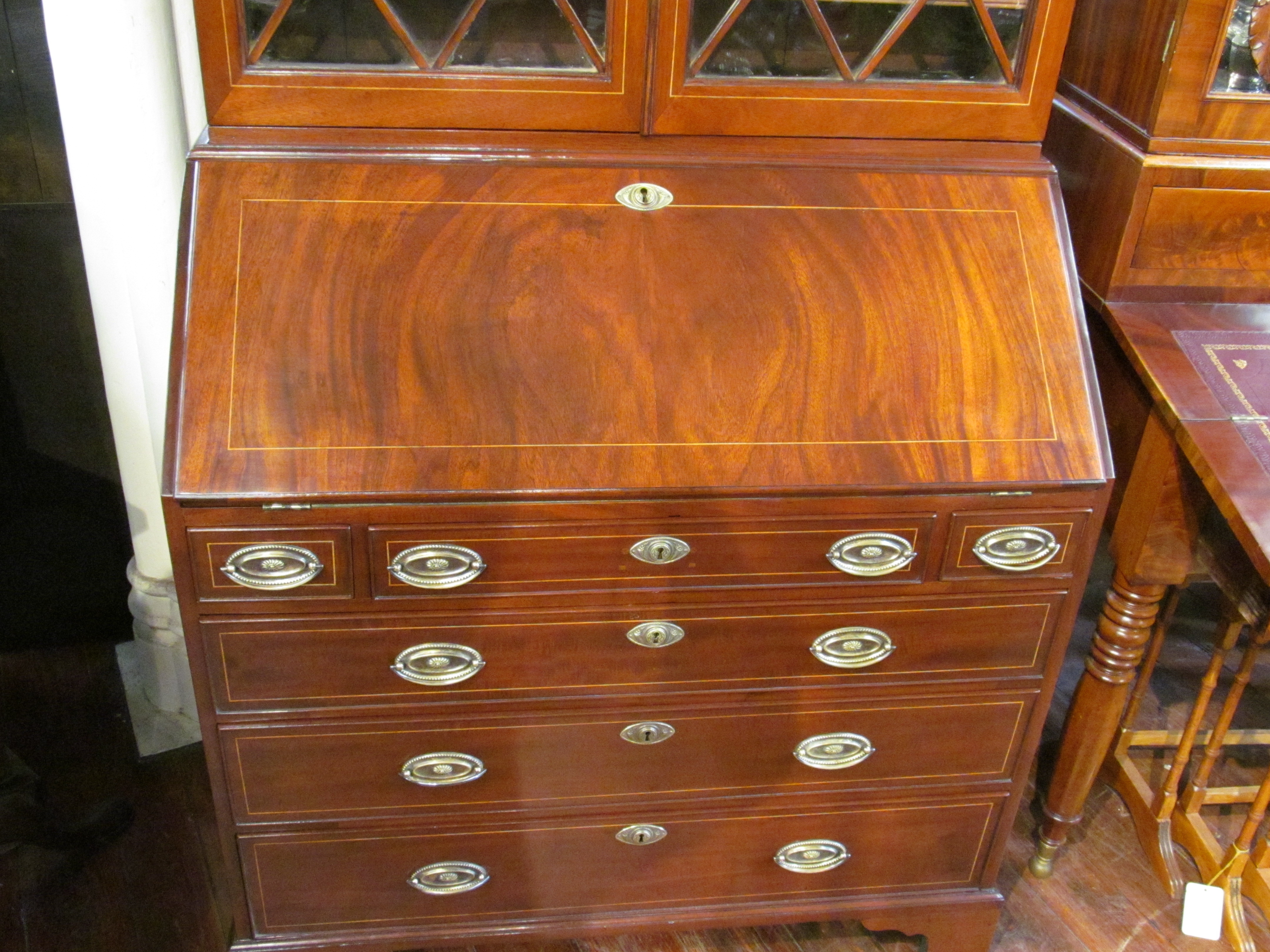Superb Quality Antique English Inlaid Flame Mahogany Geo. III Slantfront Bureau Bookcase or Secretary with handsome fitted interior