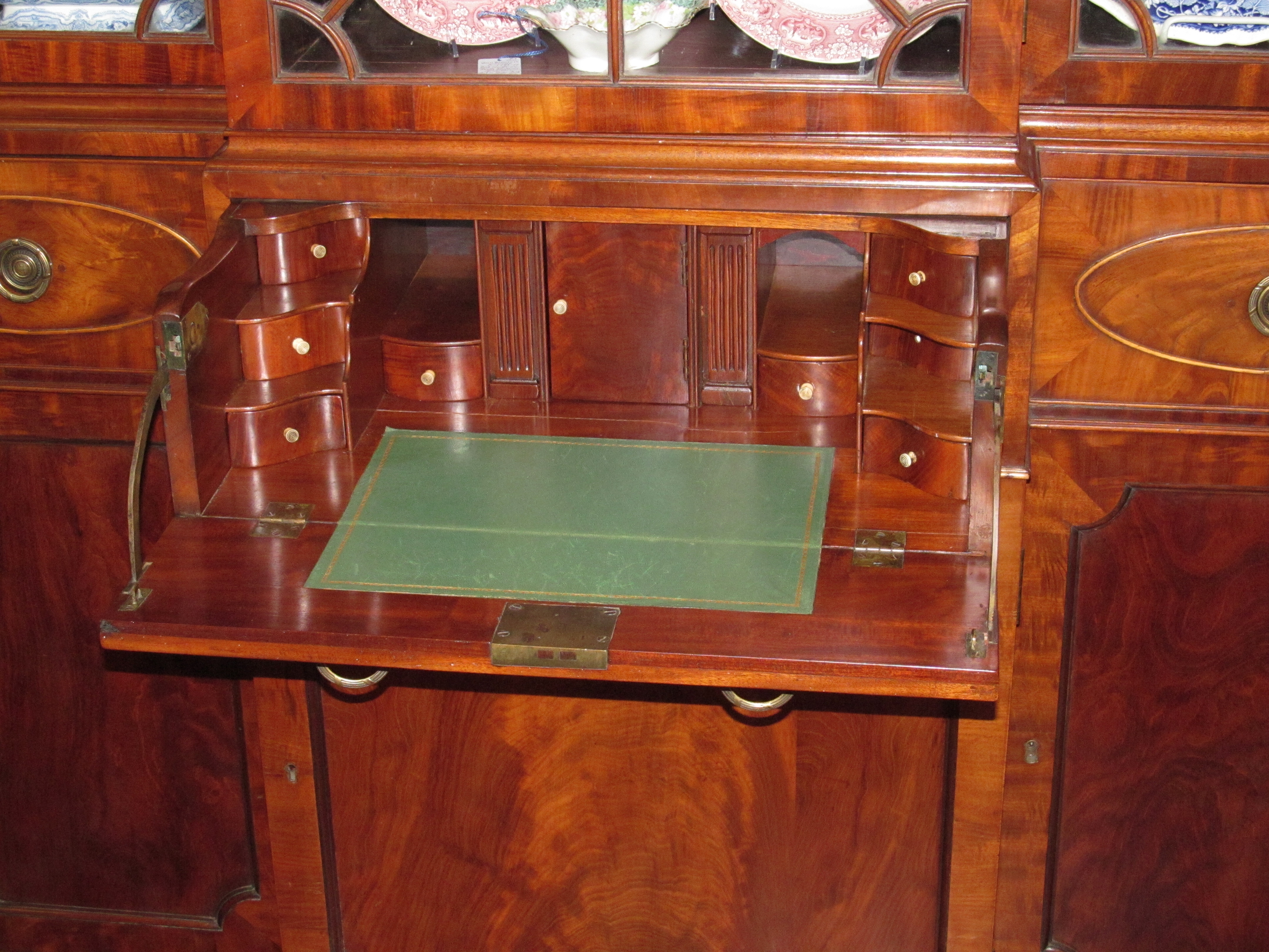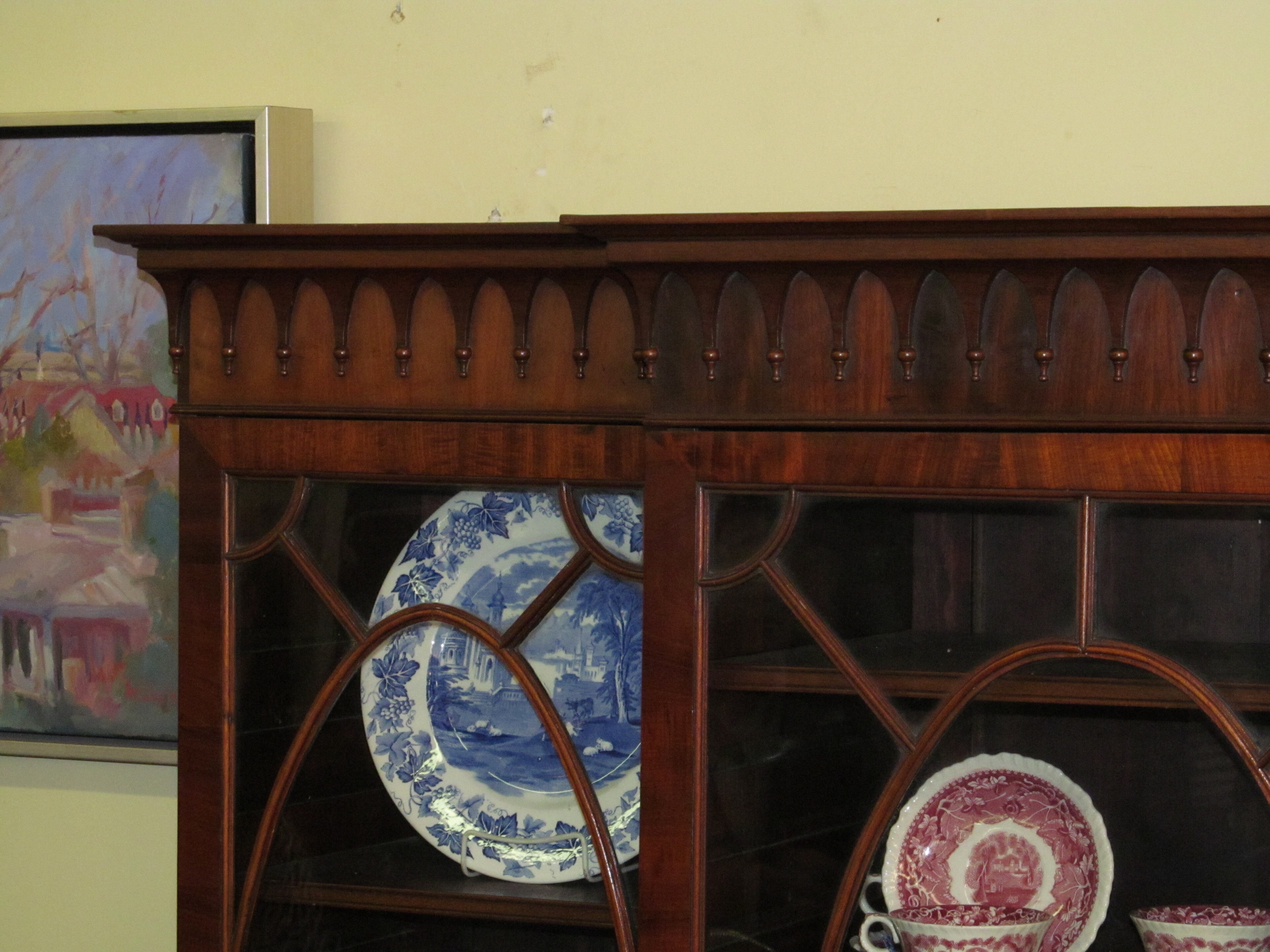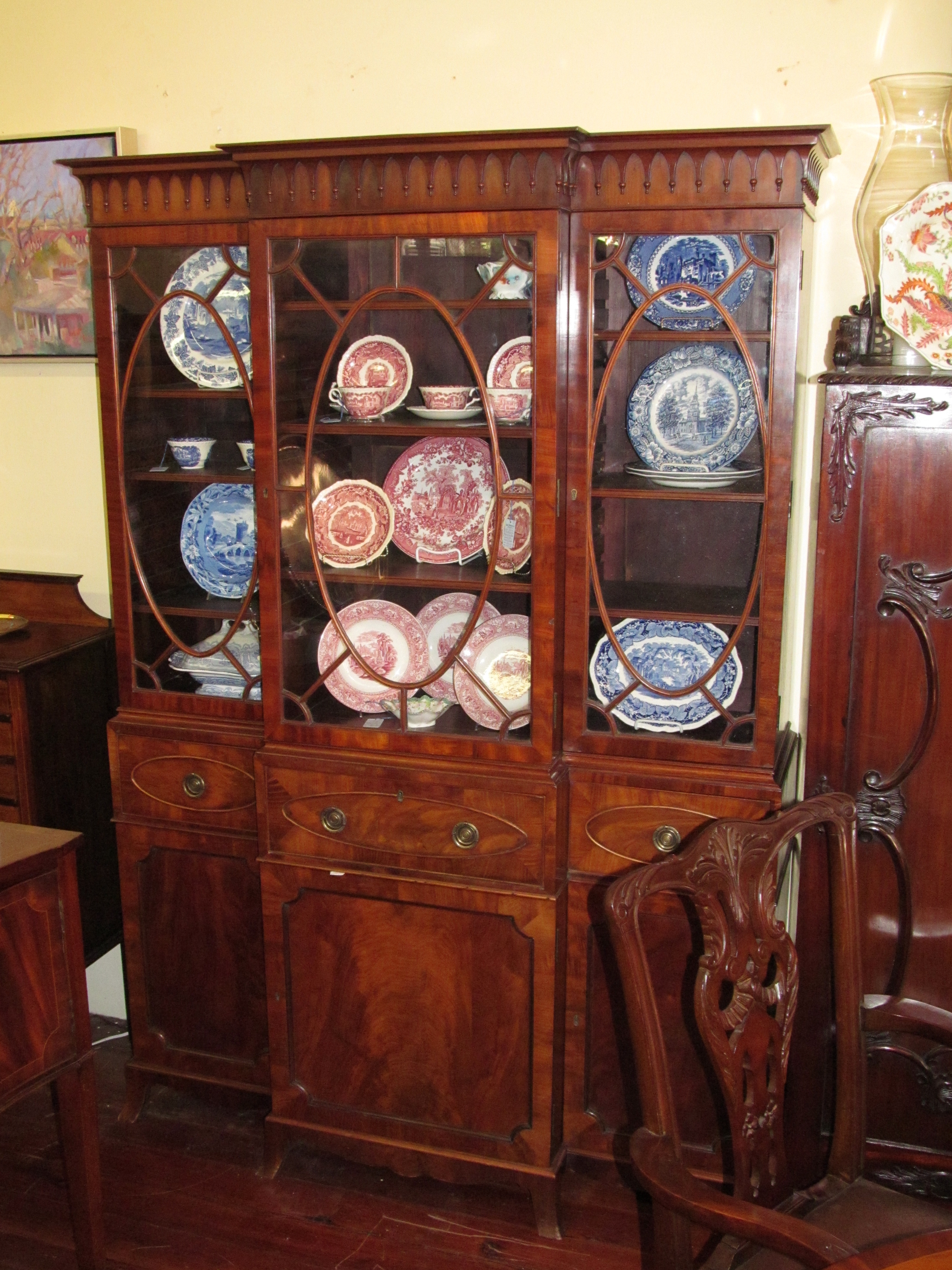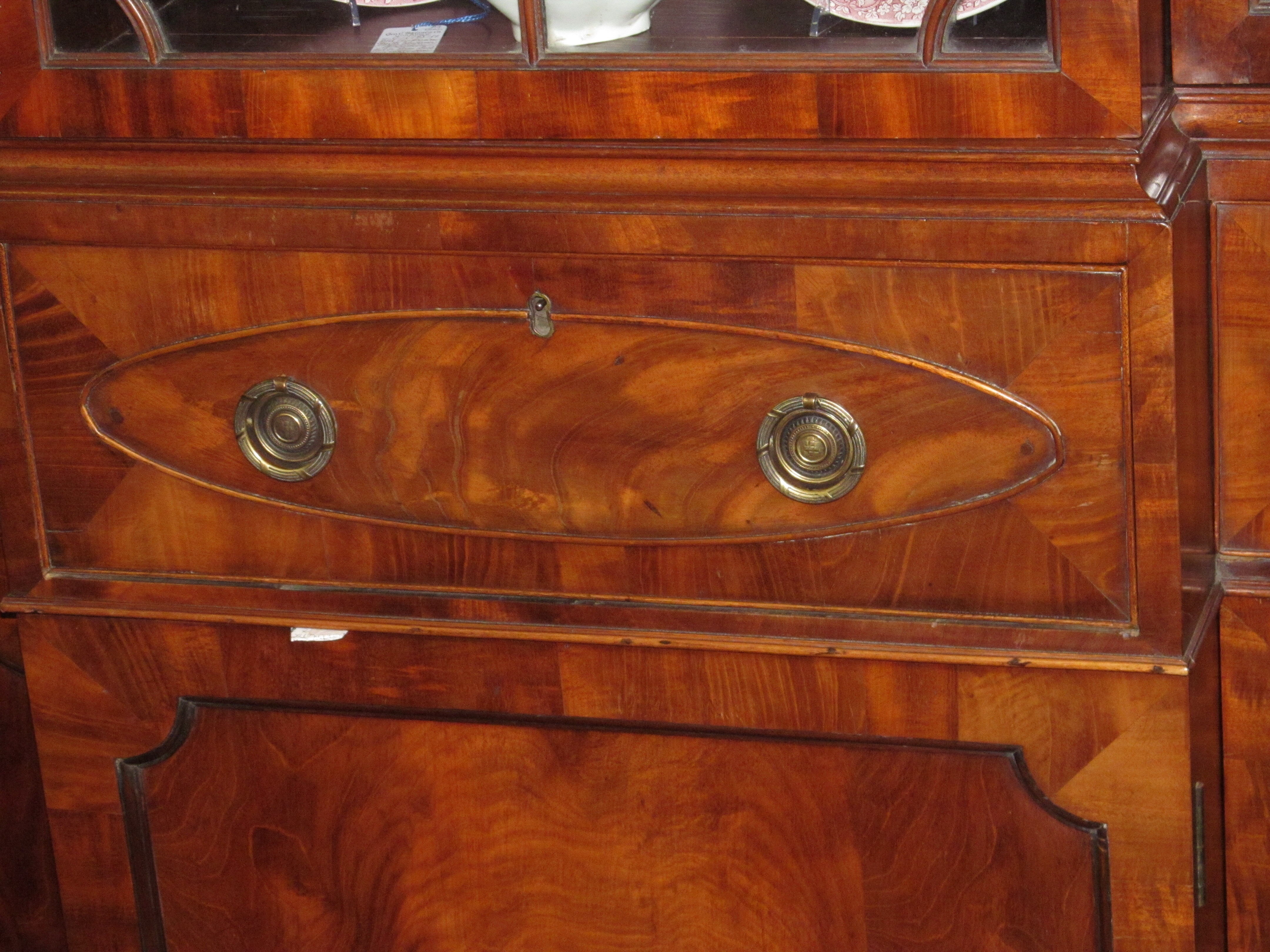 Fabulous Quality Old English Inlaid Figured Mahogany Breakfront Bookcase with secret drawer.