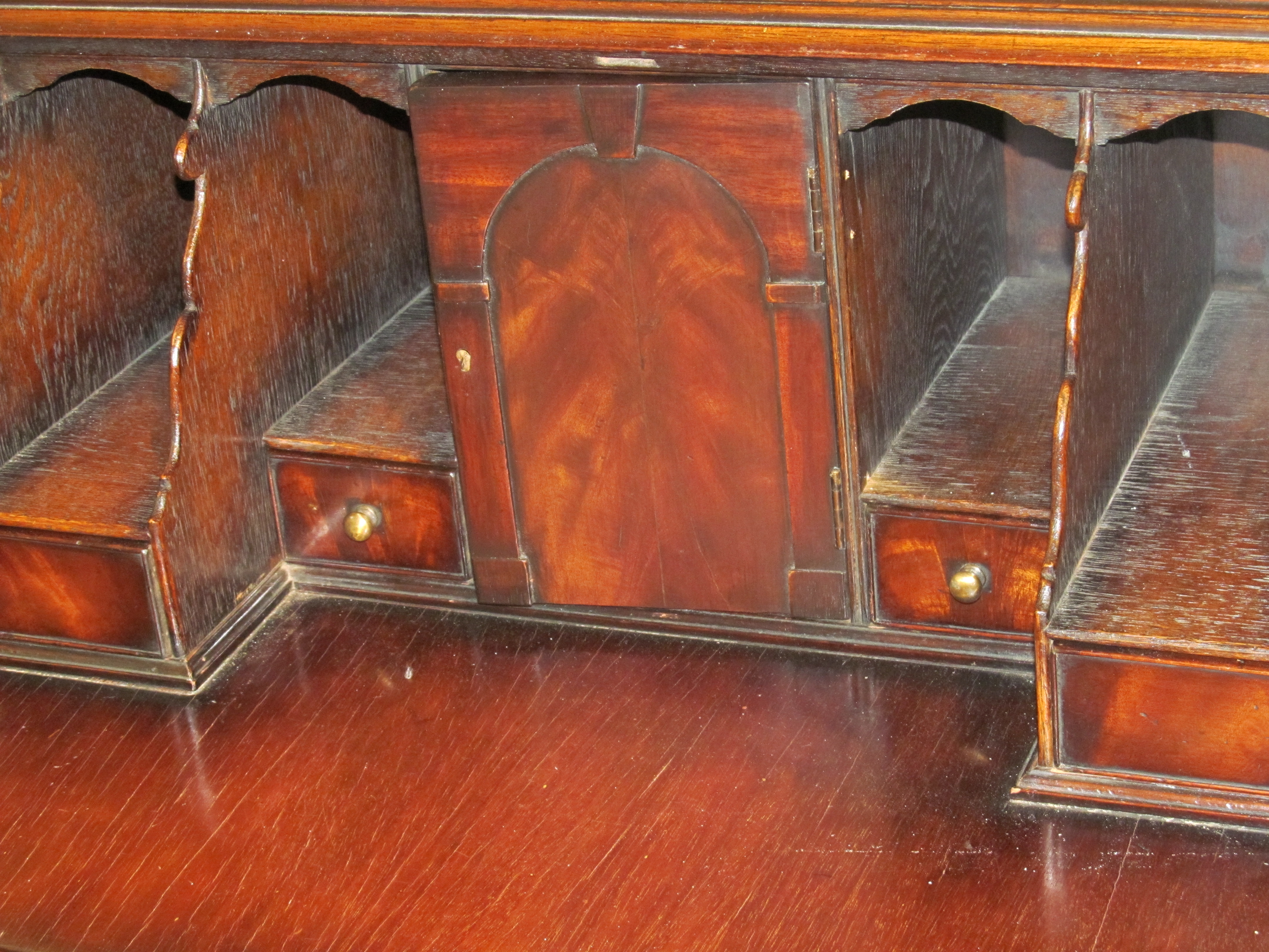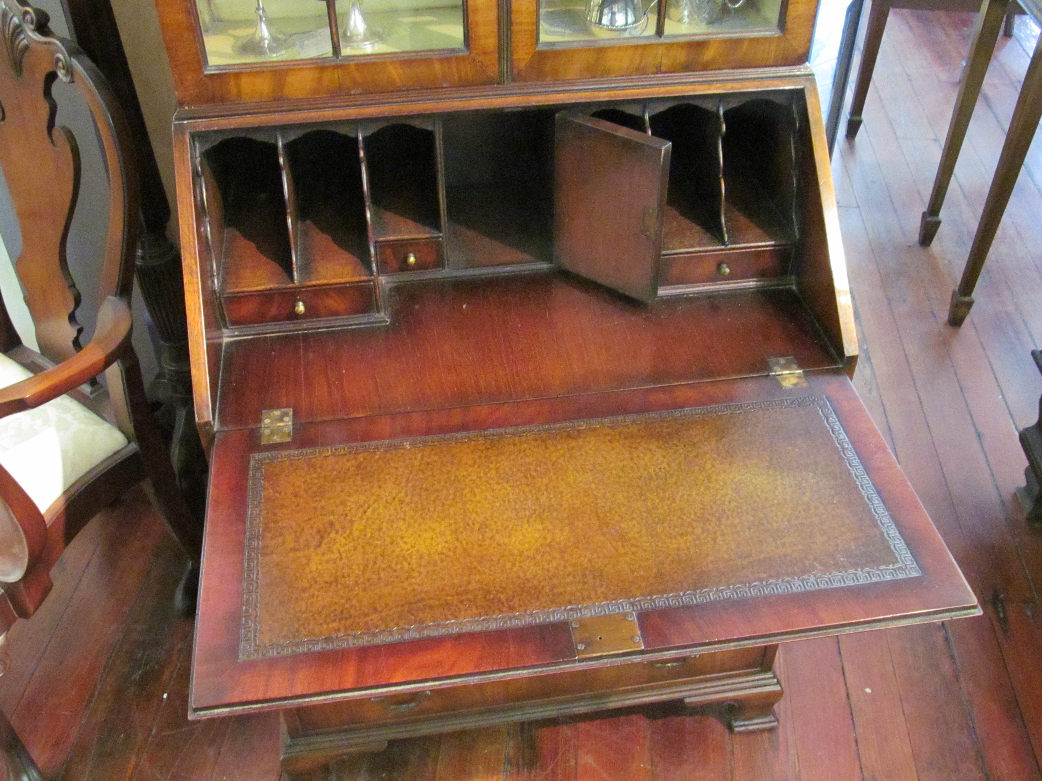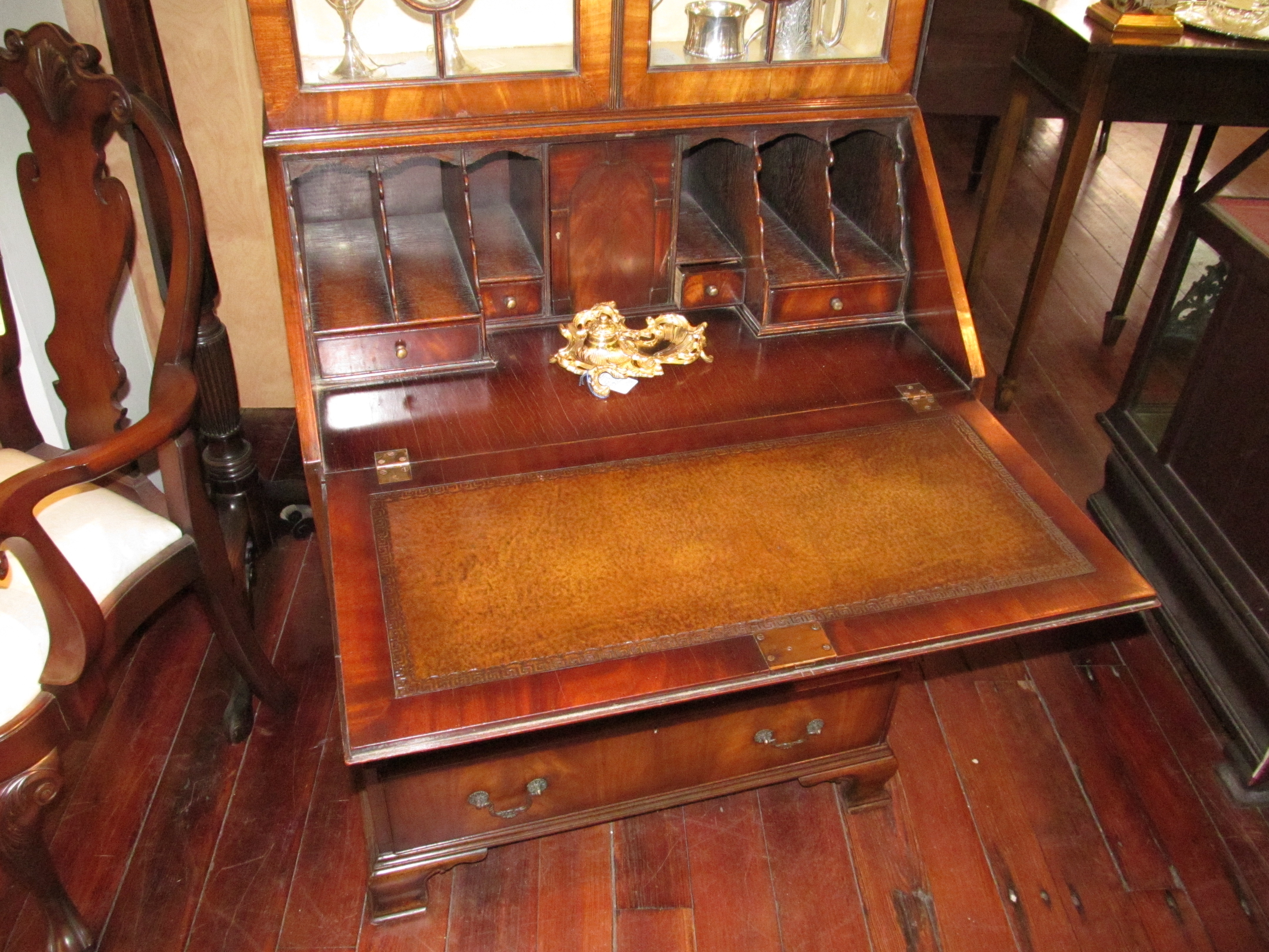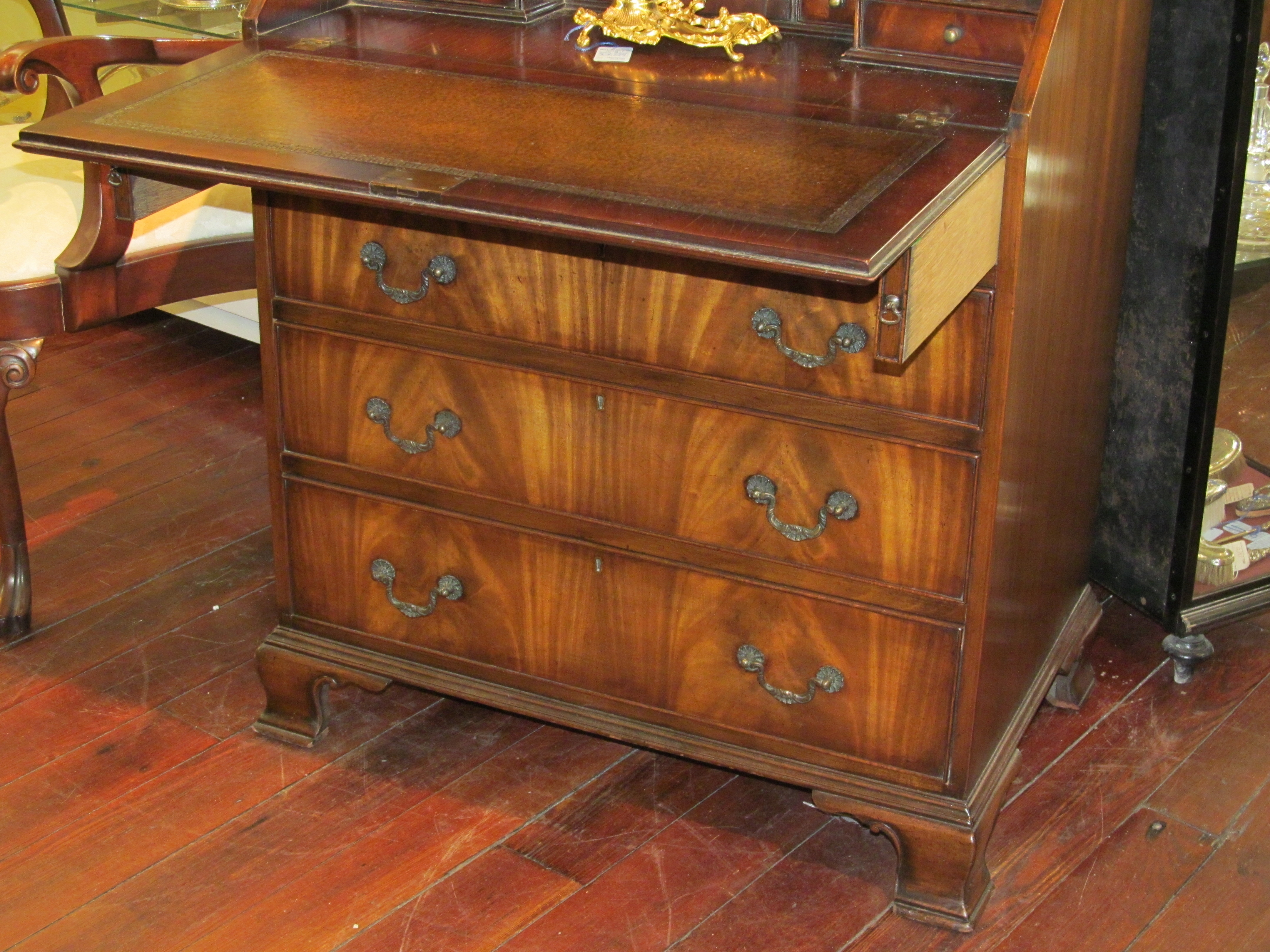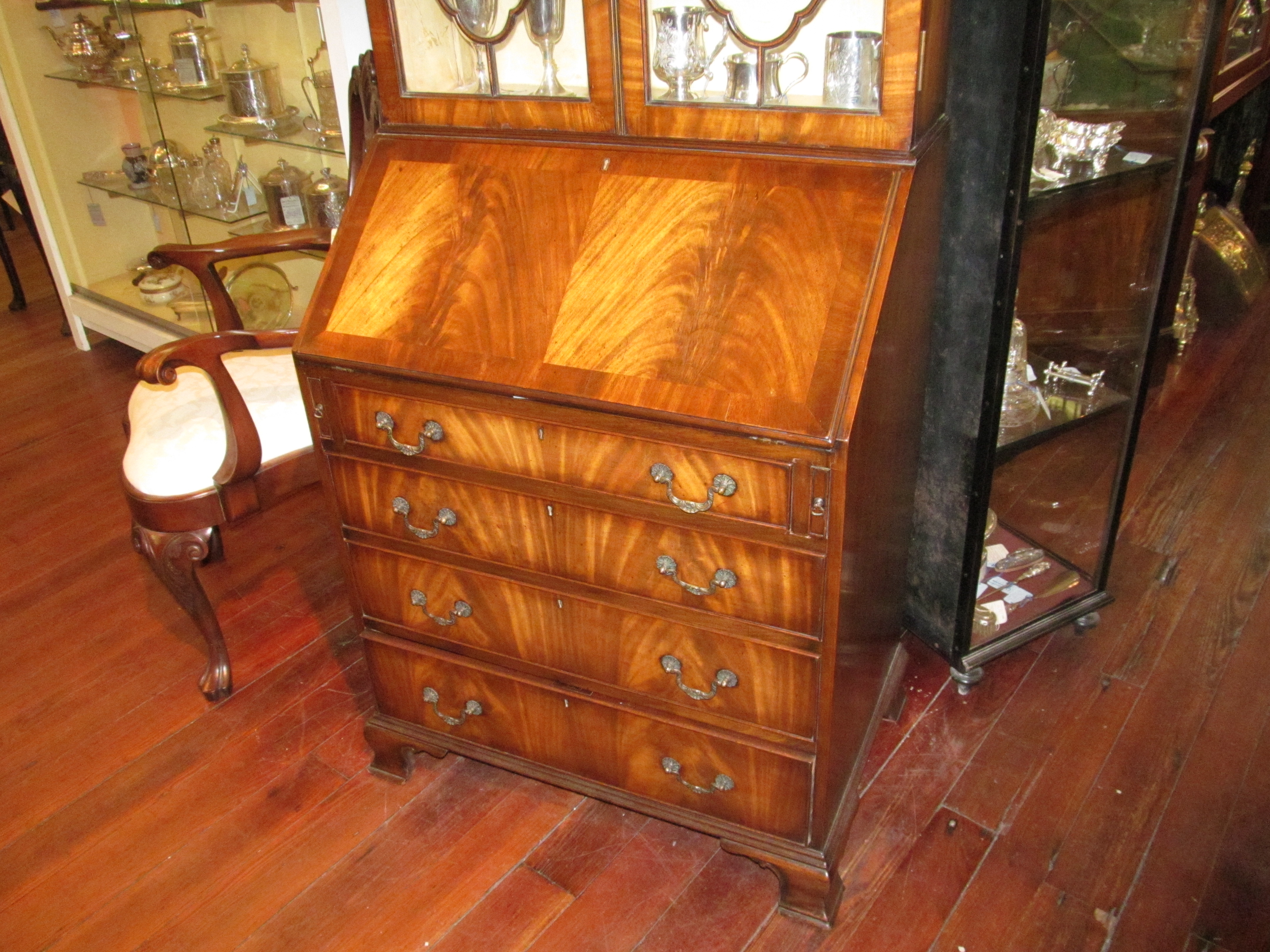 Fine Old English Crotch Mahogany Chippendale Style Bureau Bookcase.