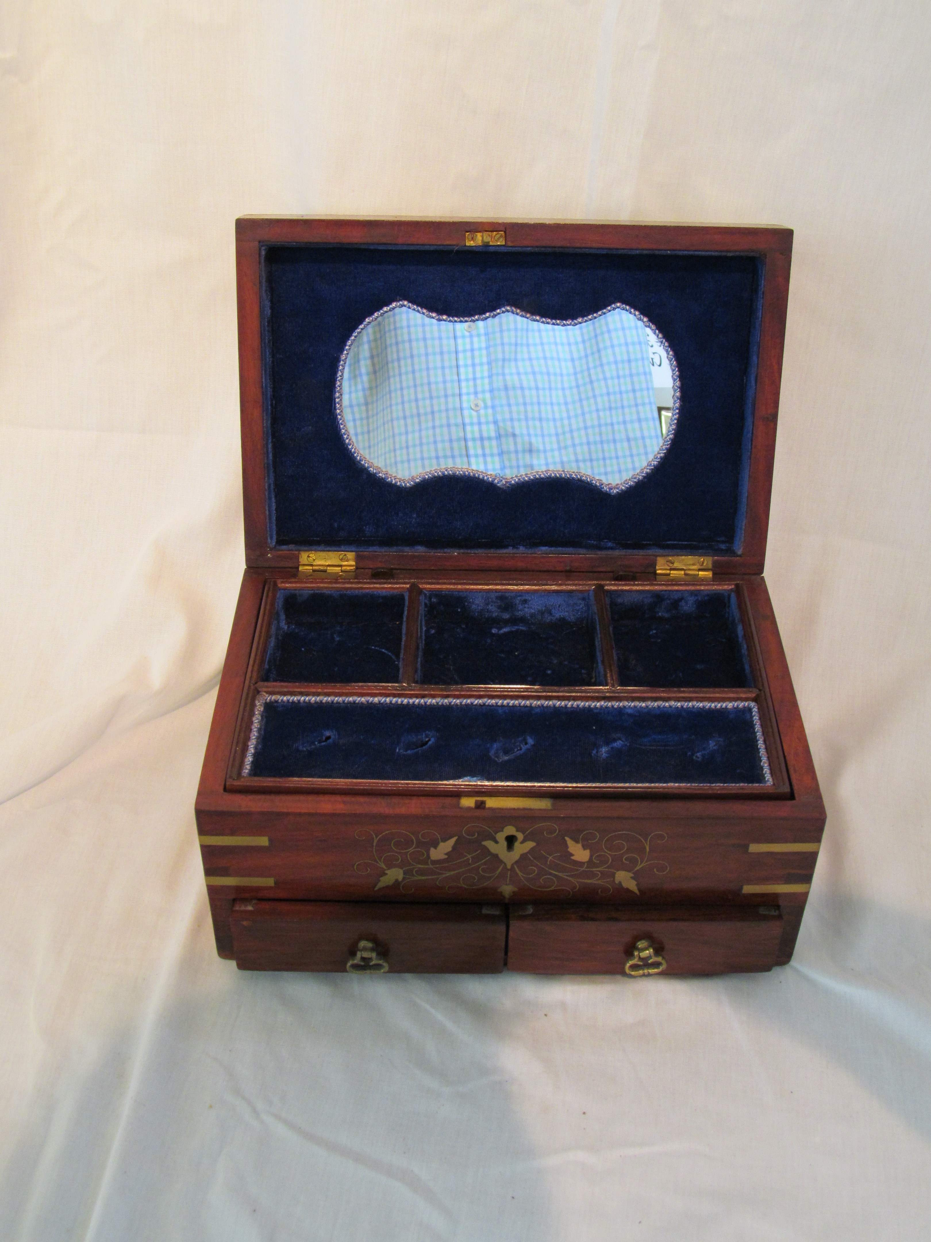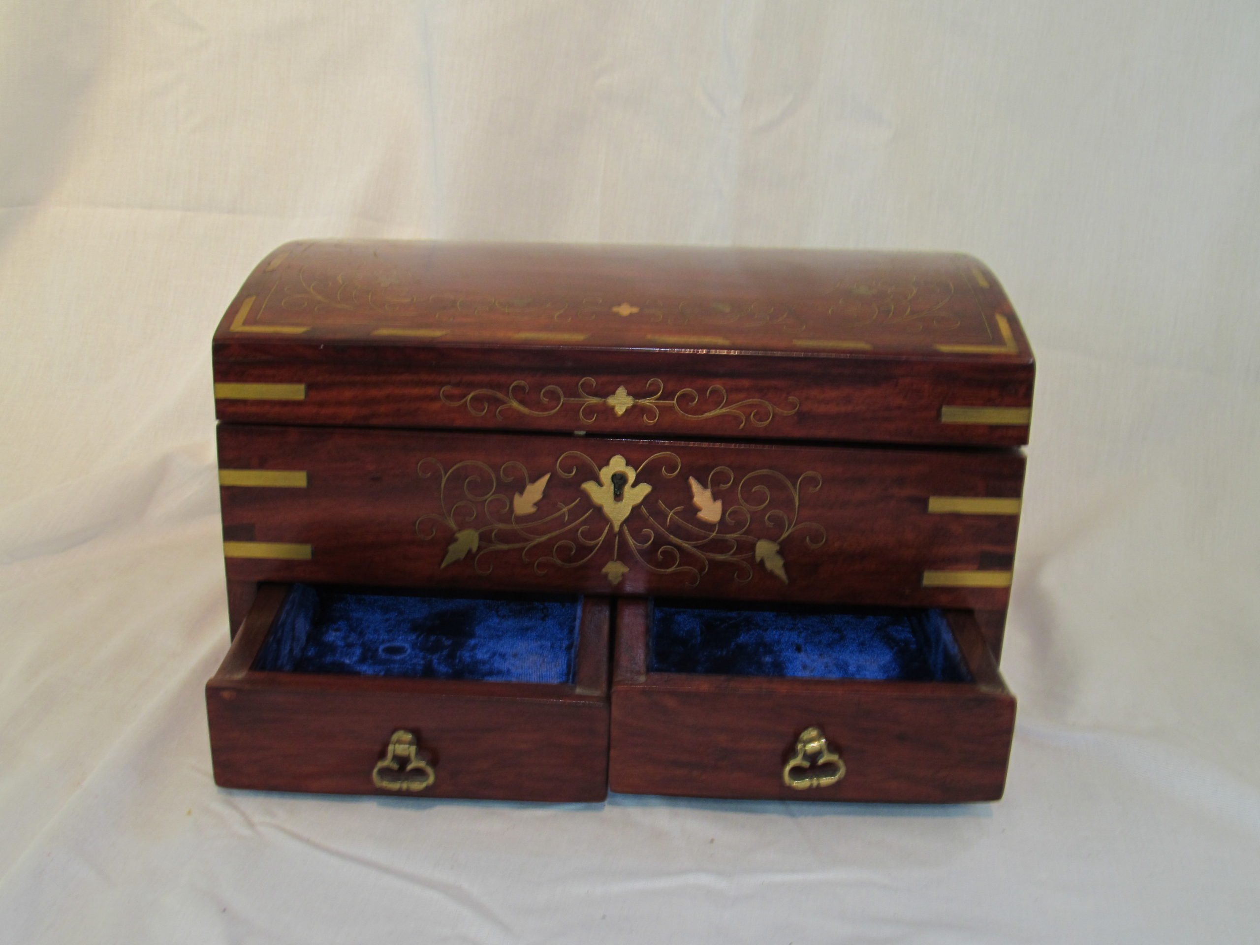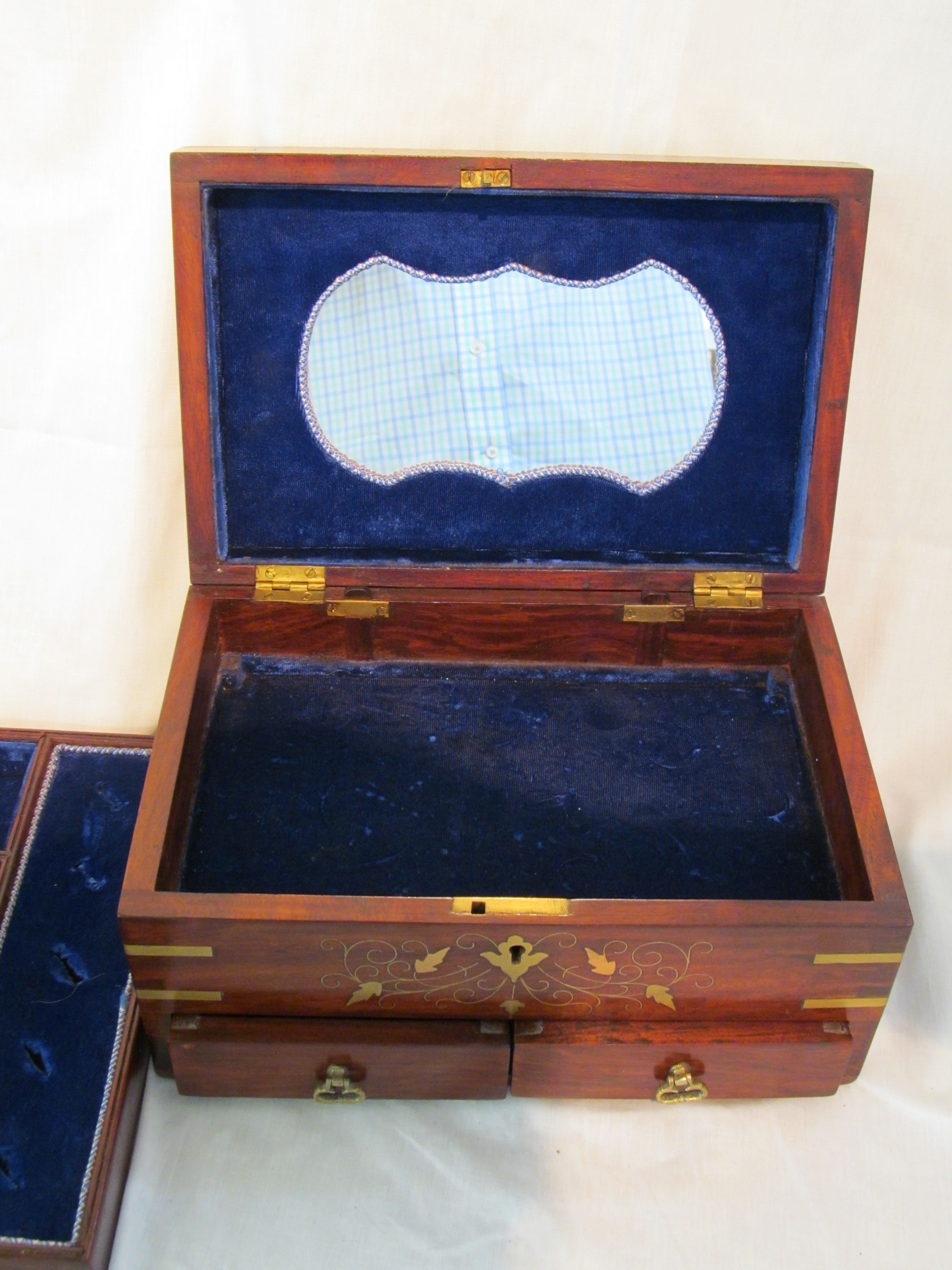 Fine Old Asian Brass Inlaid Rosewood Fitted Jewelry Chest.