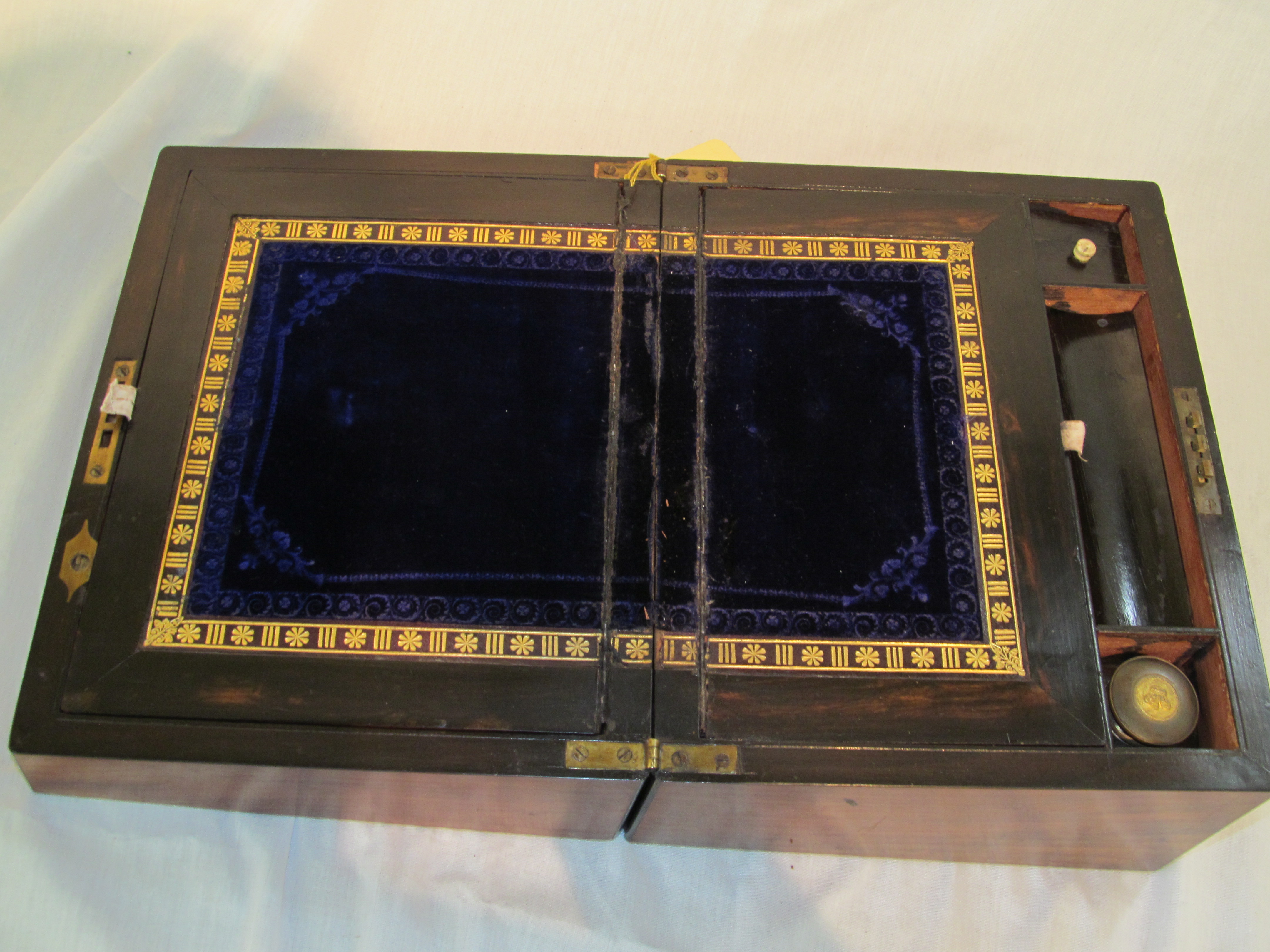 * Has original “cut velvet” and leather bordered writing surface and ink bottle.