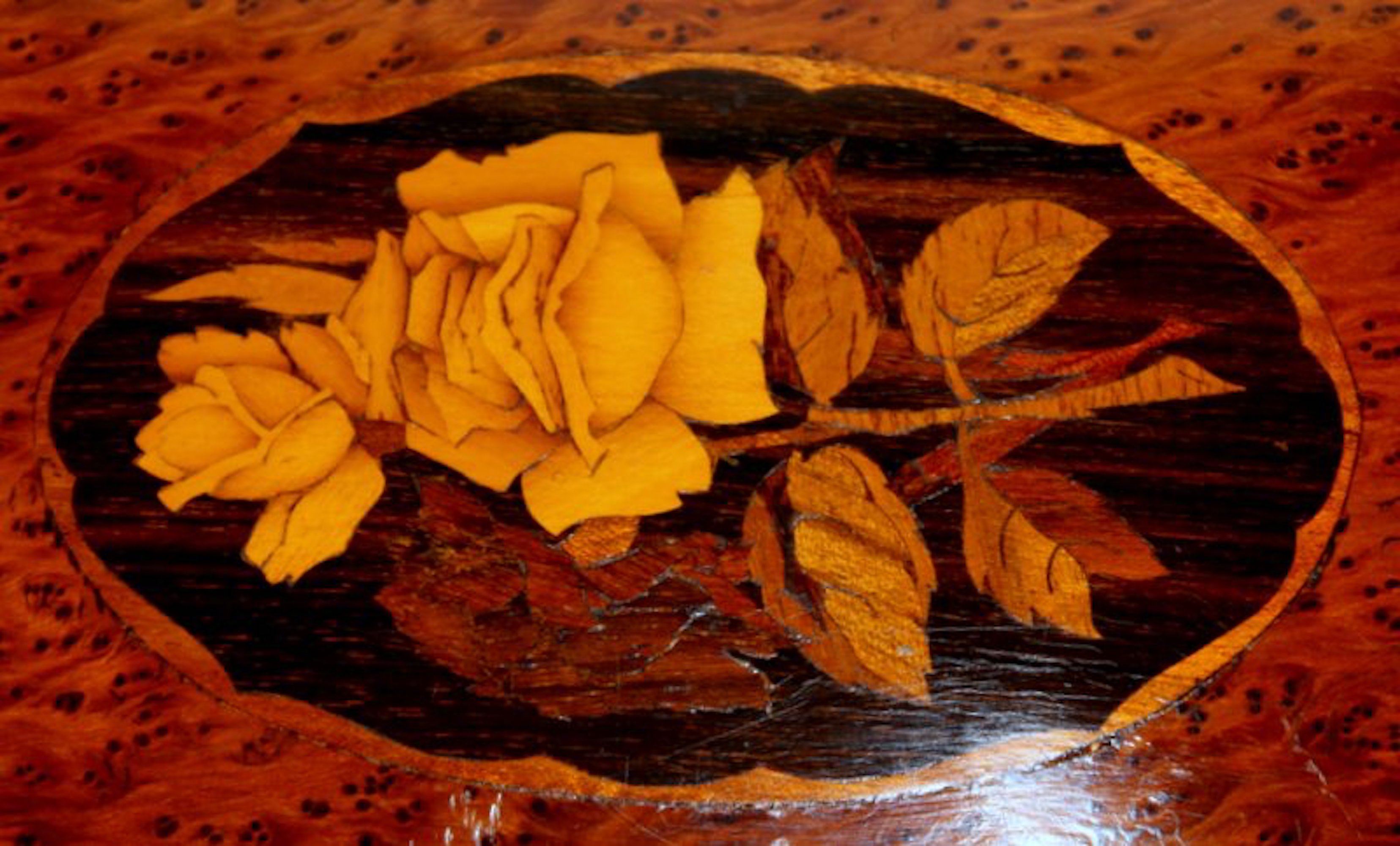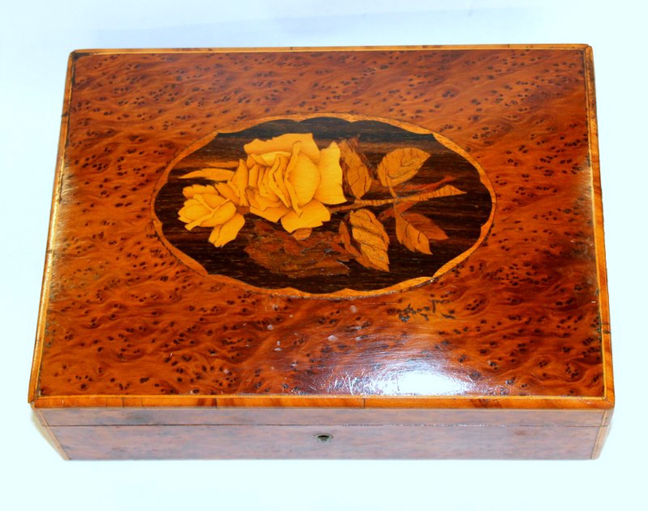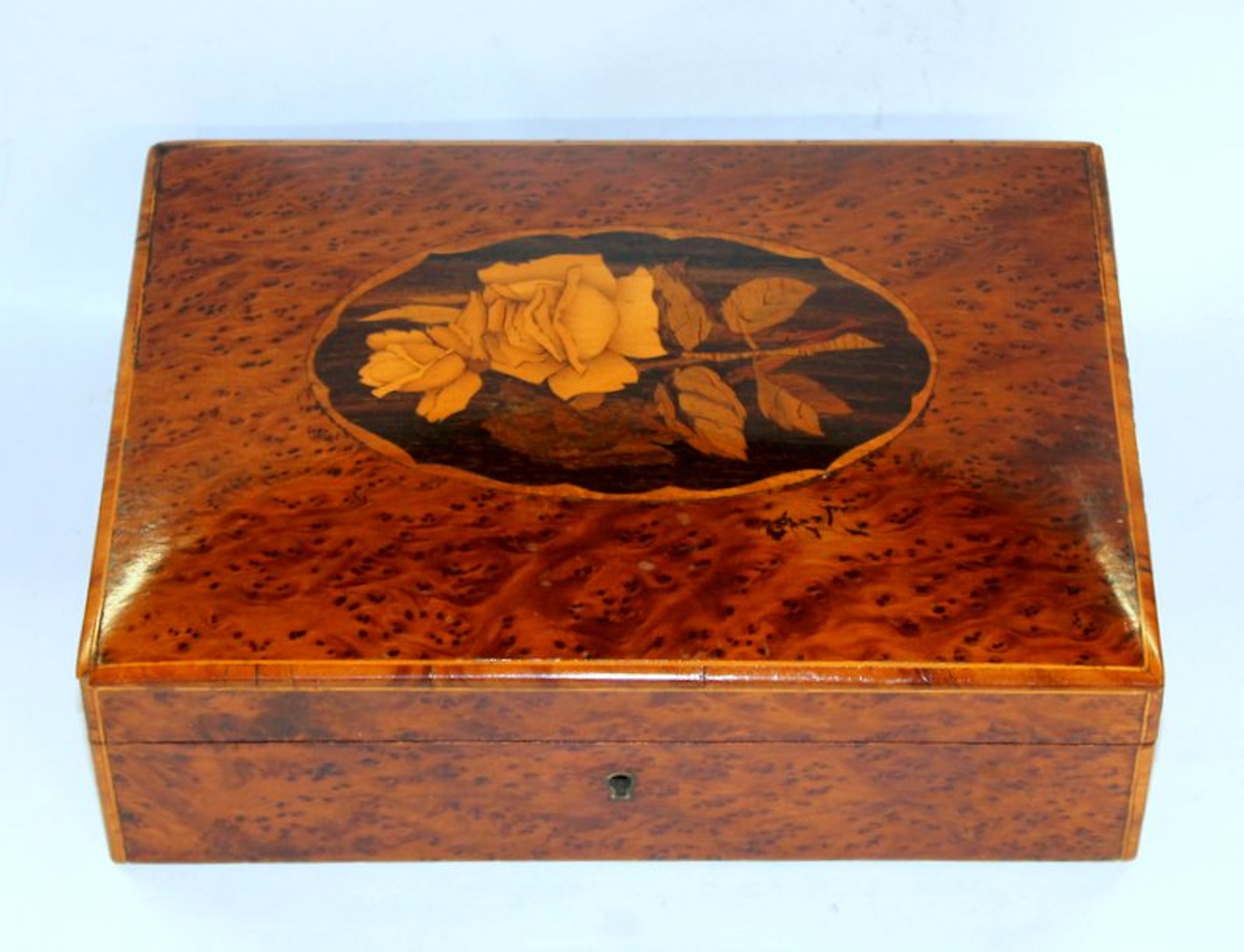 SKU: 7350-134 Categories: All Inventory, Boxes and Lapdesks, Furniture Tags: Box, Marquetry, pippy, trinket, yew