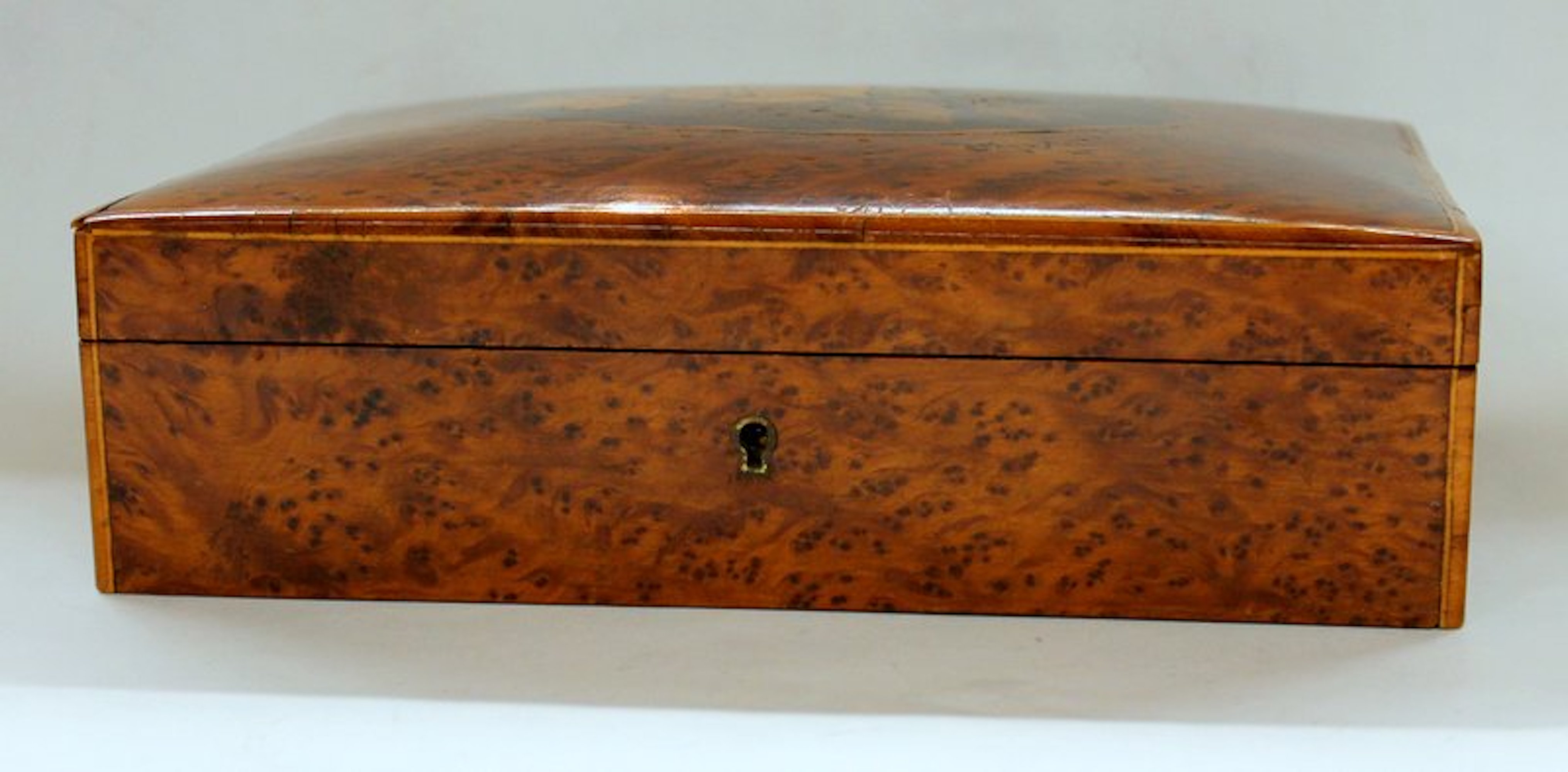 Superb Old English Marquetry Inlaid Pippy Yew Dome Top Trinket Box