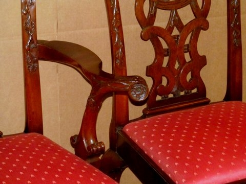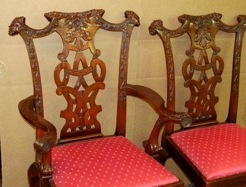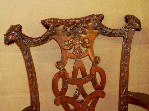 Fabulous Quality Set of 12 (10 sides, 2 arms) hand carved solid mahogany “Irish Chippendale” style Dining Chairs