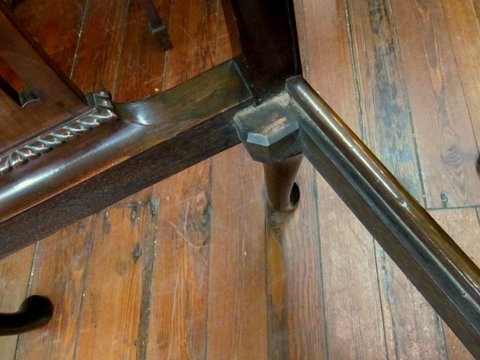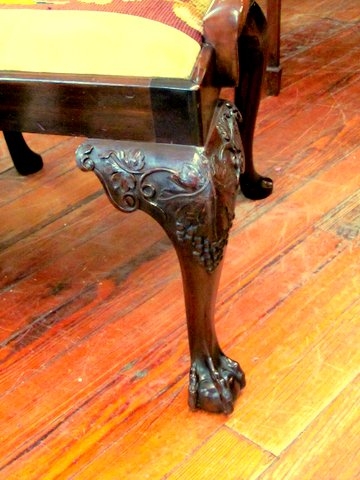 Please note exceptionally crisp and deeply hand carved cabriole legs, back splats and “parchment scroll” ears. Also, please note handsome needlepoint and velvet cushion.