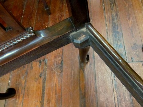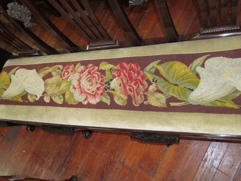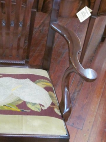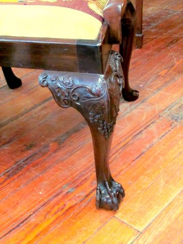 Please note exceptionally crisp and deeply hand carved cabriole legs, back splats and “parchment scroll” ears. Also, please note handsome needlepoint and velvet cushion