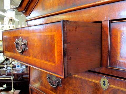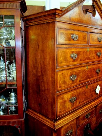 Fabulous Quality Antique English Geo. III Style Bookmatched and Herringbone Inlaid Burr Walnut Chest on Stand or Highboy