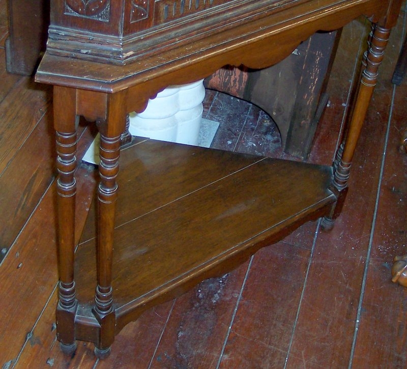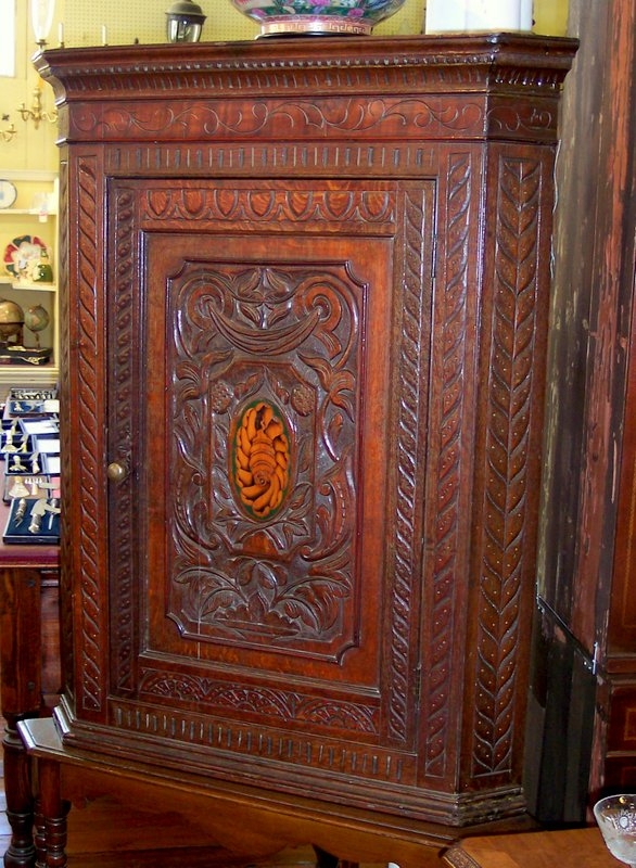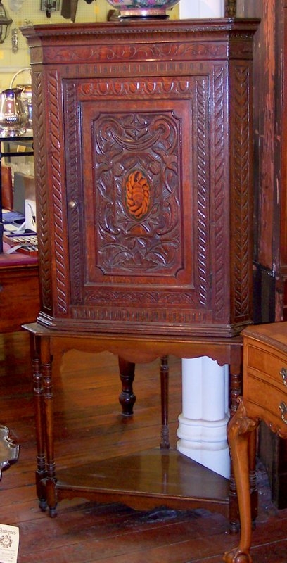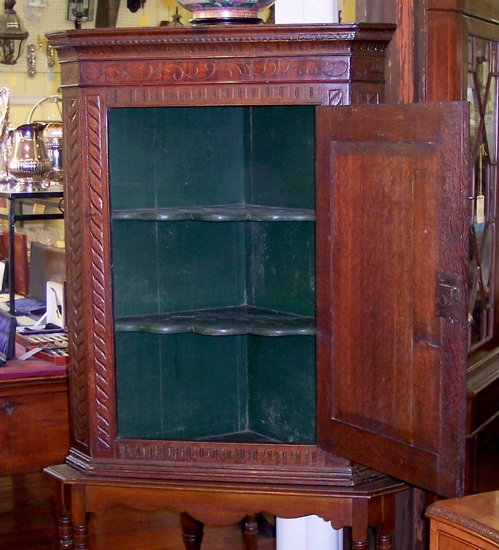 Fabulous Quality Antique English Inlaid Carved Oak Geo. III Hanging Corner Cupboard on later walnut stand
