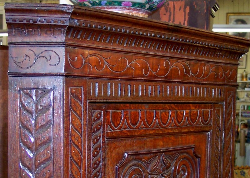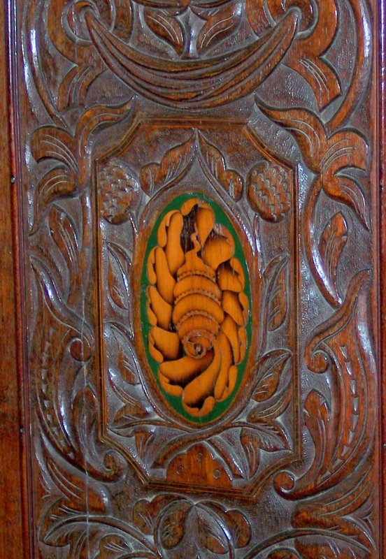 Please note exceptional carving on various woods of oak, elm and mahogany and satinwood conch inlay!