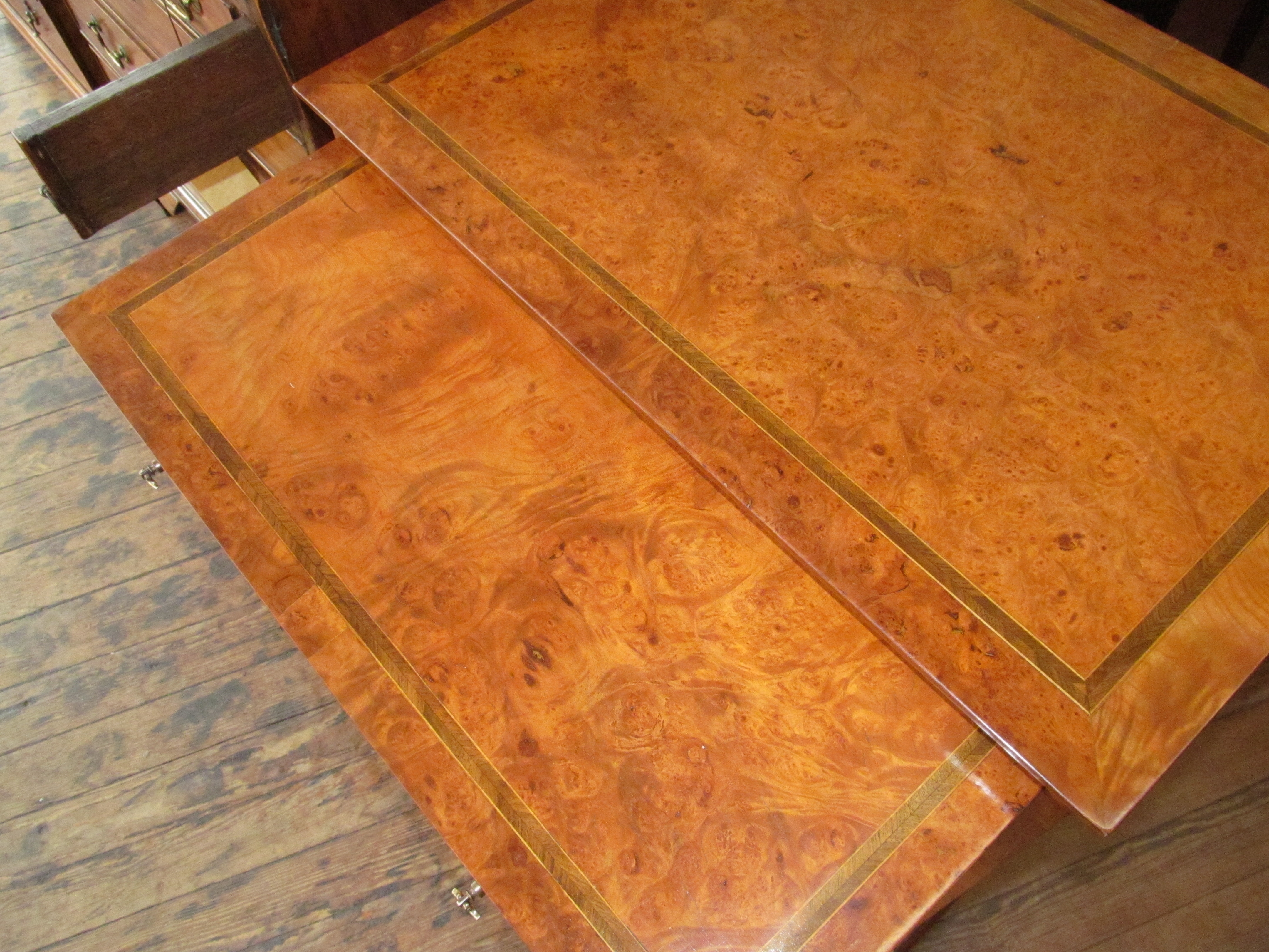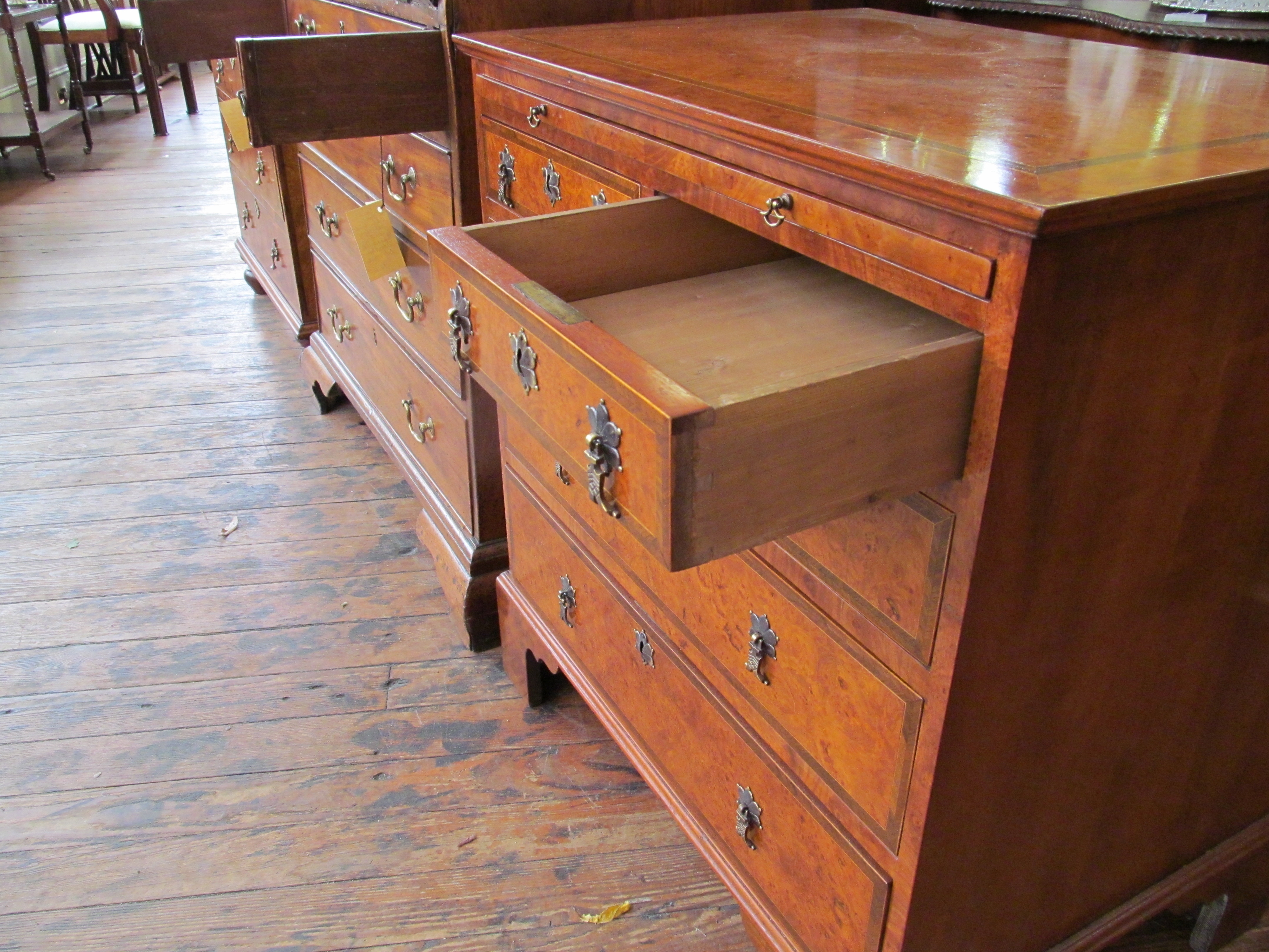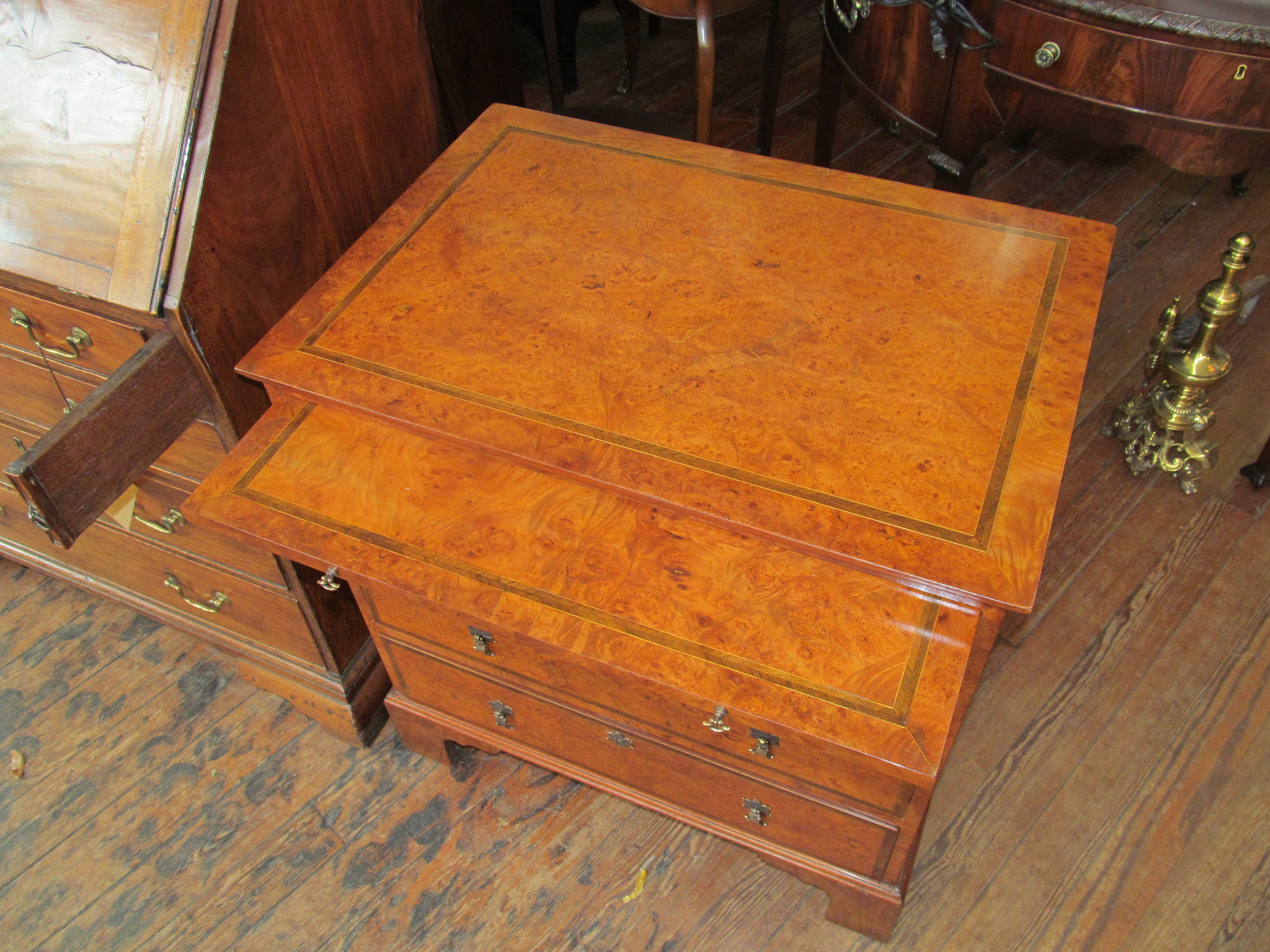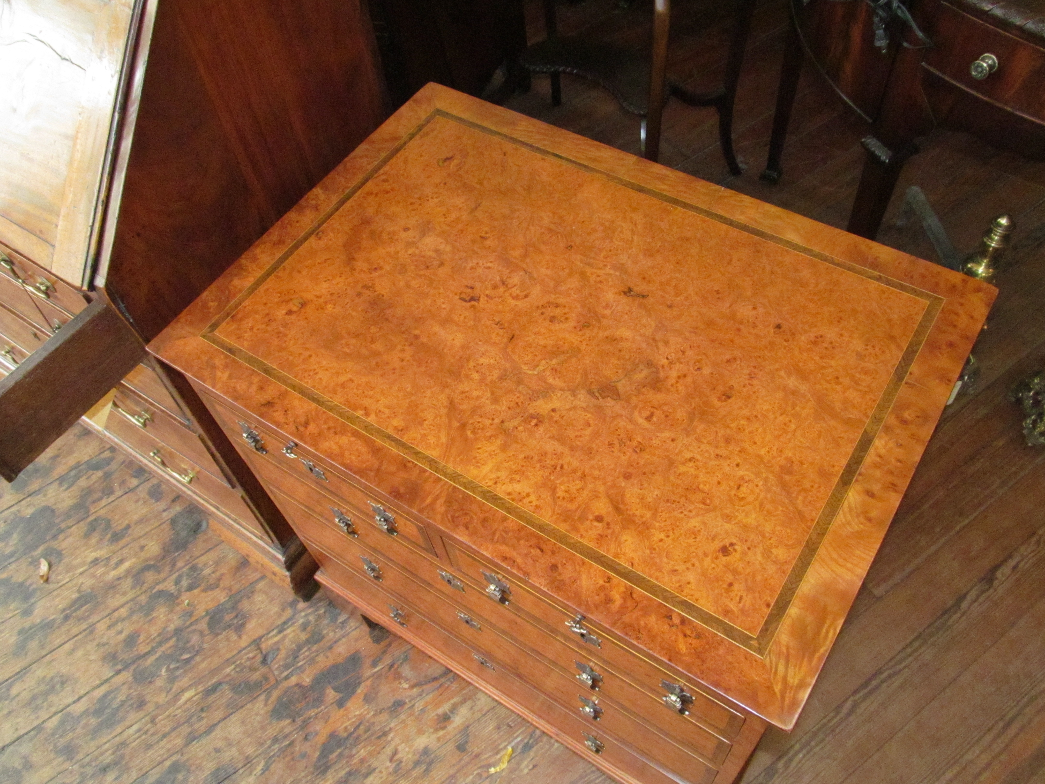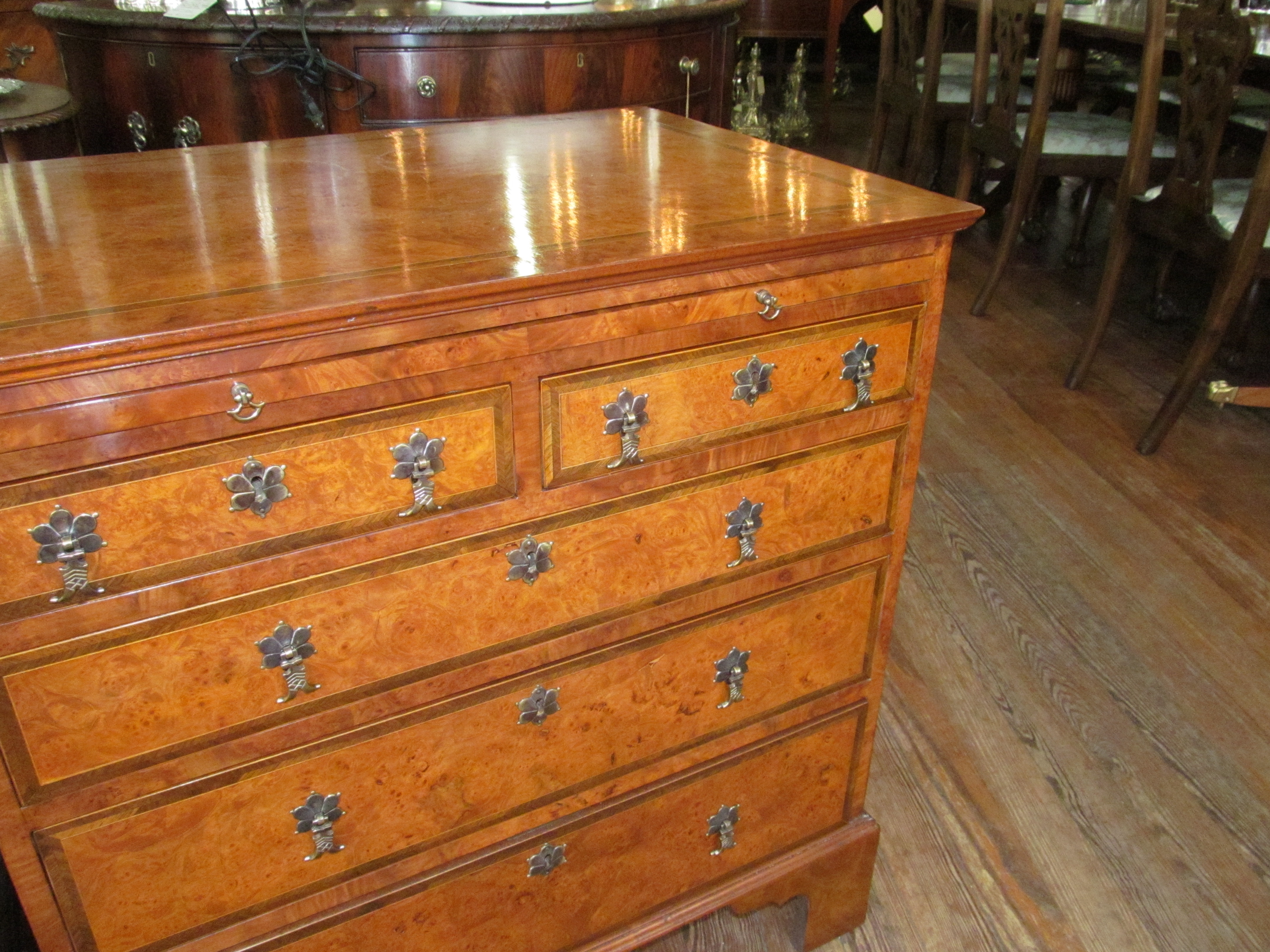 Superb Quality Antique English Inlaid Burr Elm Queen Anne Style Bachelor Chest with brushing slide.