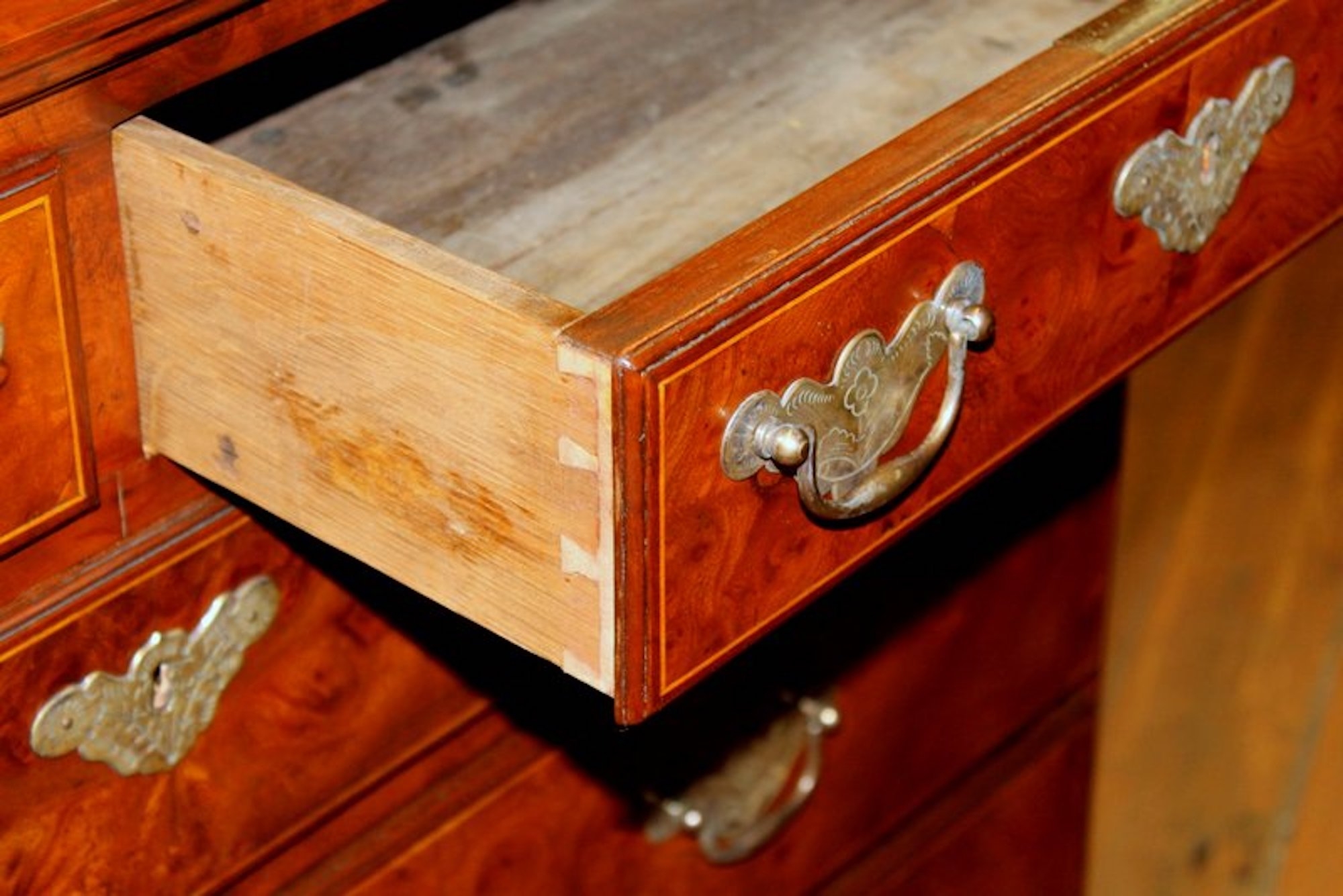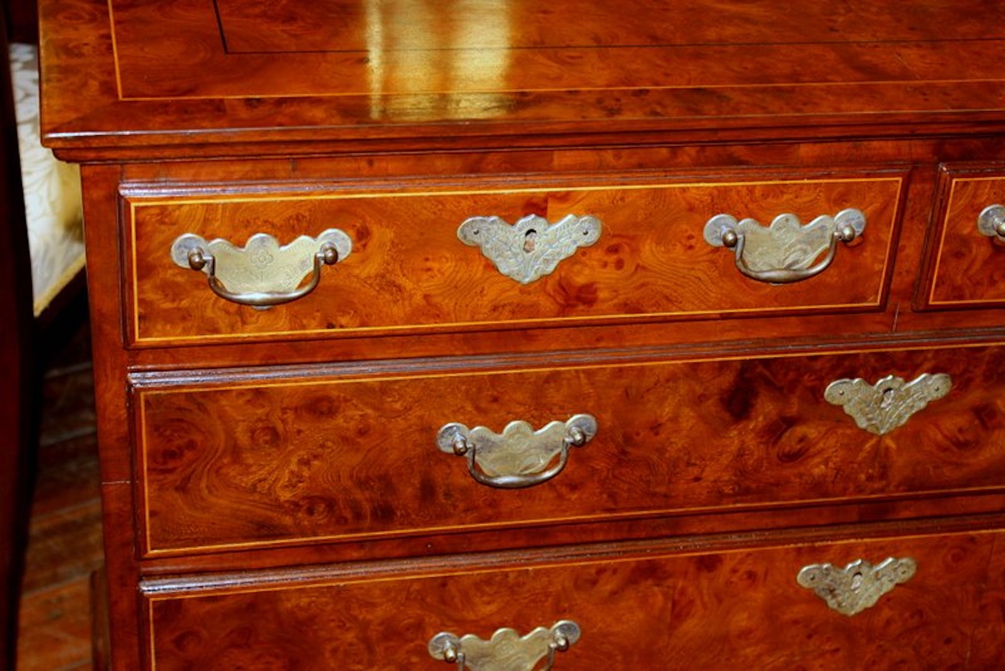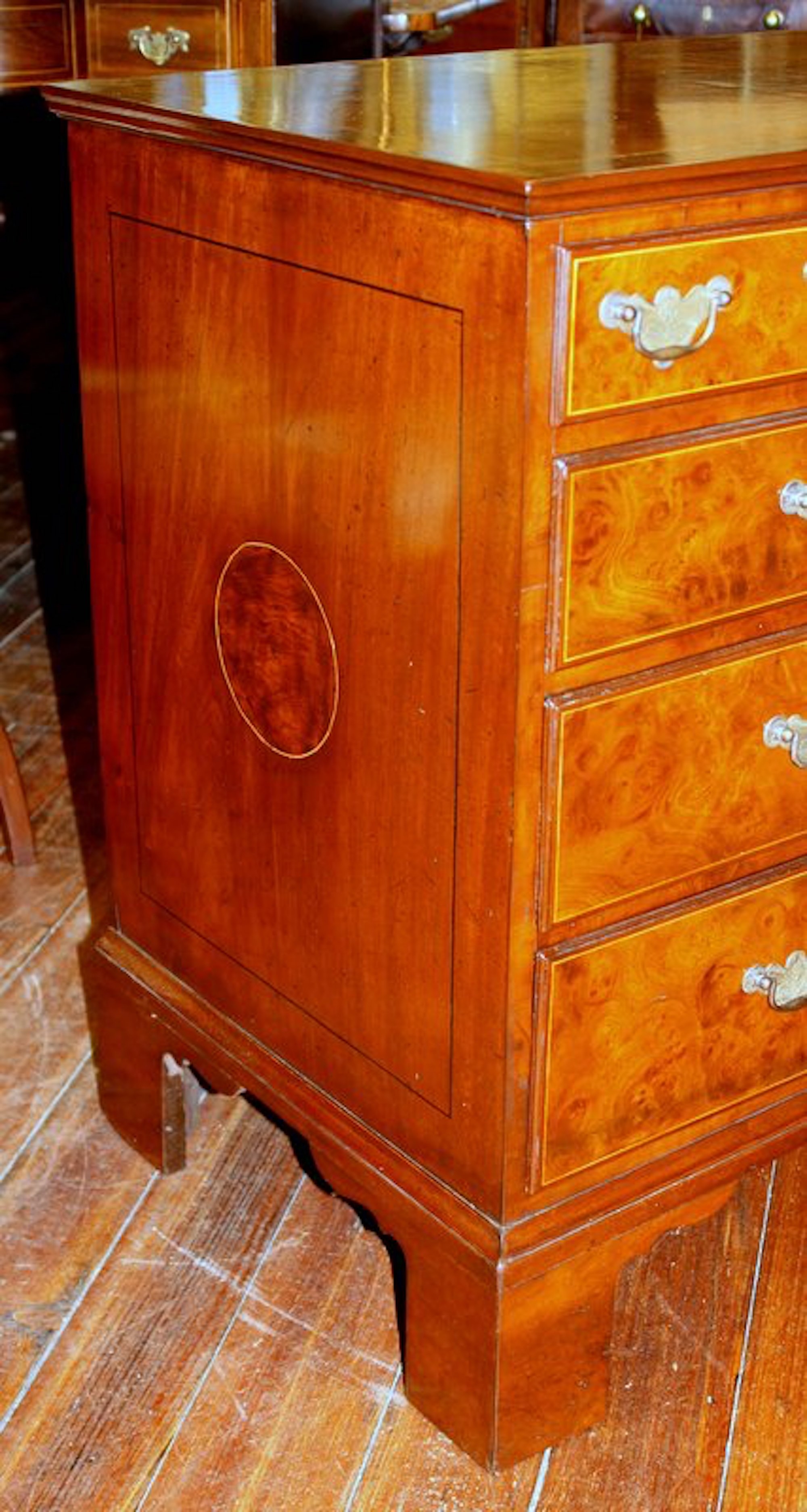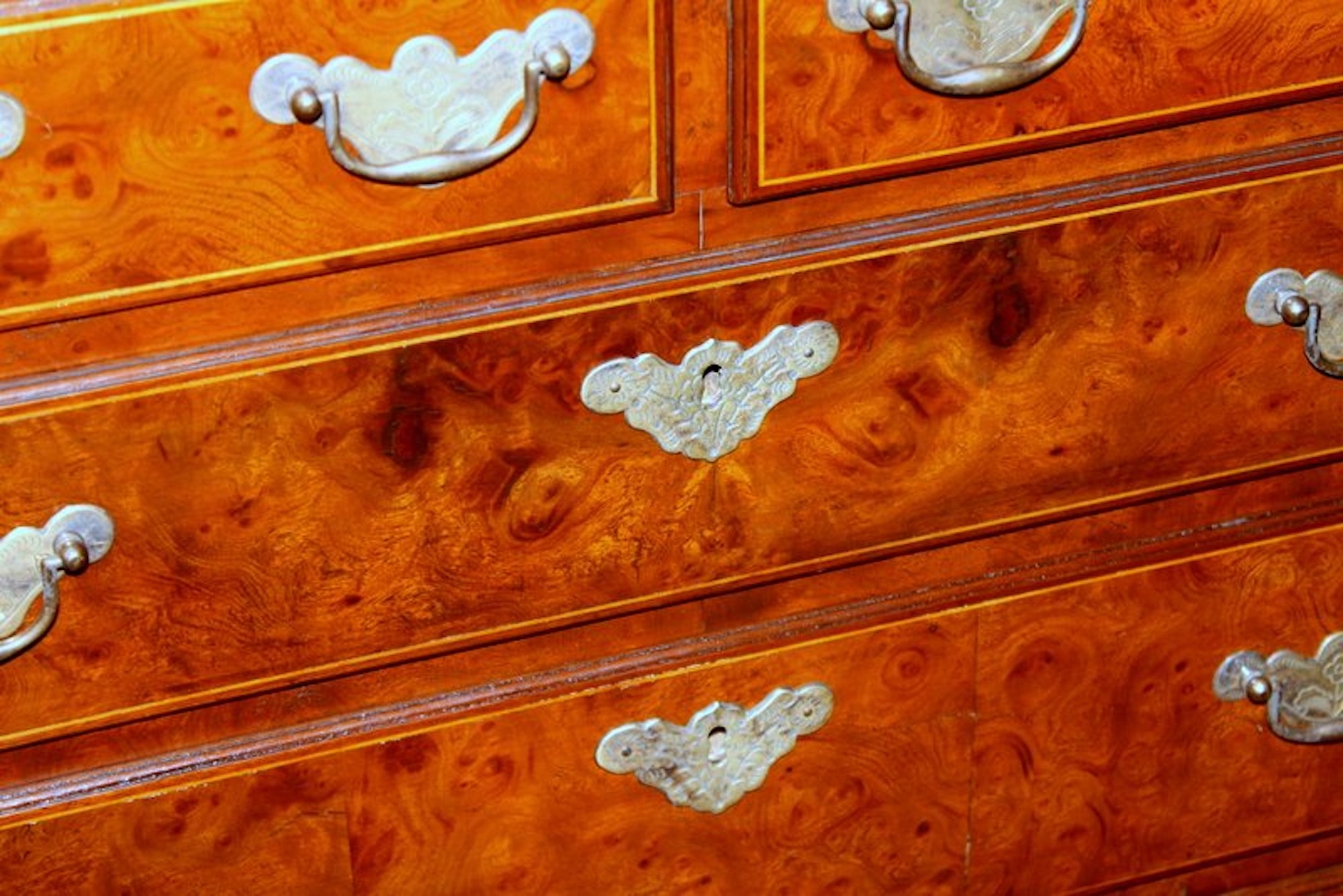 Exquisite Quality Antique English Inlaid Burr Walnut and Mahogany Sided Queen Anne Revival Low Chest of Drawers with handsome “period style” brasses.