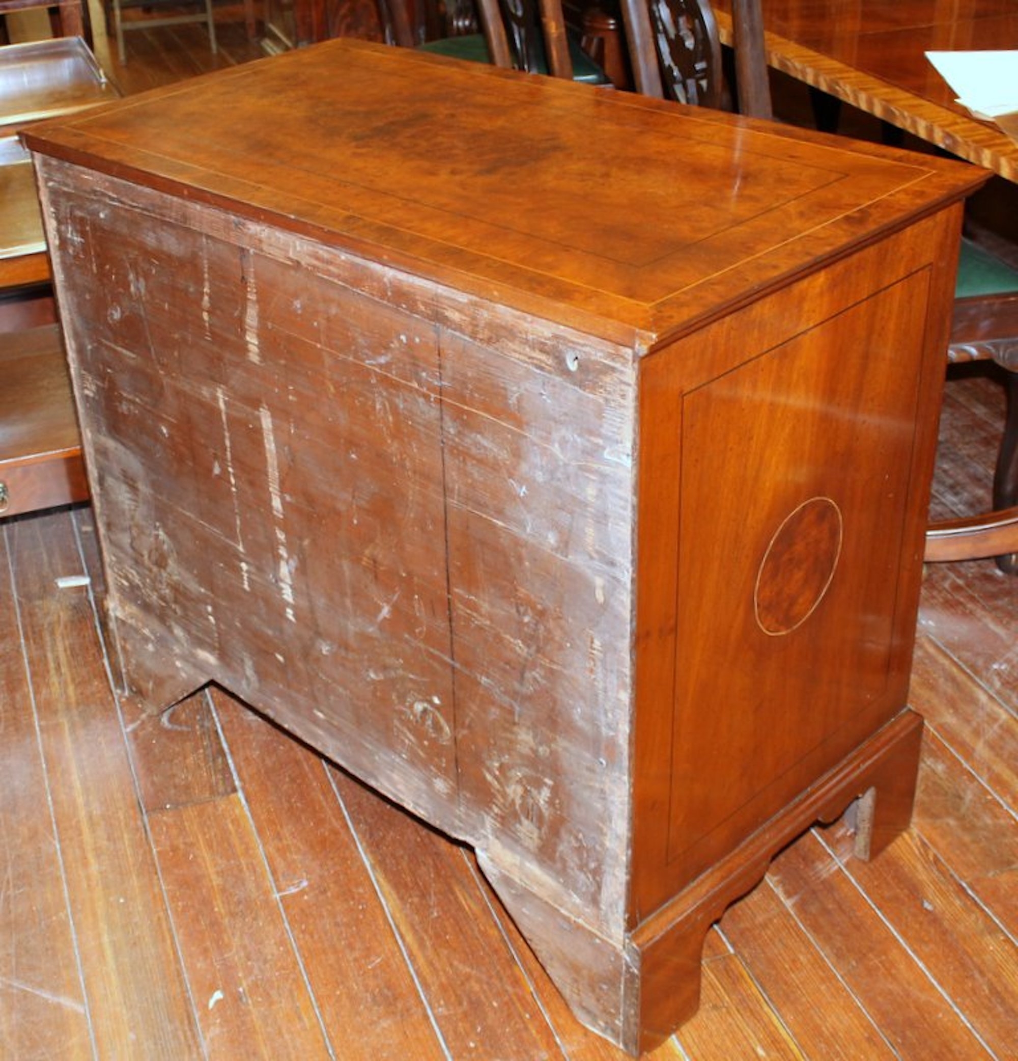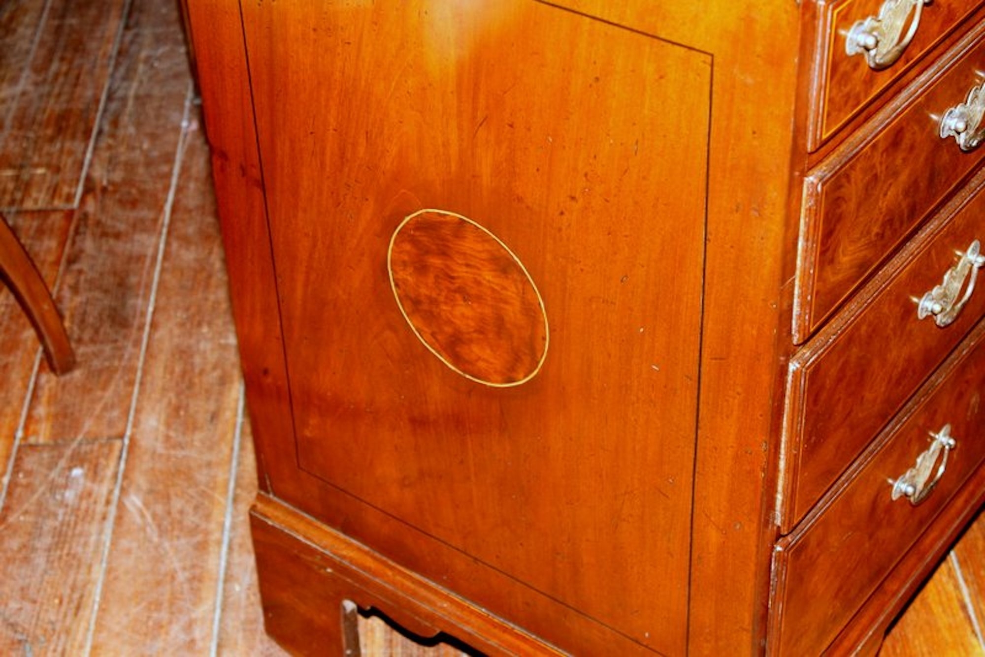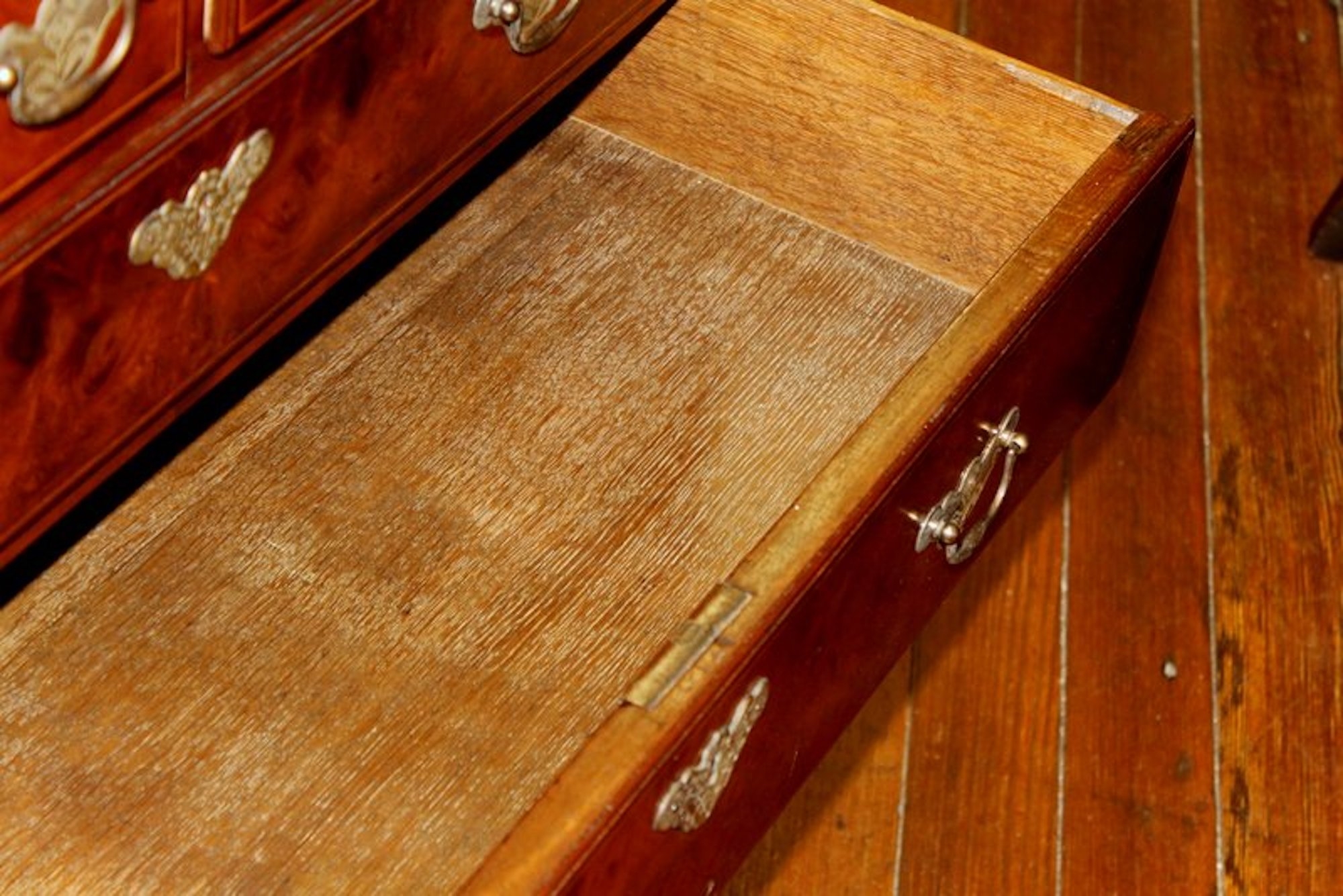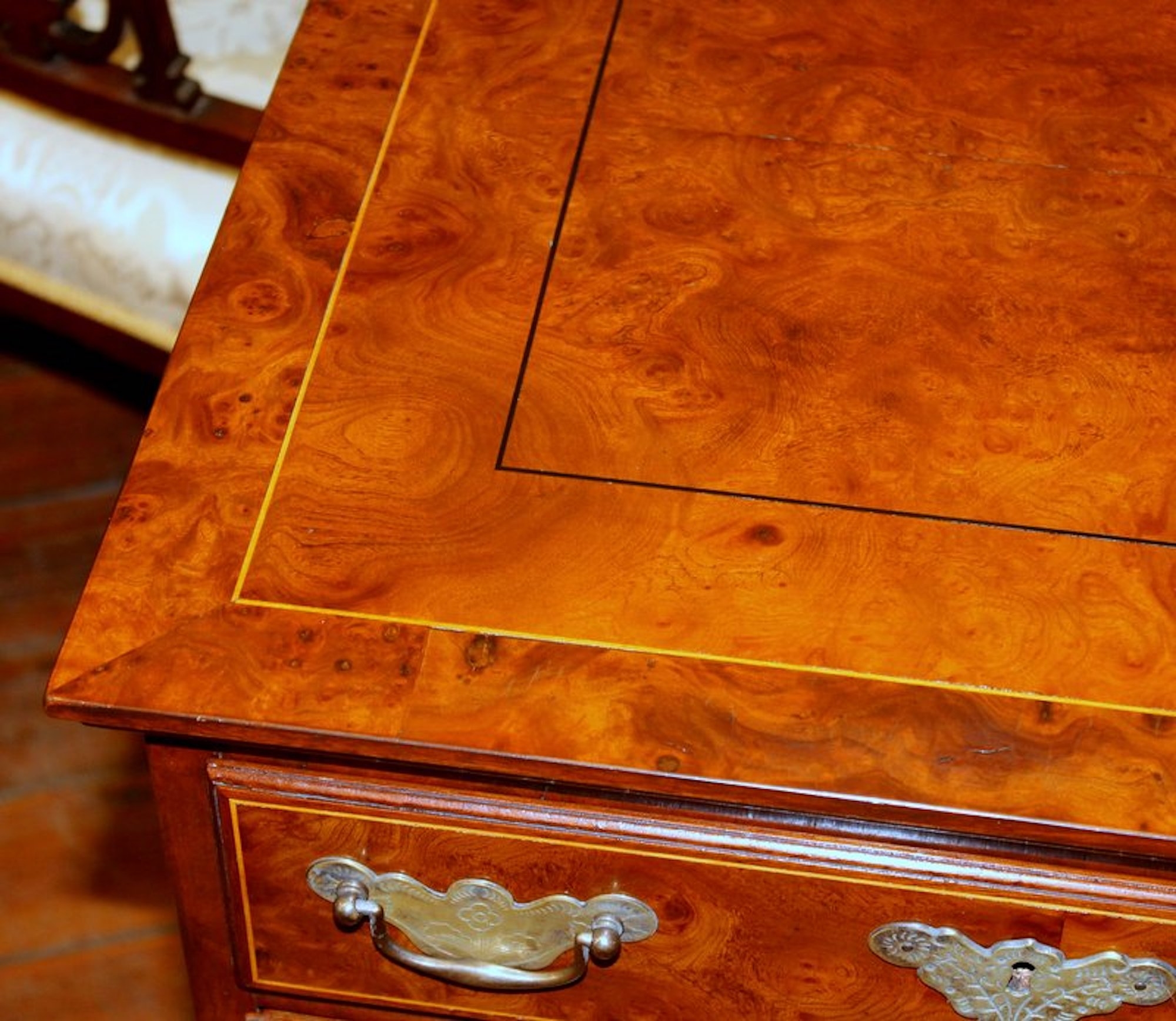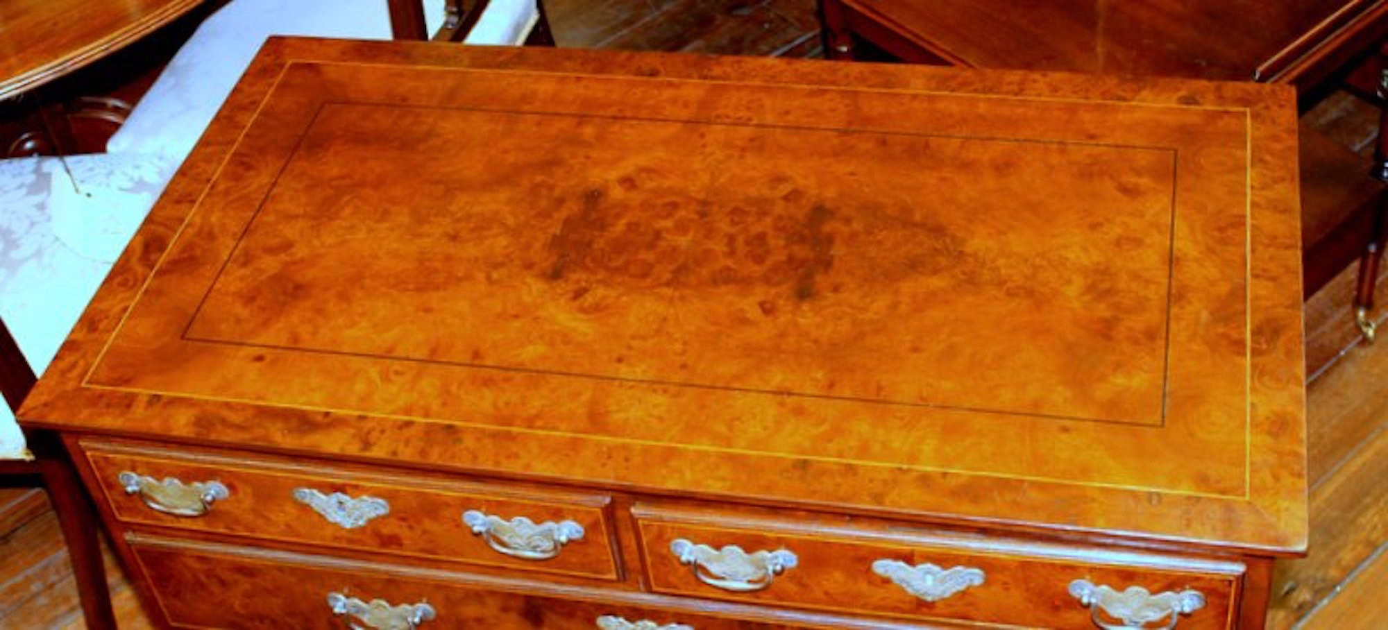 Exquisite Quality Antique English Inlaid Burr Walnut and Mahogany Sided Queen Anne Revival Low Chest of Drawers with handsome “period style” brasses.