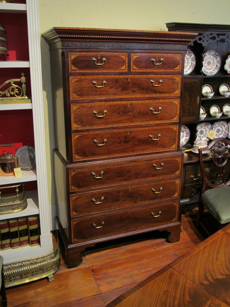 You are here: Home / All Inventory / Antique English Inlaid Chippendale Style Chest on Chest