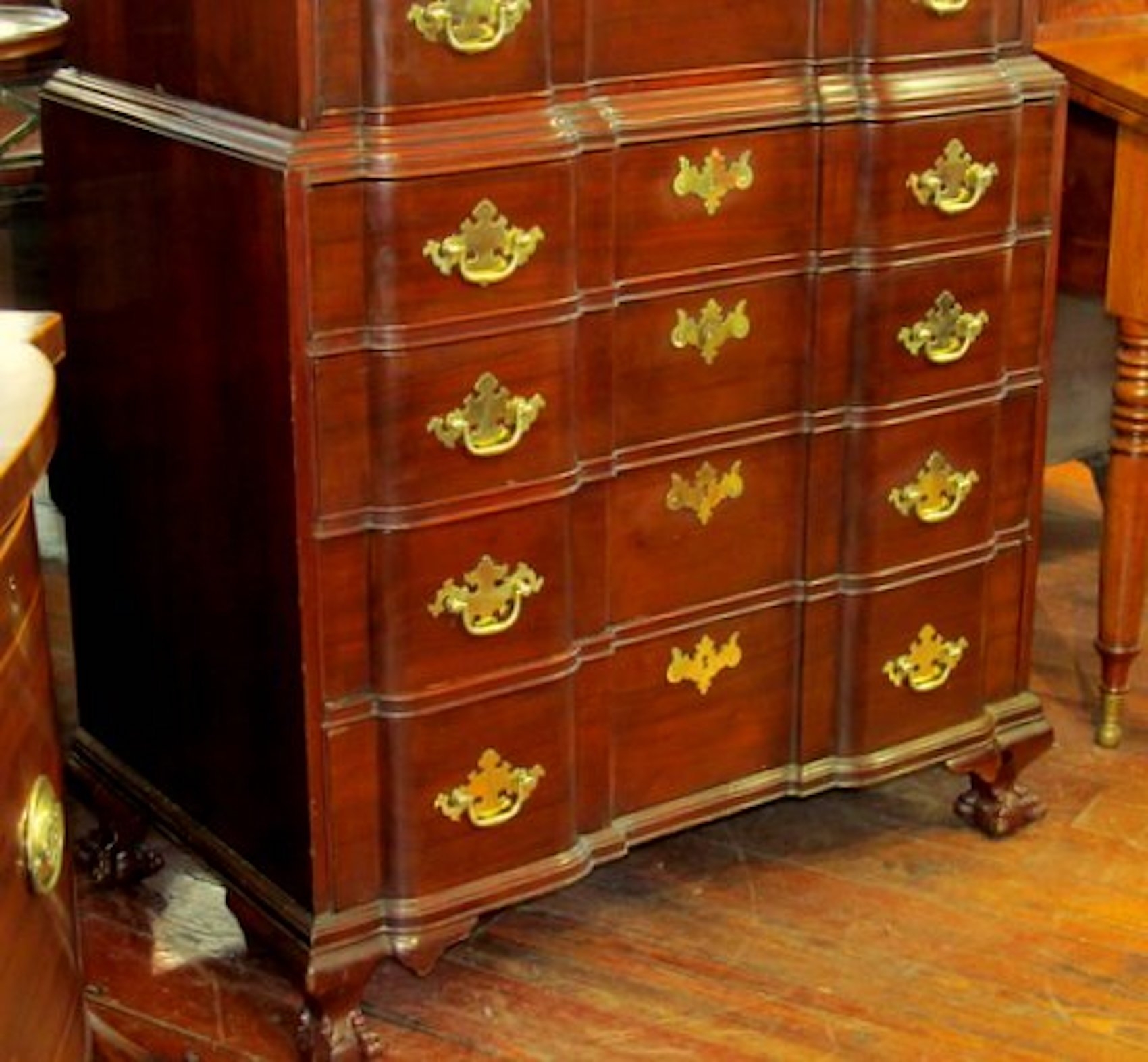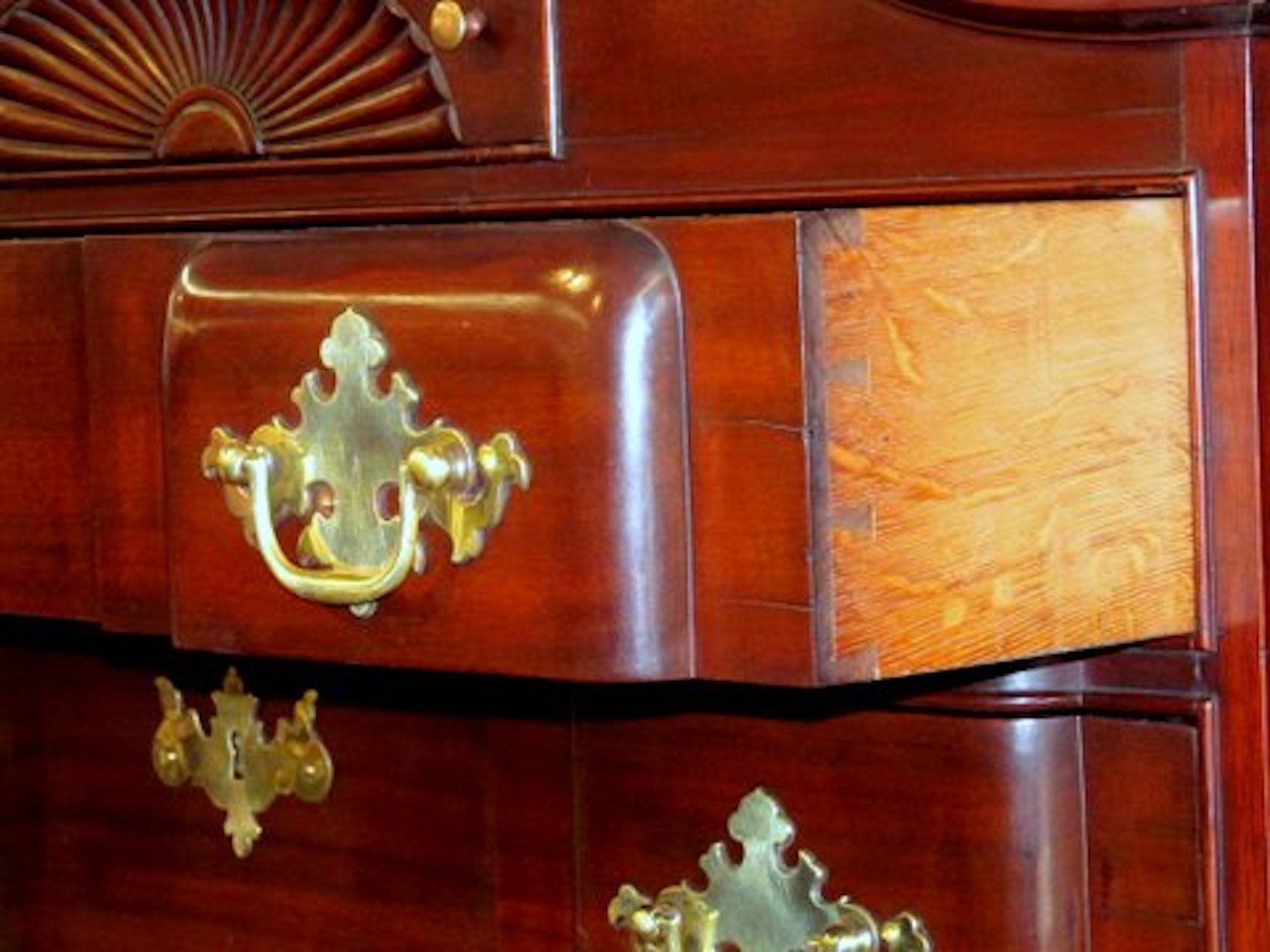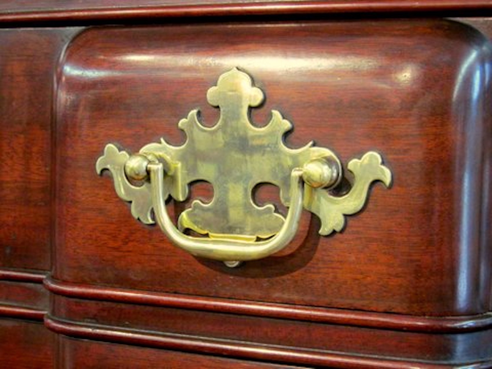 Please note hand dove-tailed, oak-lined drawers and original “Willow” or Chippendale Style Brasses. Also, hand carved concave shell in upper drawer.