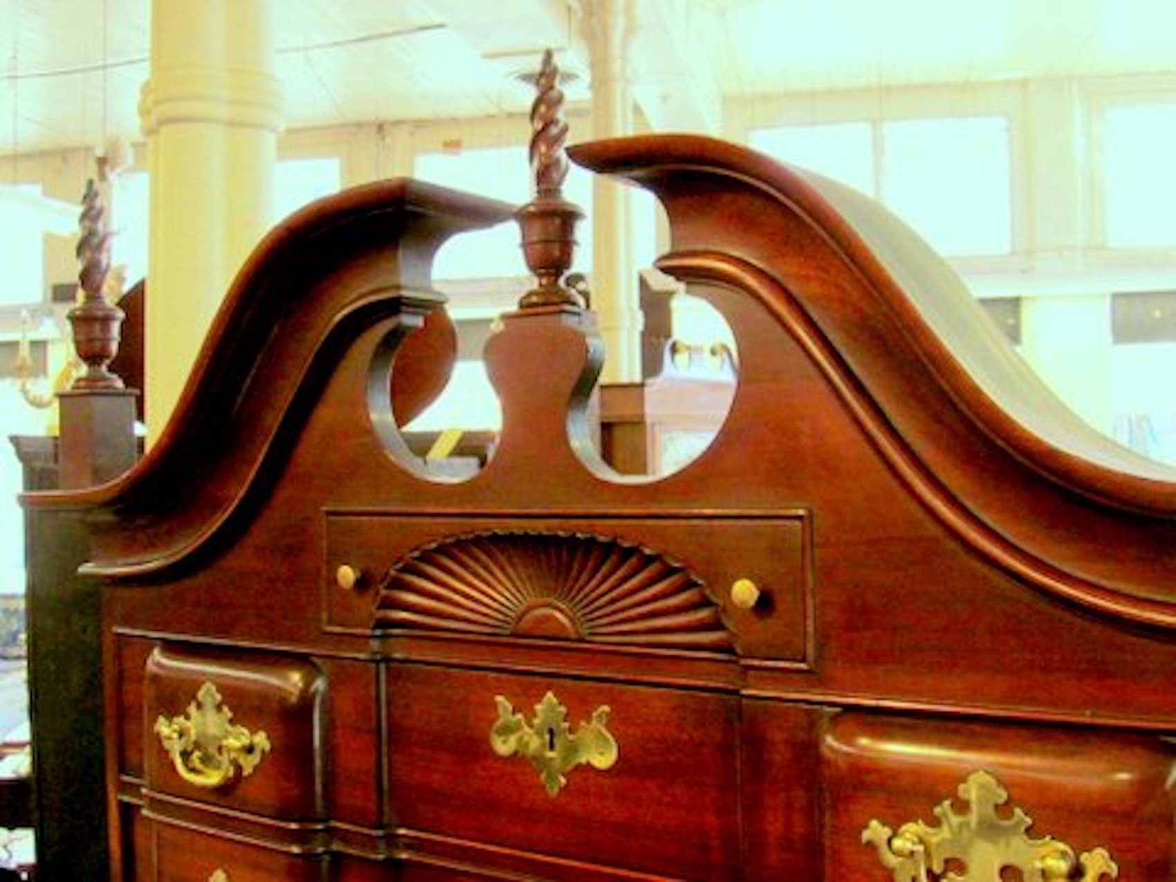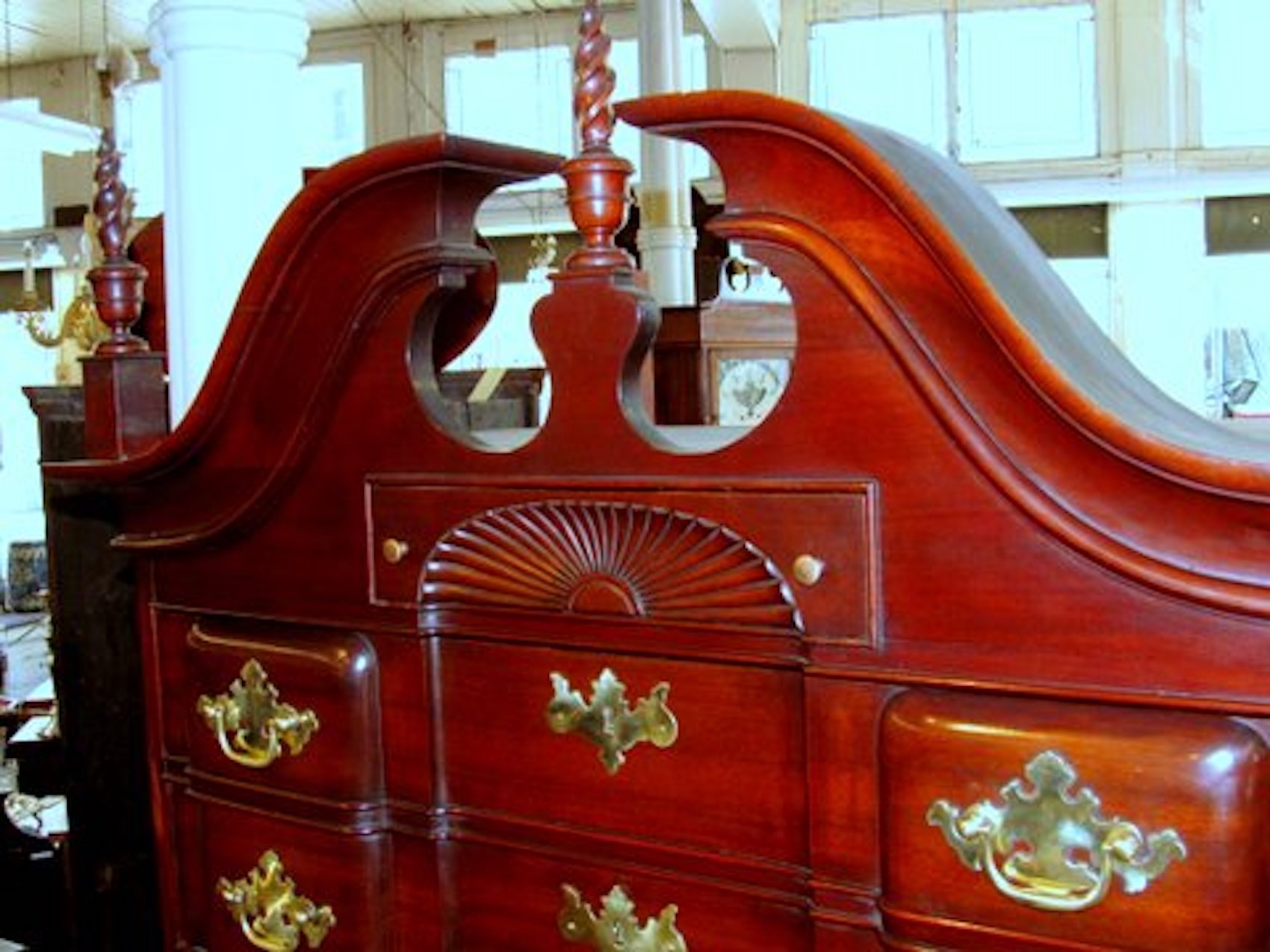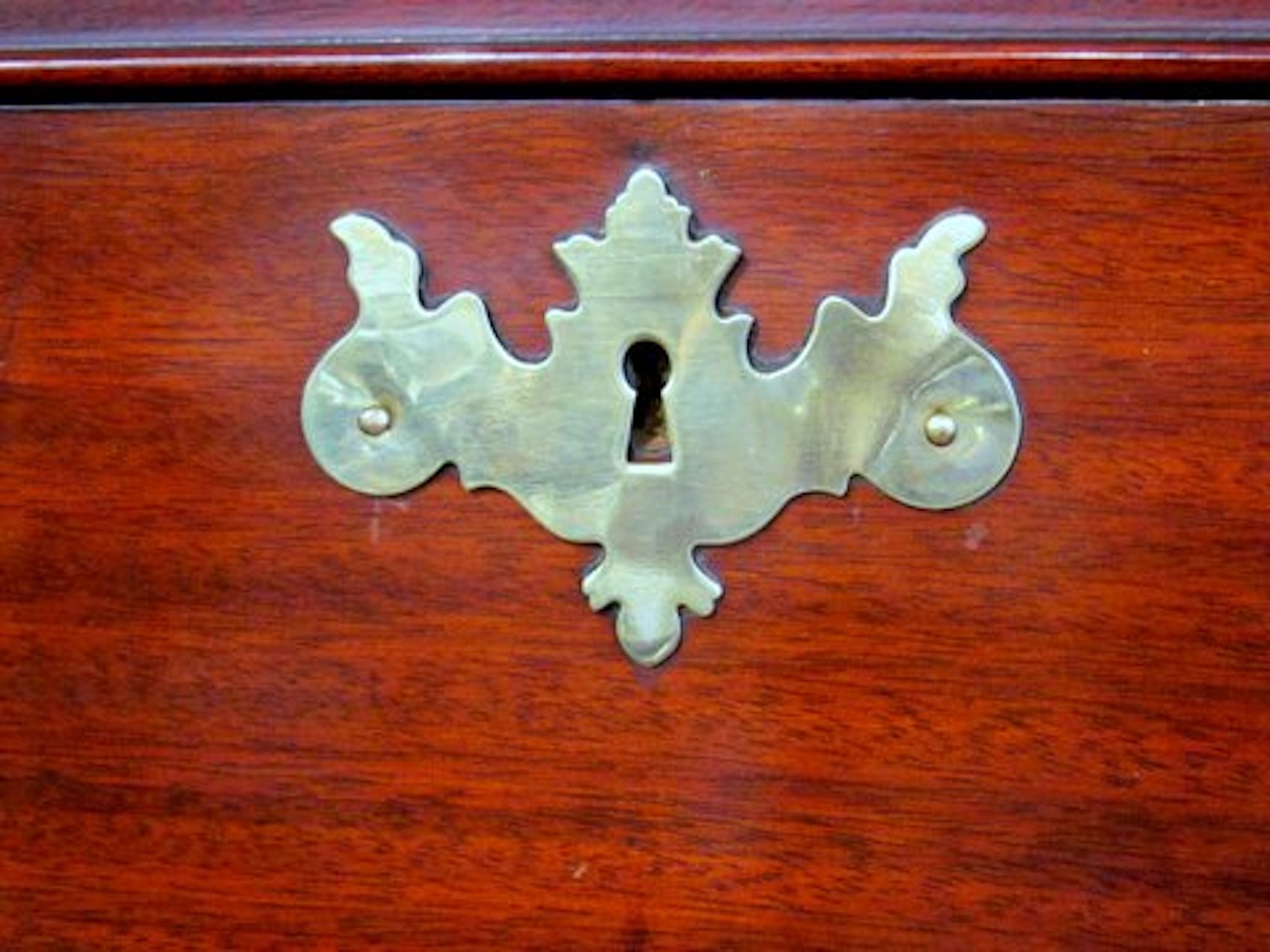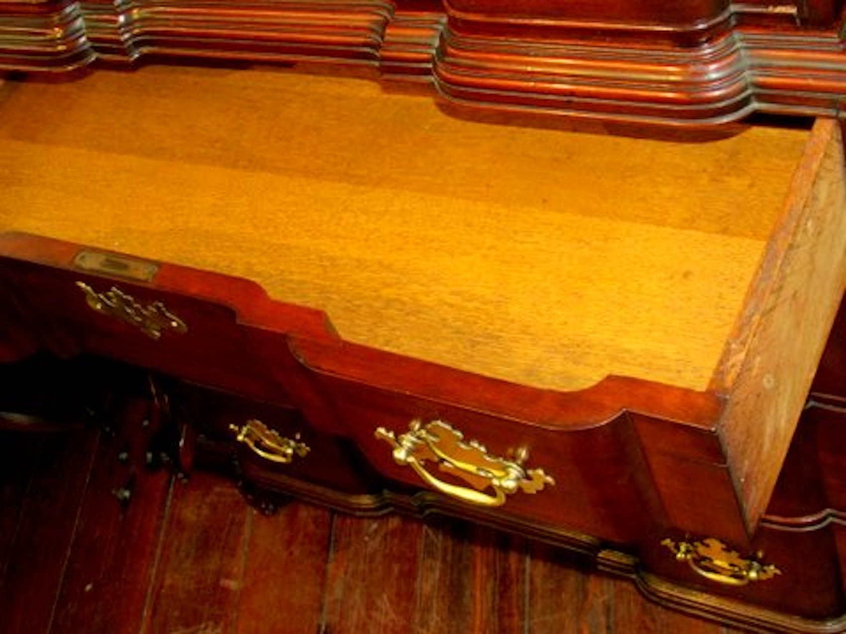 Please note hand dove-tailed, oak-lined drawers and original “Willow” or Chippendale Style Brasses. Also, hand carved concave shell in upper drawer.