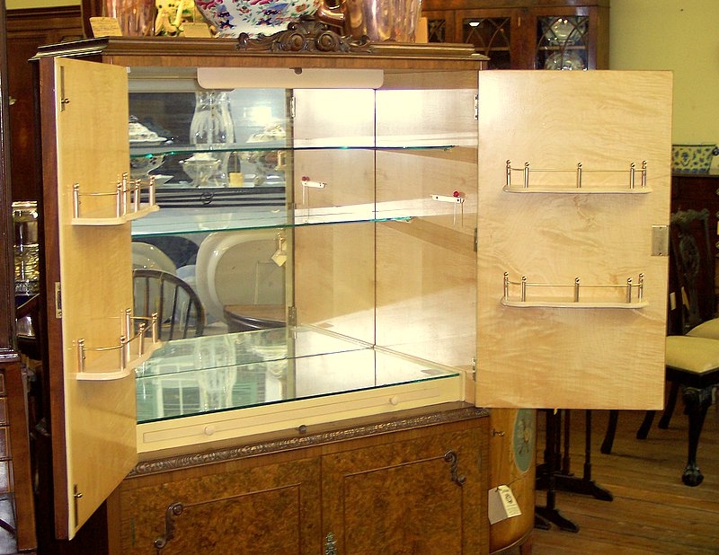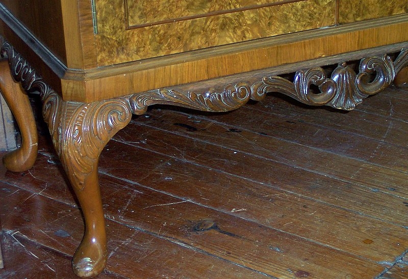 Exceptional Quality Old English Bookmatched Burr Walnut Queen Anne Revival Drinks Cabinet on hand carved legs with original fitted interior and period style brasses. These cabinets are fantastic old replicas of period 18th century cabinets.