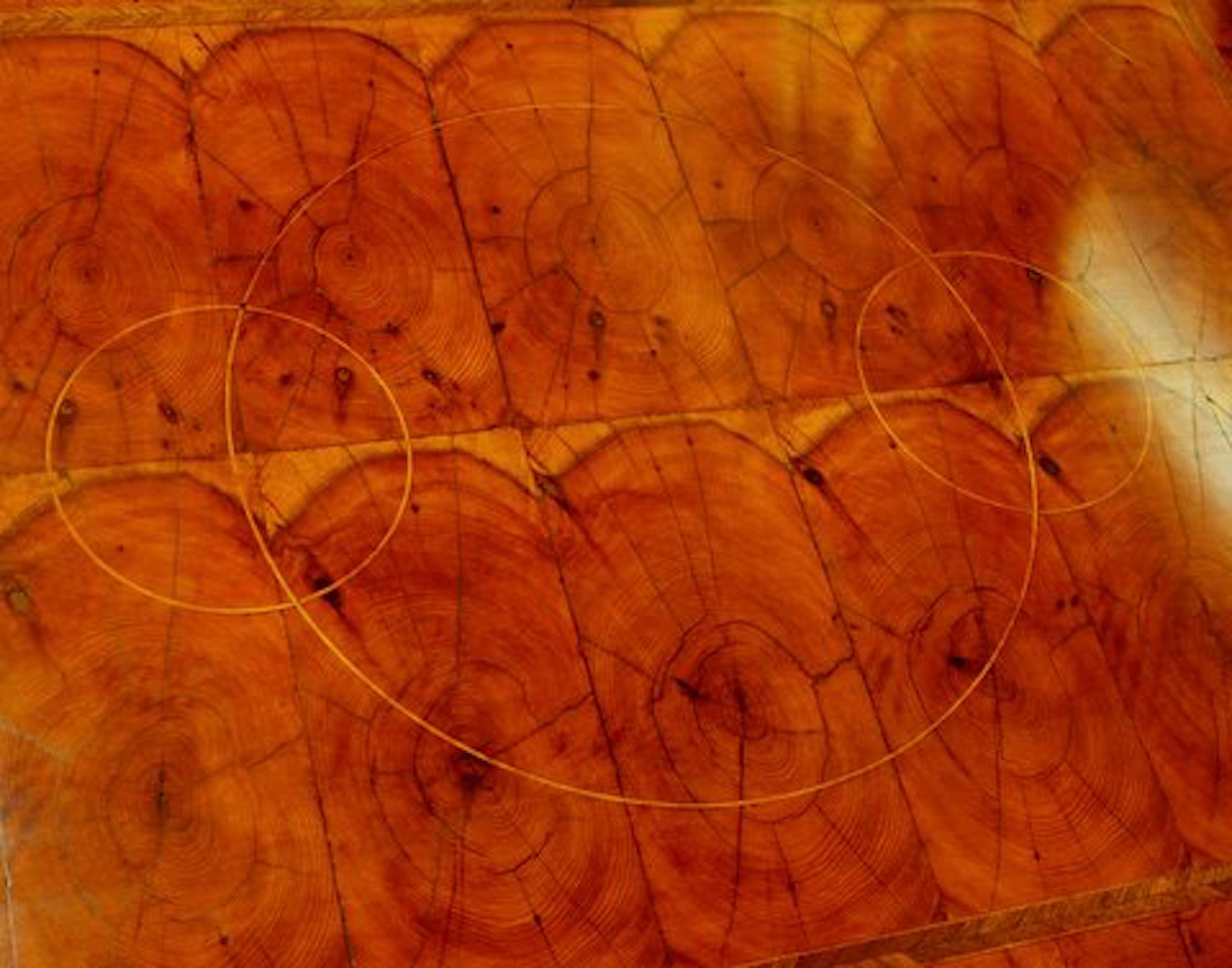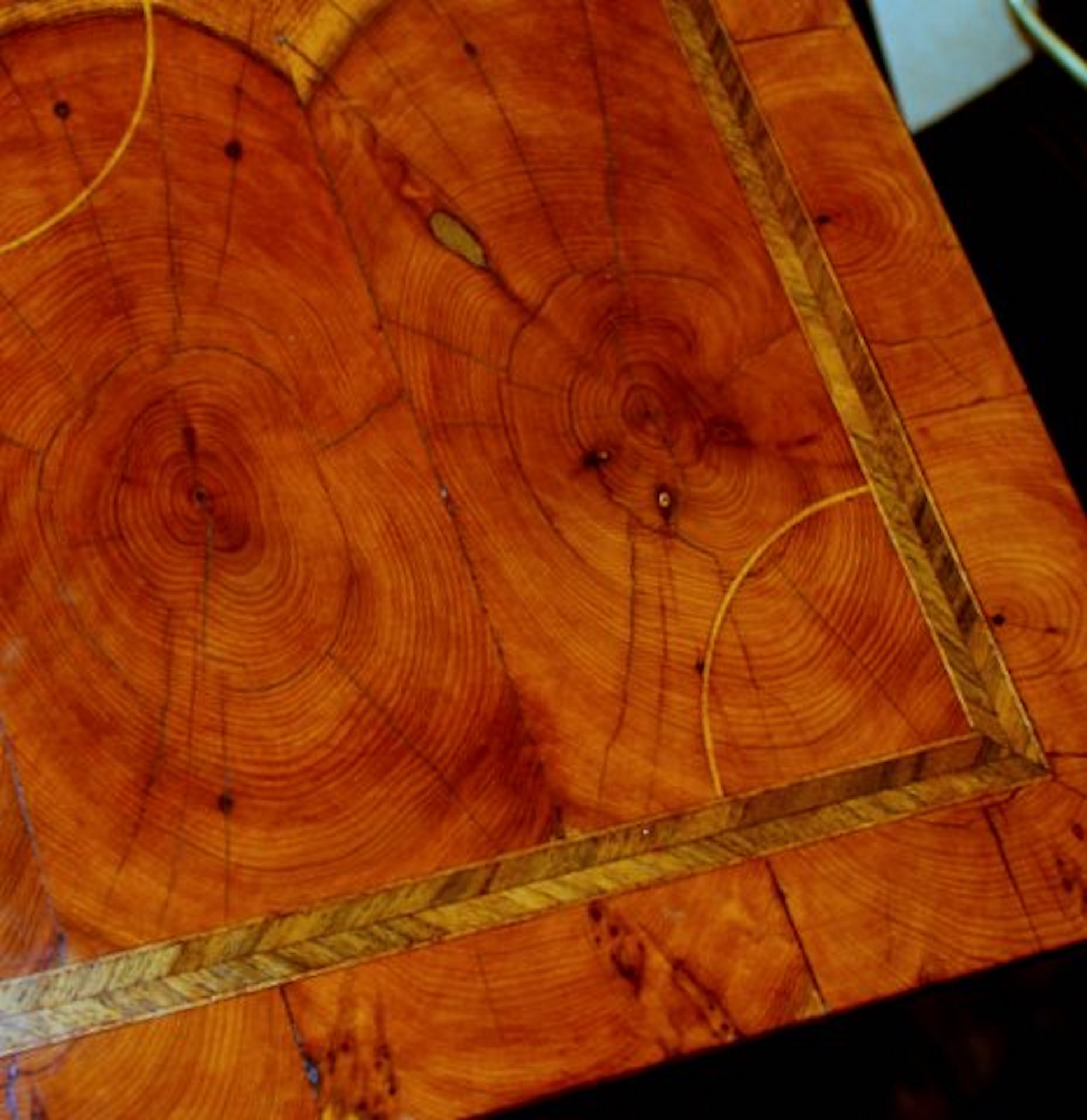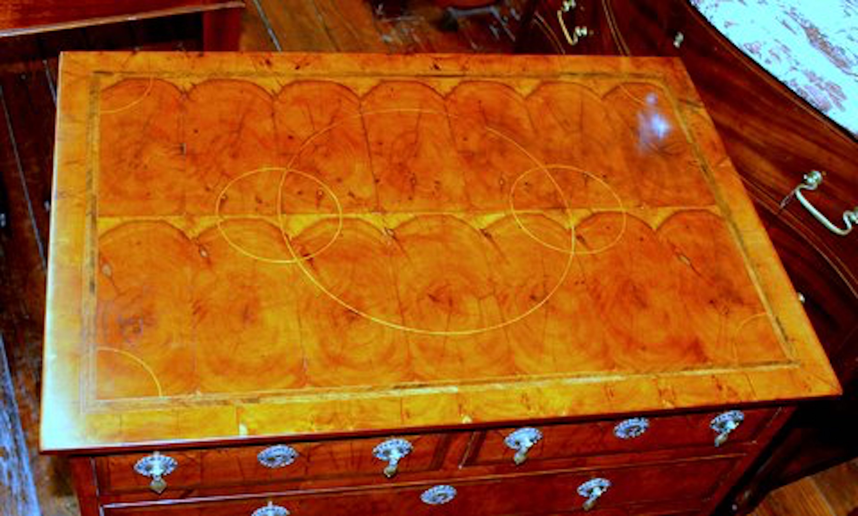 Please note handsome “concentric circle” line inlay on top, herringbone “feather banded” inlay around top and drawer perimeters and inlaid oak sides with period style brasses.