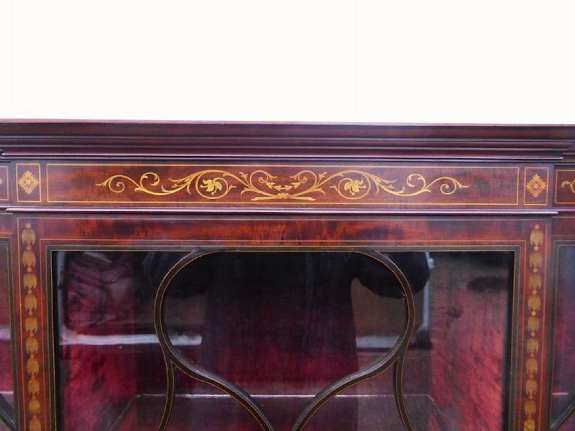 Antique English Marquetry Inlaid Figured Mahogany Chippendale Style Breakfront Display Cabinet - Image 2