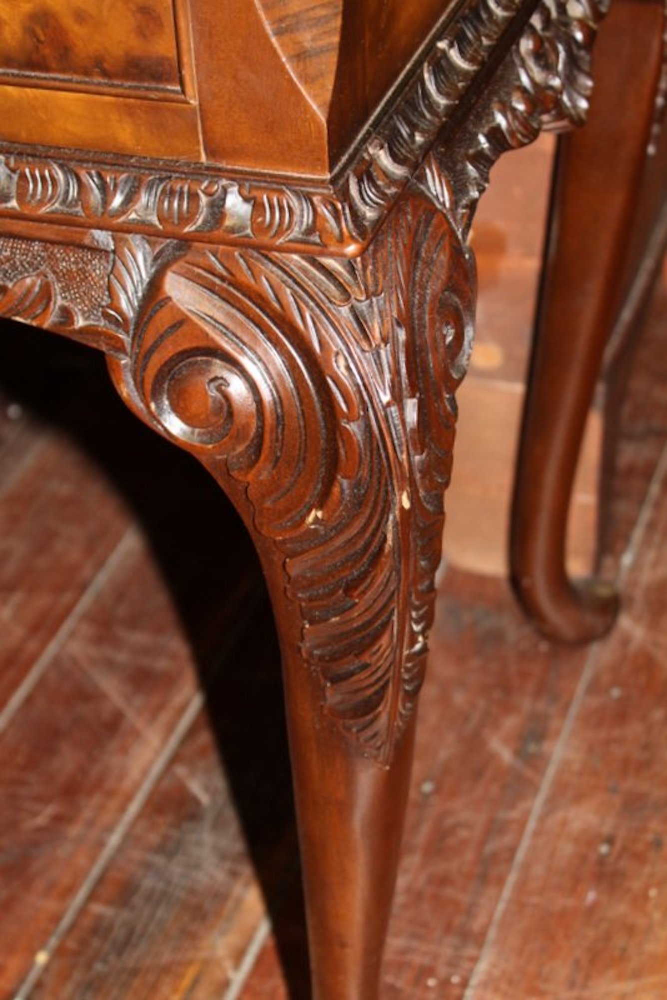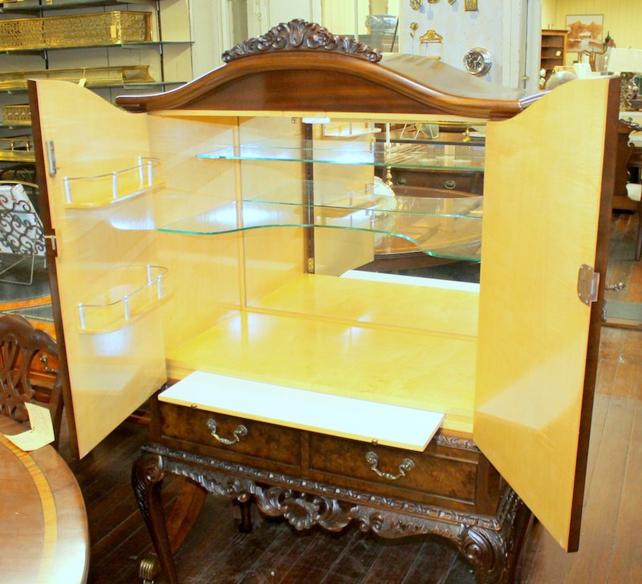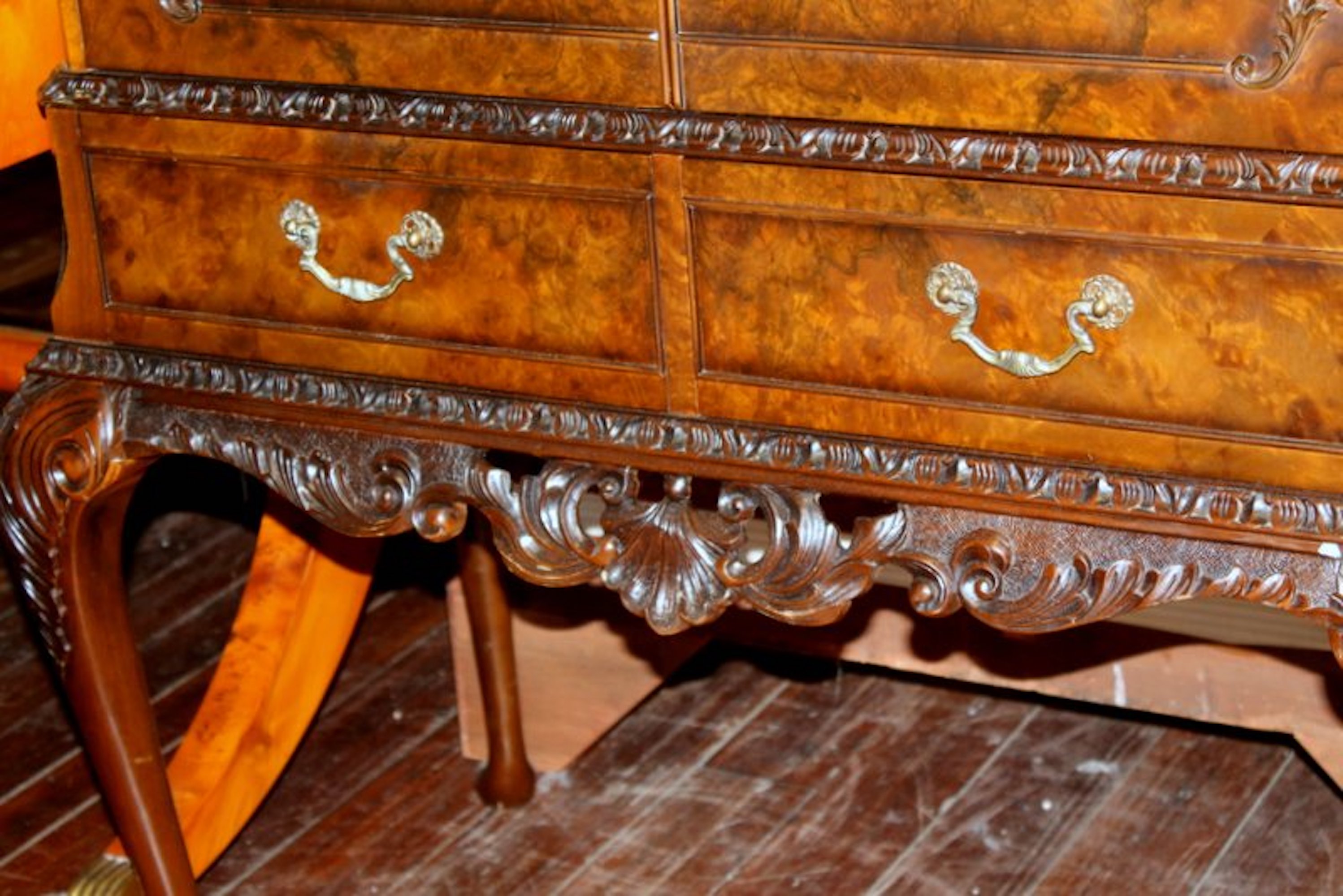 Extraordinary Quality Old English Book-matched Burr Walnut and Hand Carved Georgian Style Drinks Cabinet