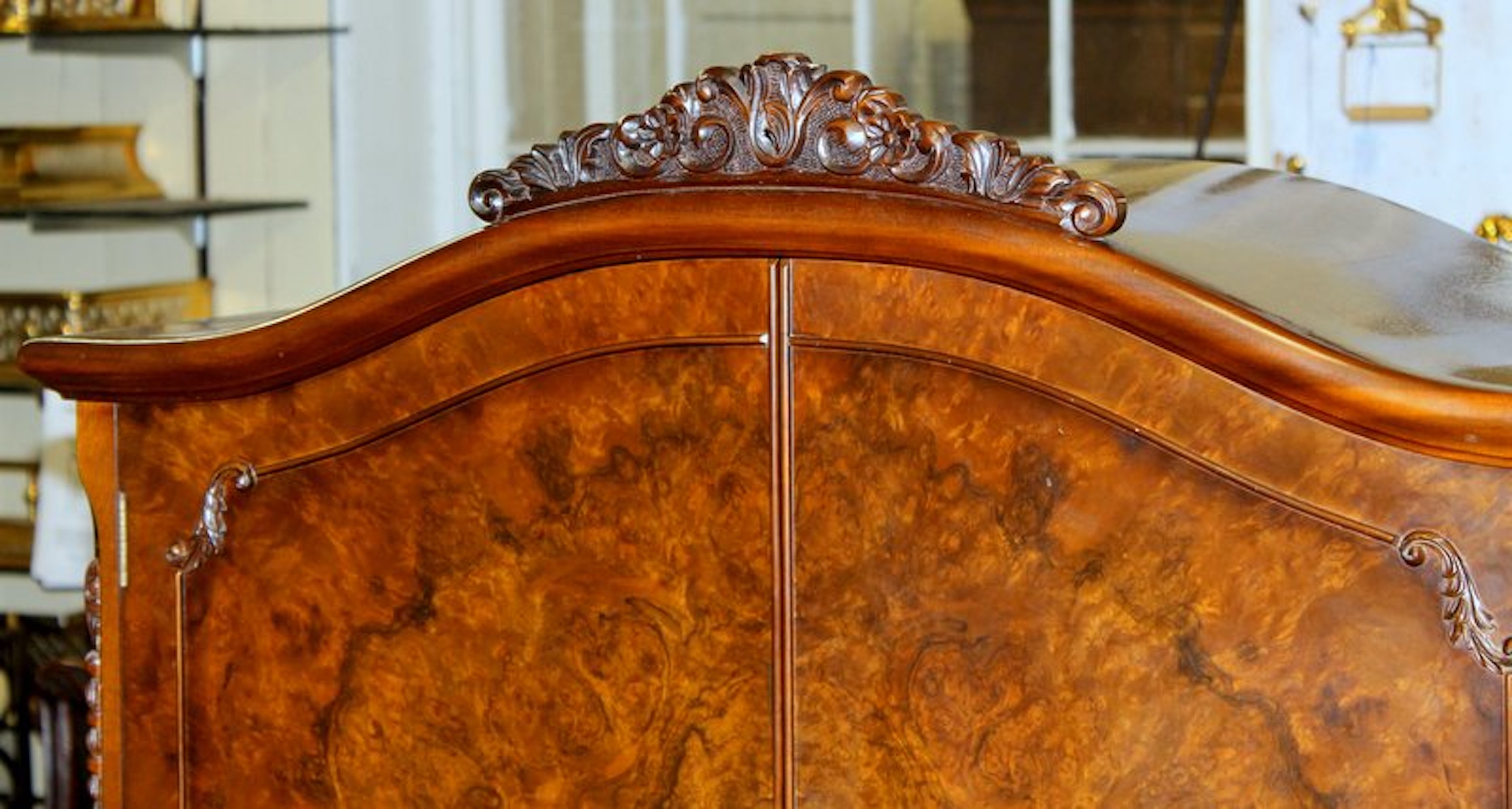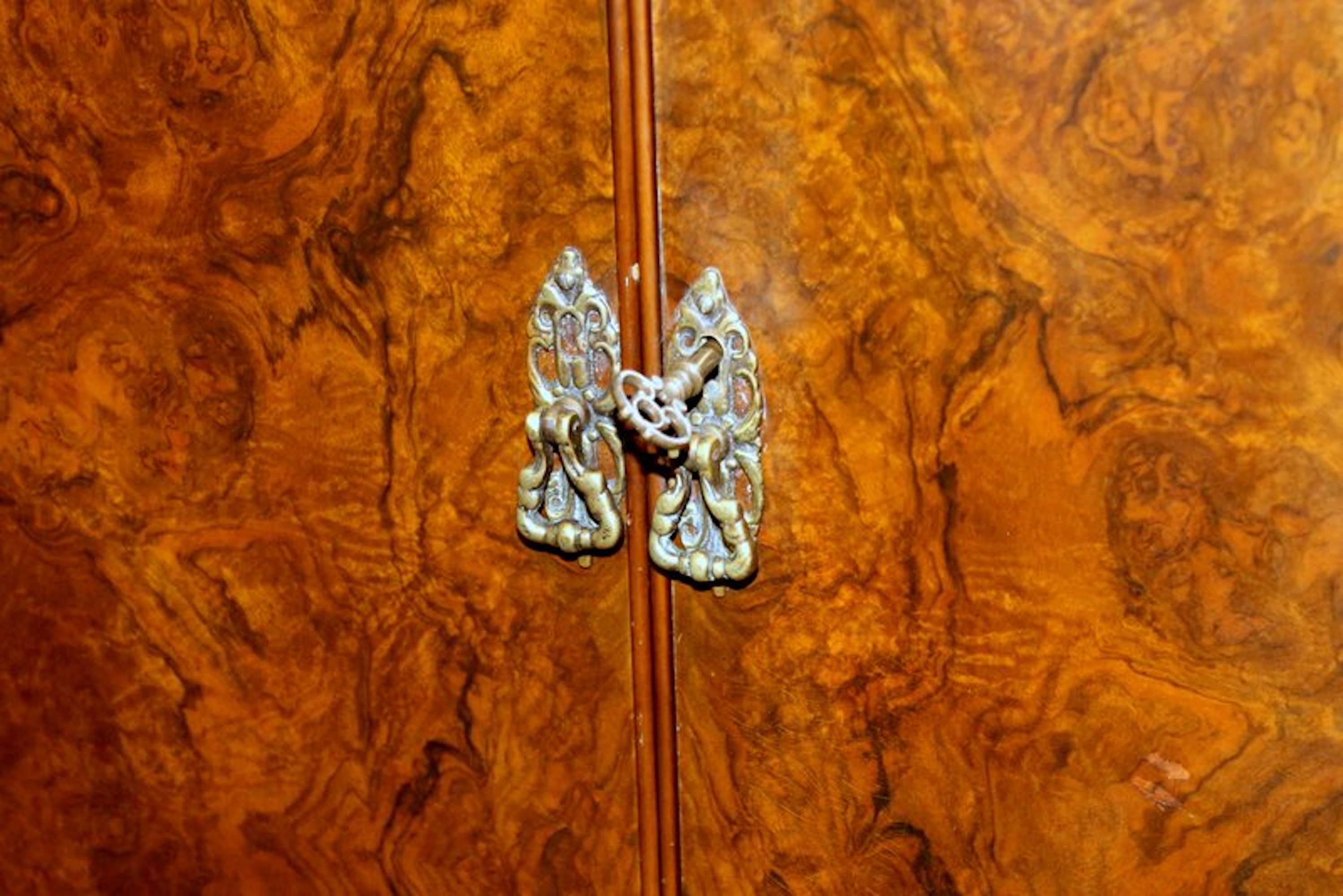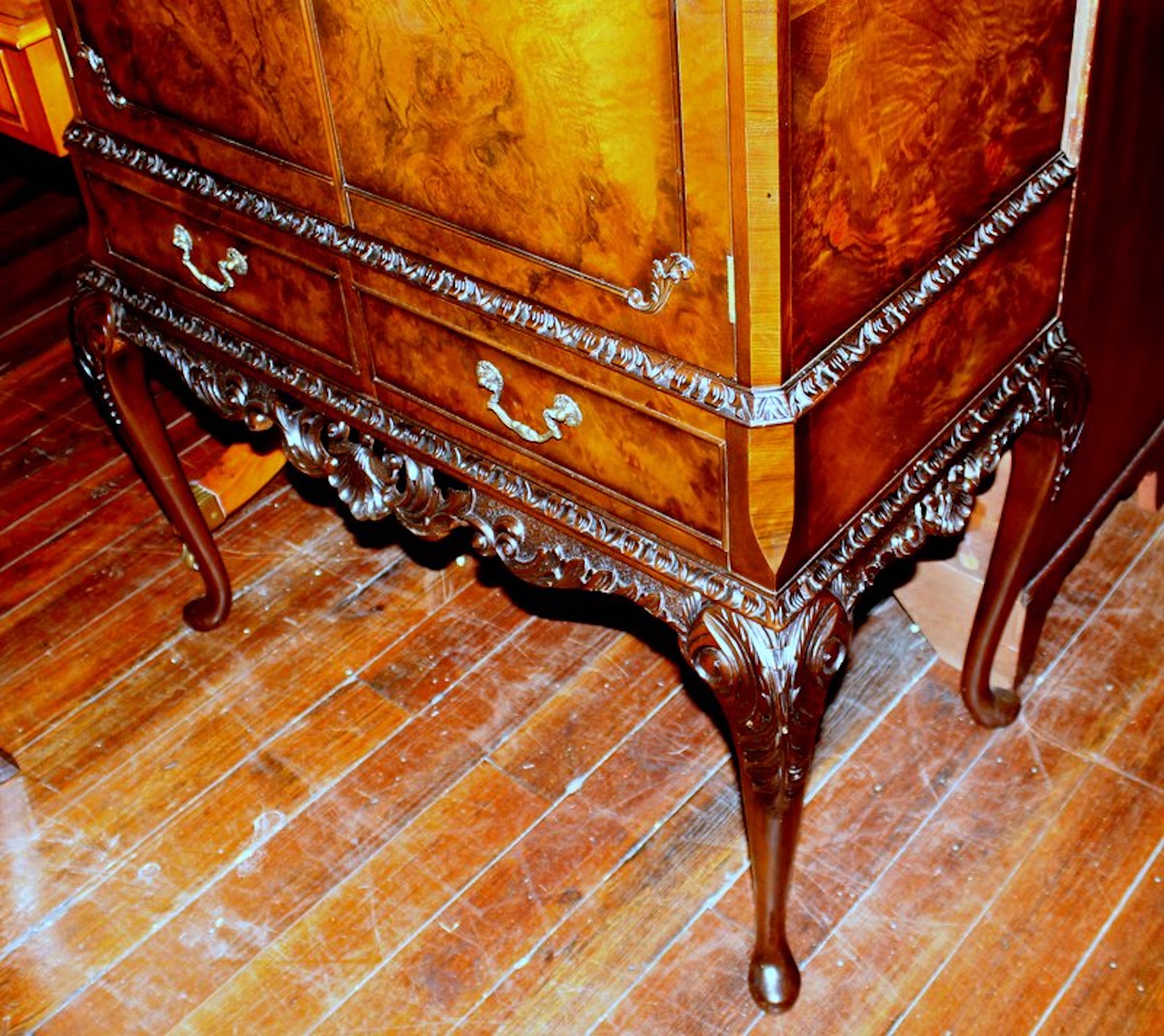 Extraordinary Quality Old English Book-matched Burr Walnut and Hand Carved Georgian Style Drinks Cabinet