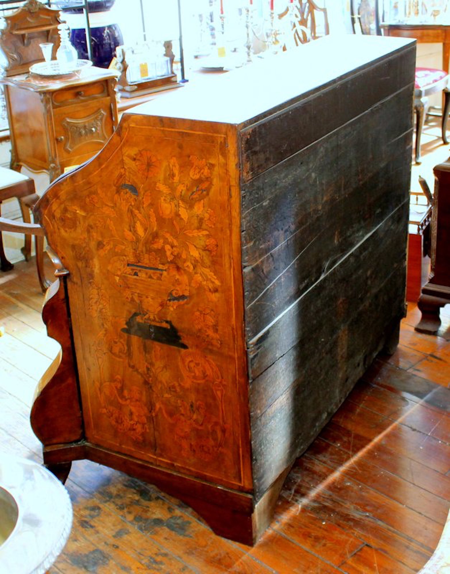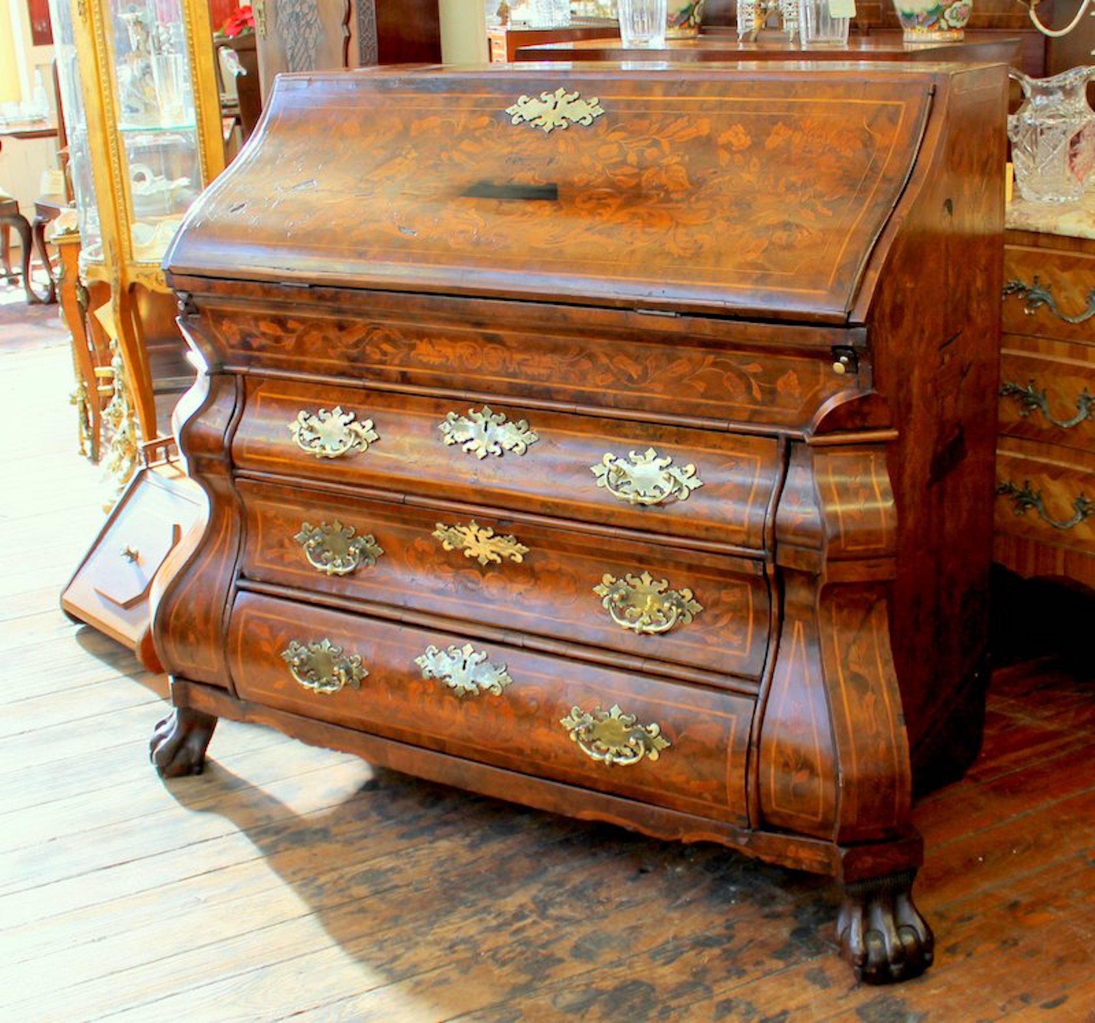 You are here: Home / All Inventory / Antique Dutch Marquetry Inlaid Burr Walnut Bombe’s Shape Slope-front Bureau