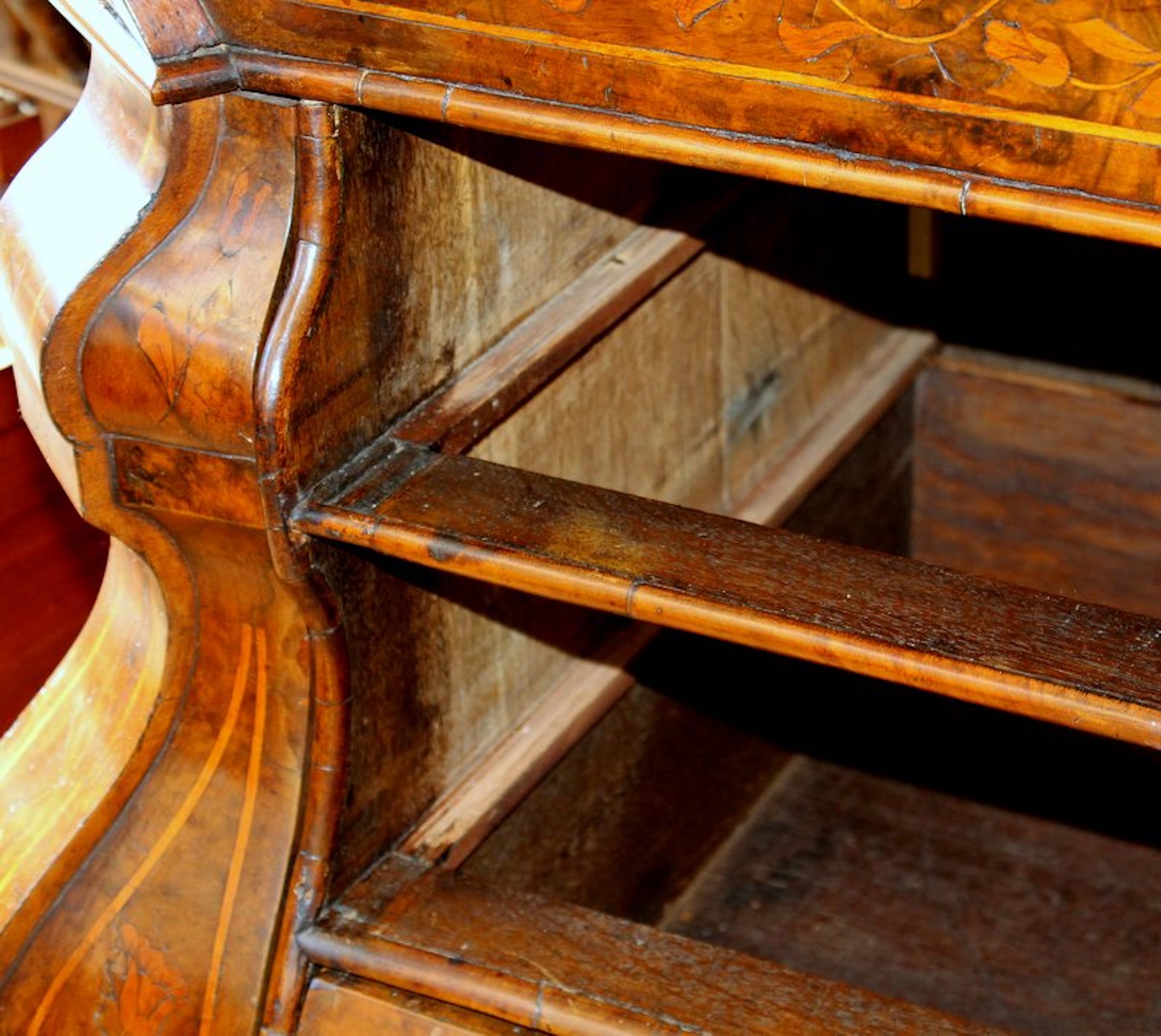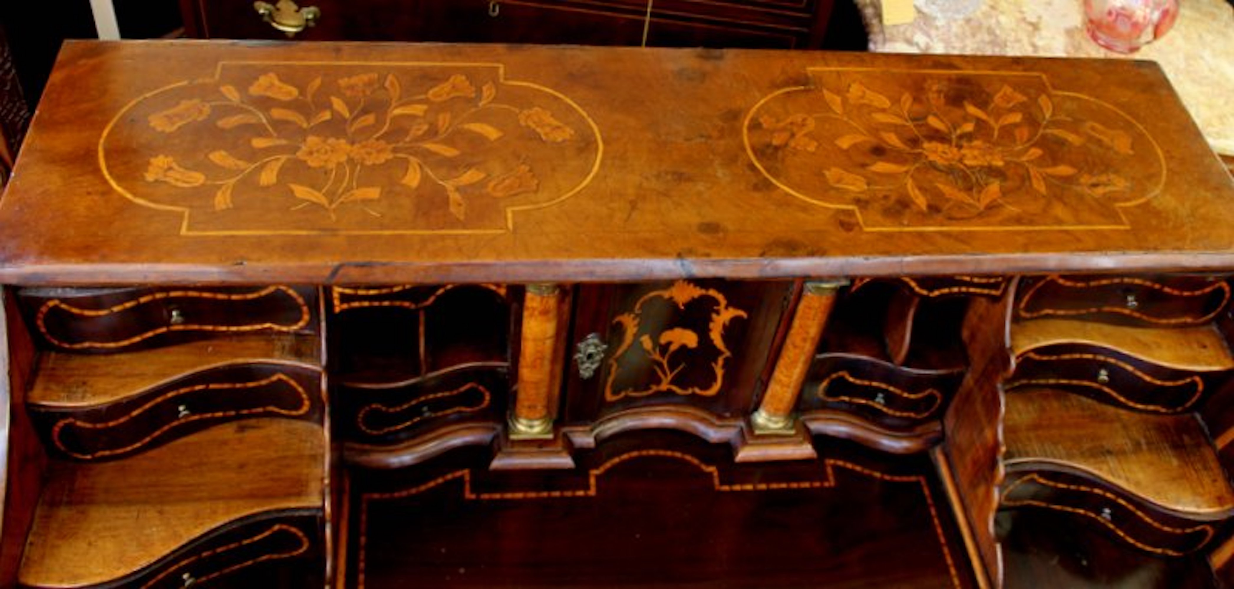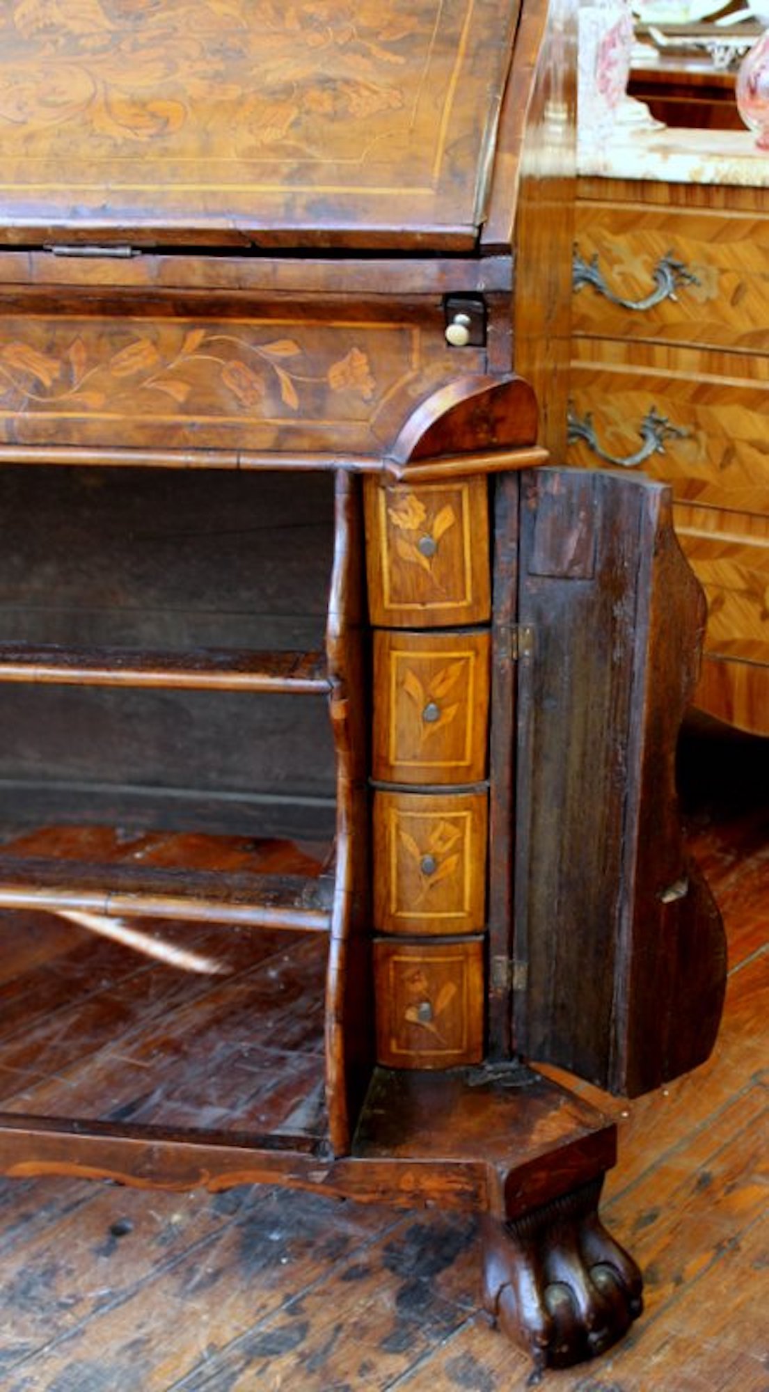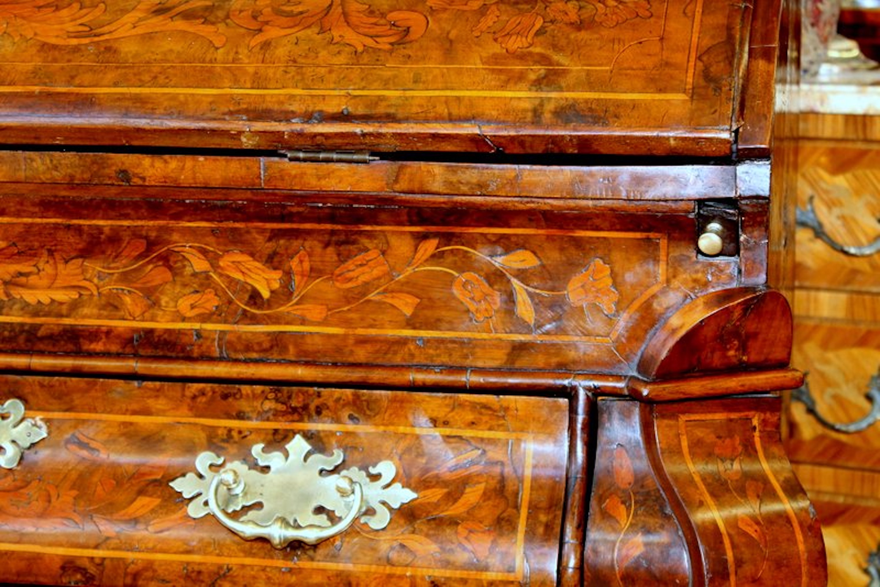 Antique Dutch Marquetry Inlaid Burr Walnut Bombe's Shape Slope-front Bureau - Image 12