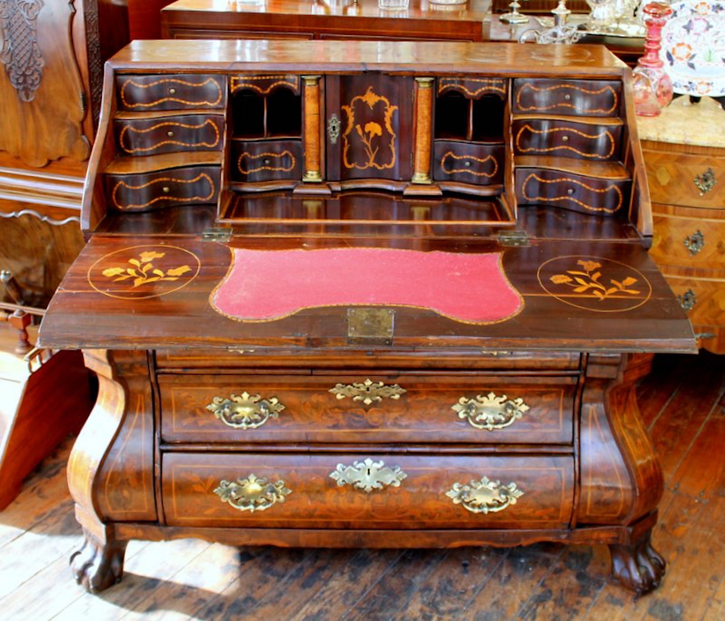 Antique Dutch Marquetry Inlaid Burr Walnut Bombe's Shape Slope-front Bureau - Image 23