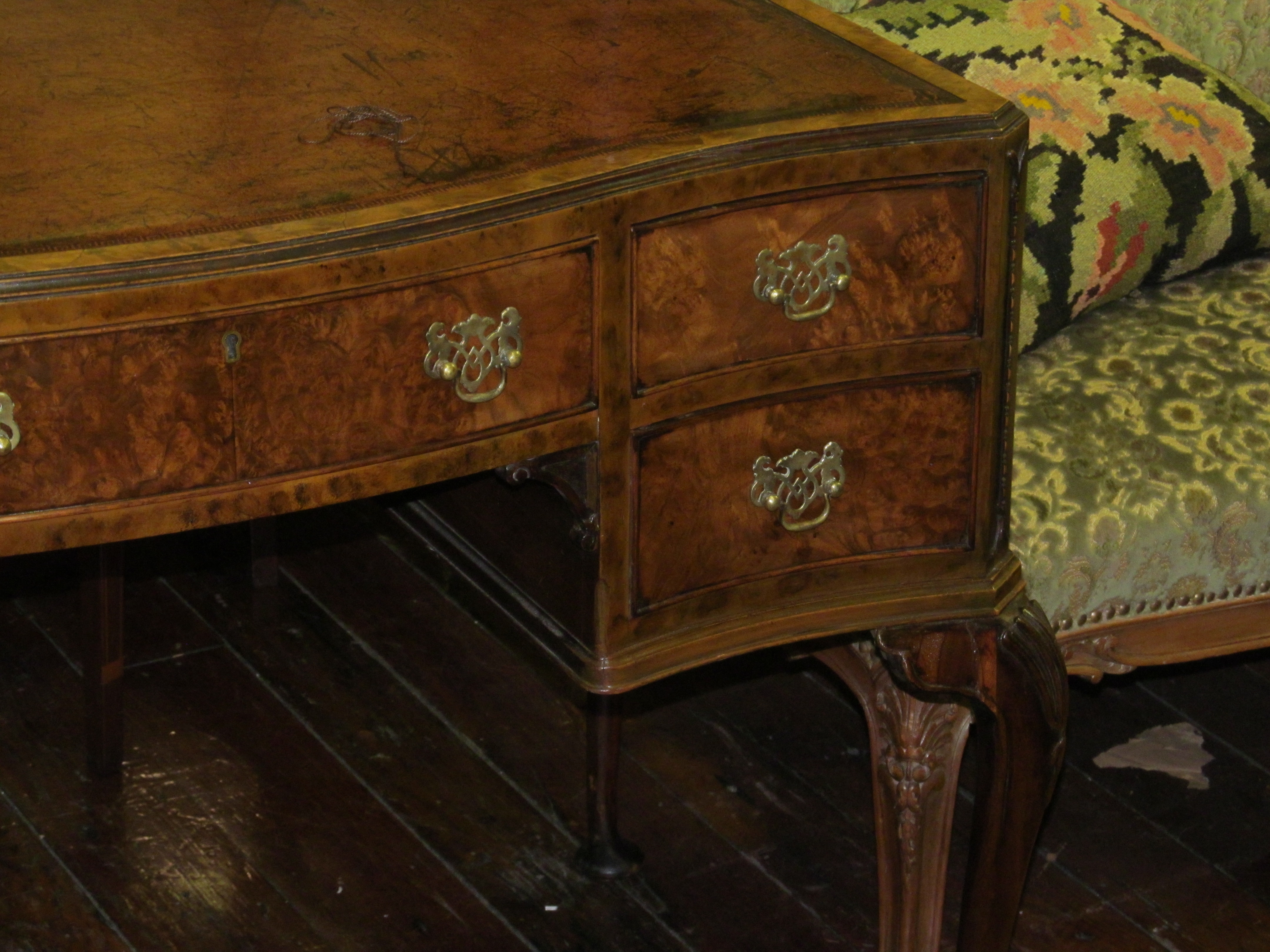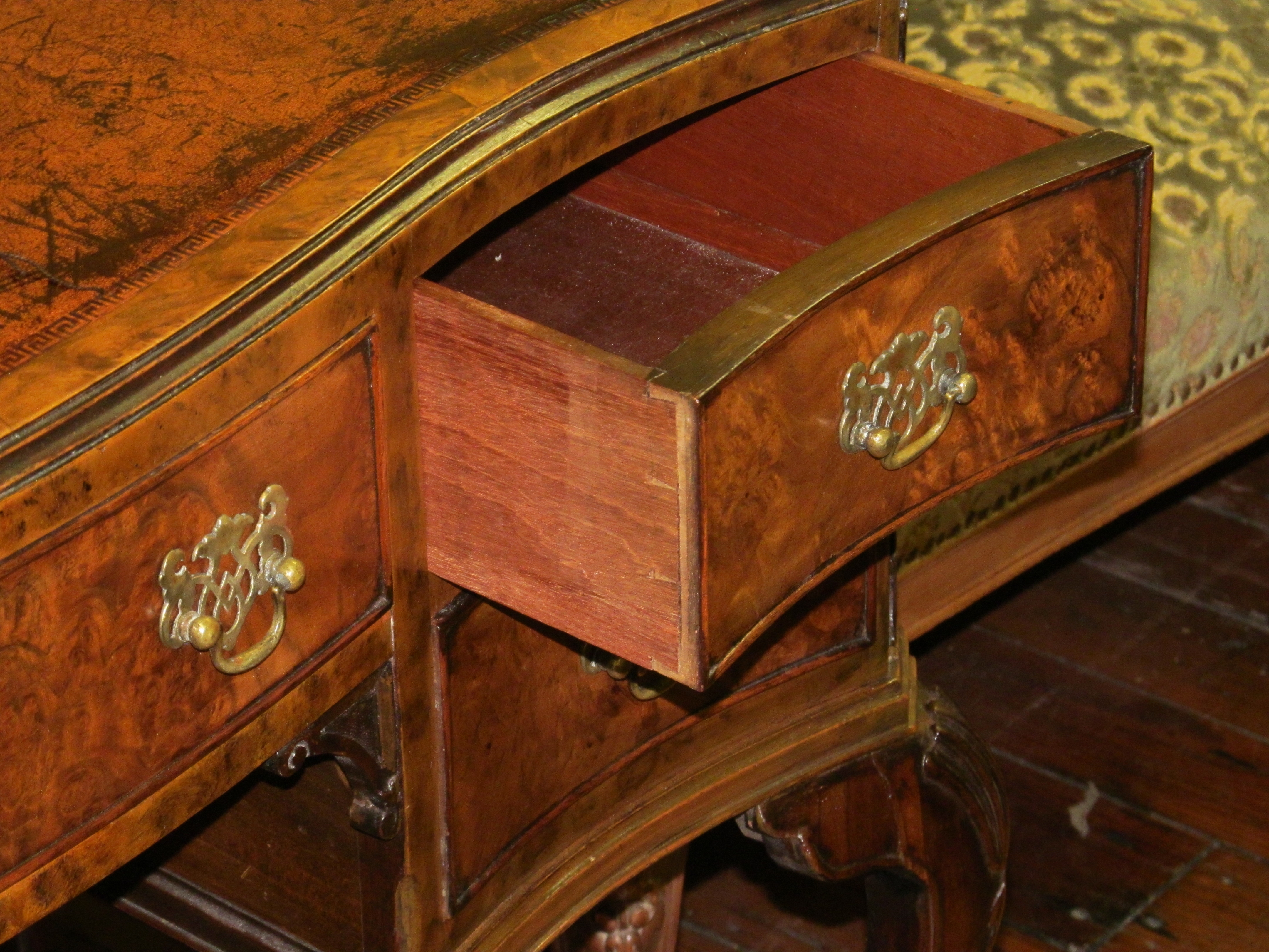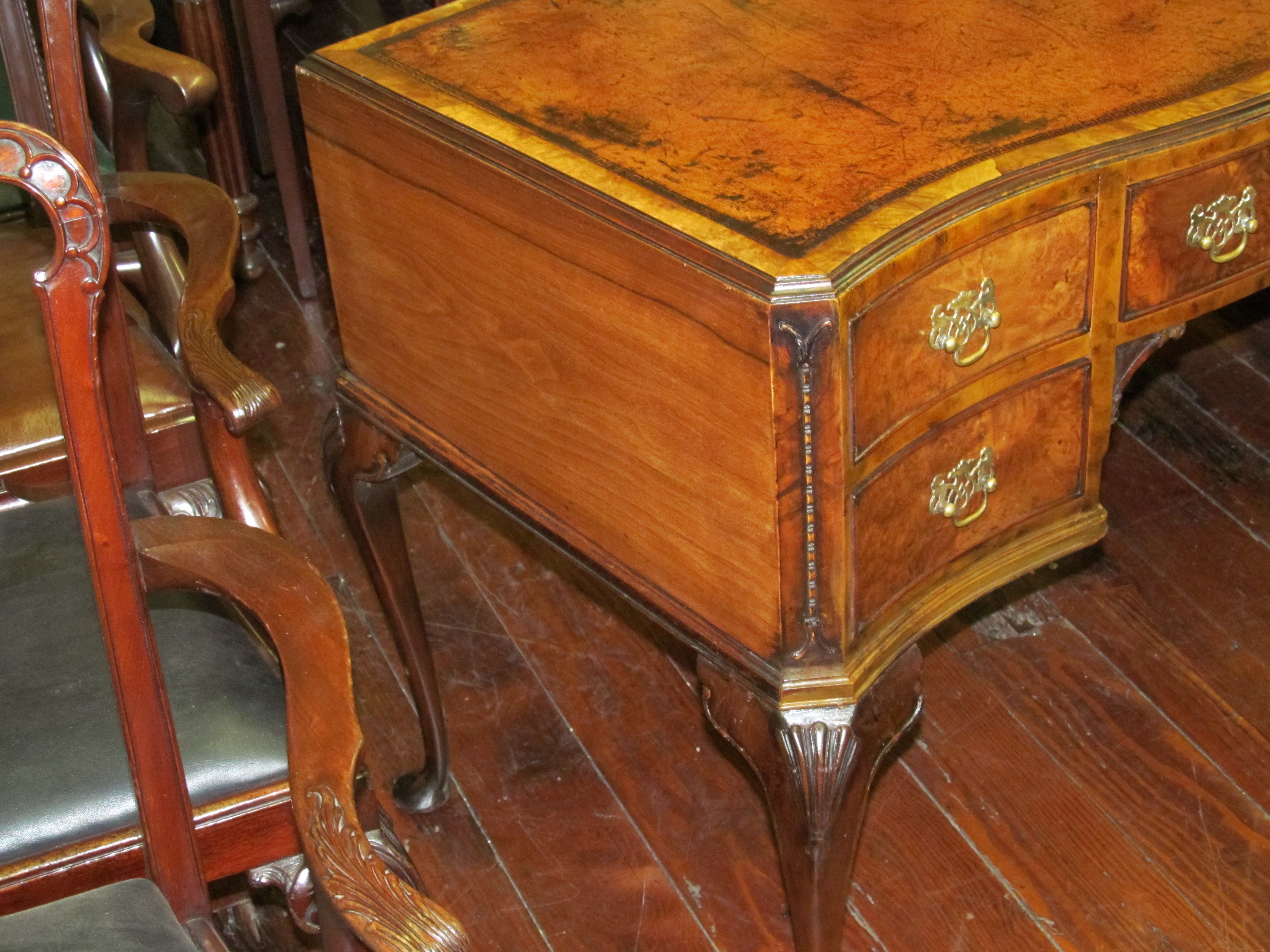 Fabulous Quality Antique English Carved Burr Walnut Queen Anne Style Serpentine Desk with tooled leather.