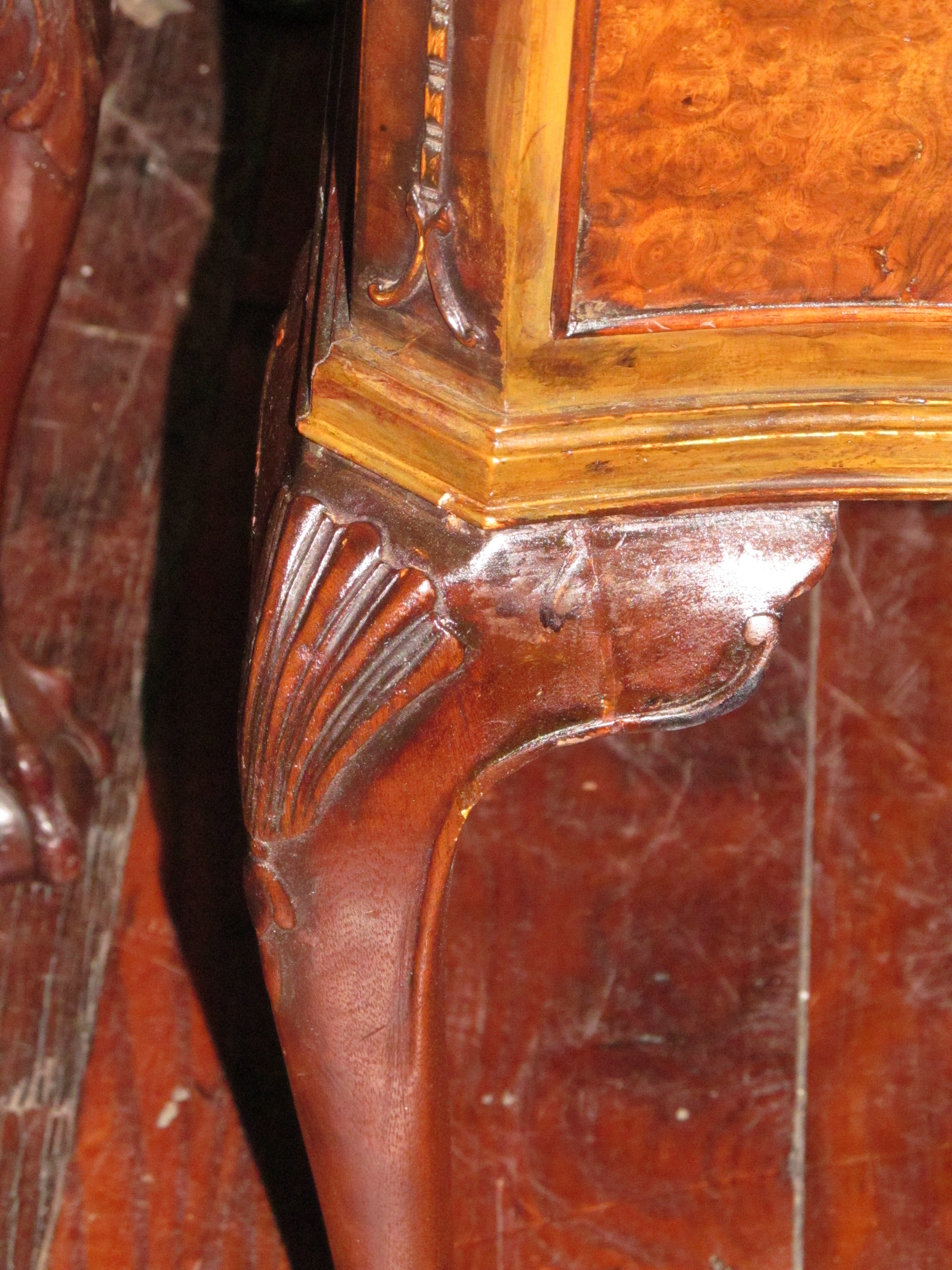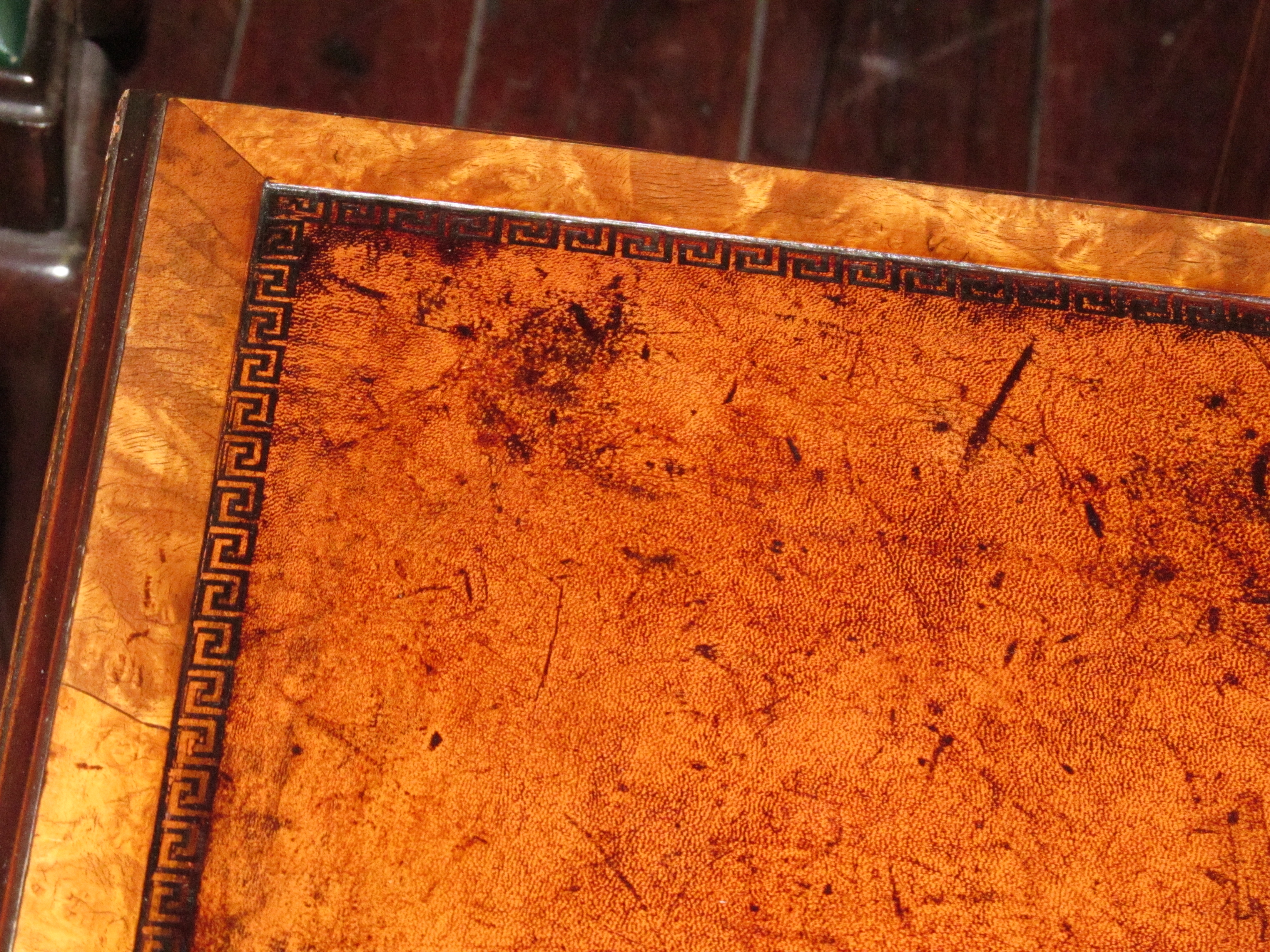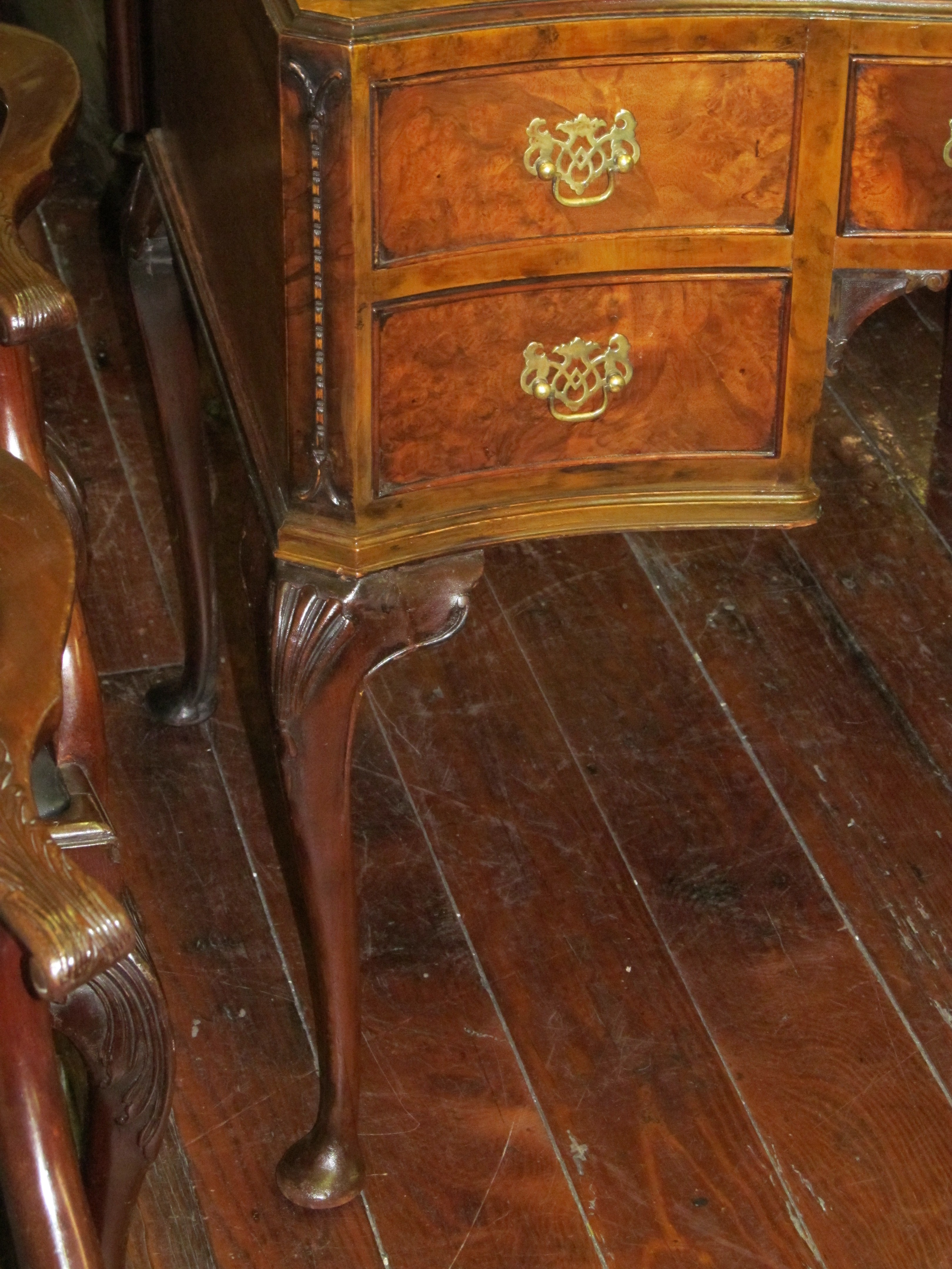 Fabulous Quality Antique English Carved Burr Walnut Queen Anne Style Serpentine Desk with tooled leather.